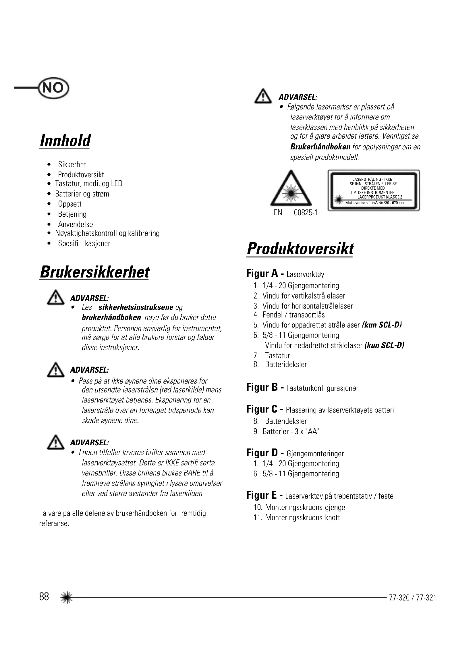 - Følgende lasermerker er plassert på laserverktøyet for å informere om laserklassen med henblikk på sikkerheten og for å gjøre arbeidet lettere. Vennligst se Brukerhåndboken for opplysninger om en spesiell produktmodell. NO89 77-320 / 77-321 Figur F - Pendel / Stillinger transportlås Figur G - Lasermodi Figur H - Puls-modus Figur J - Manuell-modus Figur K - Vaterstråle nøyaktighet Figur L - Horisontalstråle nøyaktighet Figur M - Vertiktalstråle nøyaktighet Figur N - Nøyaktighet av oppadrettet og nedadrettet stråle Tastatur, modi, og LED Tastaturer (Se fi gur