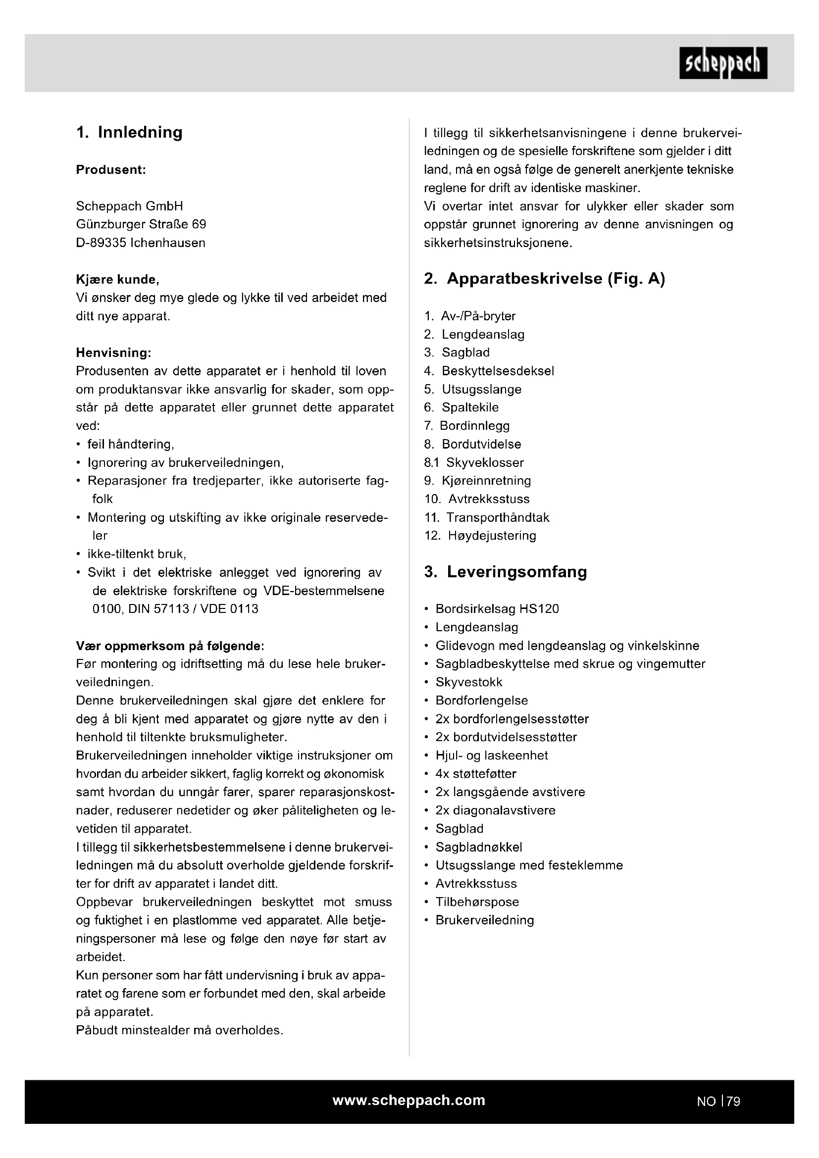 - Svikt i det elektriske anlegget ved ignorering av de elektriske forskriftene og VDE-bestemmelsene 0100, DIN 57113 / VDE 0113 Vær oppmerksom på følgende: Før montering og idriftsetting må du lese hele bruker- veiledningen. Denne brukerveiledningen skal gjøre det enklere for deg å bli kjent med apparatet og gjøre nytte av den i henhold til tiltenkte bruksmuligheter. Brukerveiledningen inneholder viktige instruksjoner om hvordan du arbeider sikkert, faglig korrekt og økonomisk samt hvordan du unngår farer, sparer reparasjonskost- nader, reduserer nedetider og øker påliteligheten og le- vetiden til apparatet. I tillegg til sikkerhetsbestemmelsene i denne brukervei- ledningen må du absolutt overholde gjeldende forskrif- ter for drift av apparatet i landet ditt. Oppbevar brukerveiledningen beskyttet mot smuss og fuktighet i en plastlomme ved apparatet. Alle betje- ningspersoner må lese og følge den nøye før start av arbeidet. Kun personer som har fått undervisning i bruk av appa- ratet og farene som er forbundet med den, skal arbeide på apparatet. Påbudt minstealder må overholdes.www.scheppach.com
