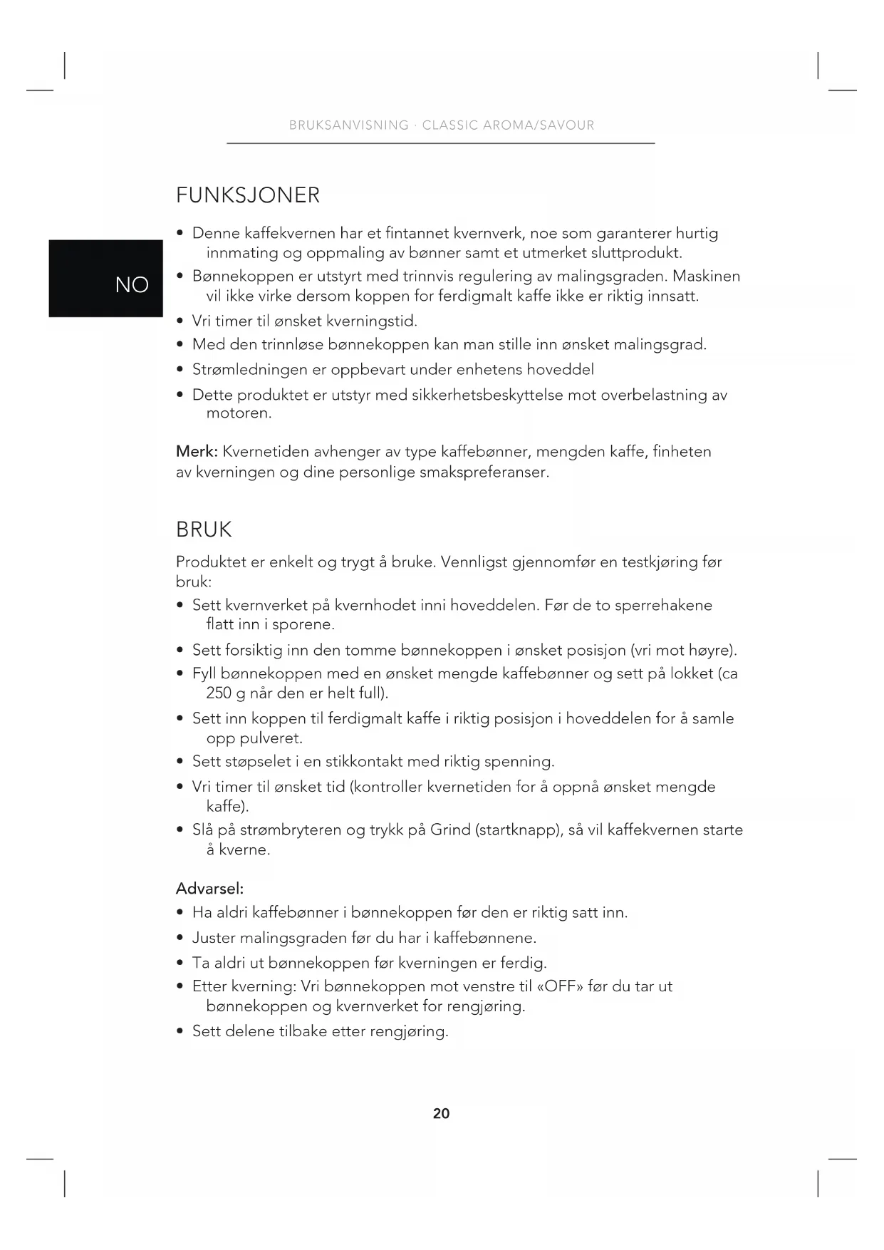 - Dette produktet er utstyr med sikkerhetsbeskyttelse mot overbelastning av motoren. Merk: Kvernetiden avhenger av type kaffebønner, mengden kaffe, nheten av kverningen og dine personlige smakspreferanser. BRUK Produktet er enkelt og trygt å bruke. Vennligst gjennomfør en testkjøring før bruk: