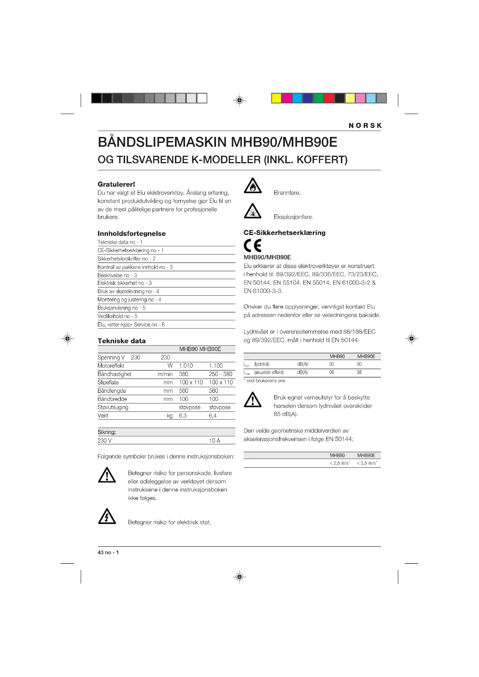 (akustisk effekt) dB(A) 98 98* ved brukerens øre Bruk egnet verneutstyr for å beskytte hørselen dersom lydnivået overskrider 85 dB(A). Den veide geometriske middelverdien av akselerasjonsfrekvensen i følge EN 50144: MHB90 MHB90E< 2,5 m/s < 2,5 m/s 2no - 2 44 NORSK Director Engineering and Product Development Horst Großmann Elu International, Richard-Klinger-Straße 40, D-65510, Idstein, Tyskland Sikkerhetsforskrifter Ta deg tid til å lese nøye gjennom bruksanvisningen før du begynner å bruke maskinen. Oppbevar bruksanvisningen på et lett tilgjengelig sted slik at alle som skal bruke maskinen lett kan finne den. I tillegg til nedenforstående forskrifter, må alle vernebestemmelsene til Statens Arbeidstilsyn følges når det gjelder arbeid med elektroverktøy. ADVARSEL! Ved bruk av elektroverktøy må disse grunnleggende sikkerhetsforskrifter følges for å redusere risikoen for elektrisk støt, personskade og brann. 1 Bruk hørselsvern Støynivået ved bearbeiding av forskjellige materialer kan variere, og i blant kan nivået overstige 85 dB(A). For å beskytte deg selv bør du alltid bruke hørselsvern. 2 Hold arbeidsområdet rent og ryddig En uryddig arbeidsplass innbyr til skader. 3 Tenk på arbeidsmiljøet Utsett ikke elektroverktøy for regn. Ikke bruk det på fuktige eller våte steder. Sørg for god belysning over arbeidsplassen. Bruk ikke elektroverktøy i nærheten av brannfarlige væsker eller gasser. 4 Beskytt deg mot elektrisk støt Unngå kroppskontakt med jordede deler (for eksempel vannrør, komfyrer, kjøleskap o.l.). Under ekstreme arbeidsforhold (for eksempel ved høy luftfuktighet, forekomst av metallstøv o.l.) kan man øke sikkerheten ved å tilkoble en jordfeilbryter. 5 Hold barn unna Ikke la barn komme i kontakt med verktøyet eller skjøteledningen. Det skal holdes tilsyn med barn under 16 år. 6 Oppbevar elektroverktøy på et trygt sted Når maskinen ikke er i bruk, skal den oppbevares på et tørt sted, gjerne høyt oppe og innlåst, utenfor barns rekkevidde. 7 Overbelast ikke maskinen Maskinen arbeider bedre og sikrere innenfor det angitte effektområdet. 8 Bruk riktig elektroverktøy Tving ikke en maskin til å gjøre arbeid som krever kraftigere verktøy. Bruk ikke elektroverktøy til formål det ikke er ment for, som for eksempel å fjerne kvister eller kappe ved med en håndsirkelsag. 9 Kle deg riktig Ha ikke på deg løstsittende klær eller smykker. De kan sette seg fast i de bevegelige delene. Vi anbefaler gummihansker og sko som ikke glir når du arbeider utendørs. Bruk hårnett hvis du har langt hår. 10 Bruk vernebriller Bruk vernebriller for å unngå at det blåser støv inn i øynene og skader deg. Hvis det støver mye, bør du bruke ansikts- eller støvmaske. 11 Stell pent med ledningen Bær ikke maskinen i ledningen og, trekk ikke i ledningen når du skal ta støpselet ut av stikkontakten. Utsett ikke ledningen for varme, olje eller skarpe kanter. 12 Sikre arbeidsstykket Bruk tvinger eller skrustikker til å feste arbeidsstykket med. Dette er sikrere enn å bruke hånden, og du får begge hendene fri til å arbeide med. 13 Strekk deg ikke for langt Pass på at du alltid har sikkert fotfeste og balanse. 14 Vær nøye med vedlikeholdet Hold tilbehøret skarpt og rent. Følg forskriftene når det gjelder vedlikehold og skifte av tilbehør. Kontroller maskinens ledning regelmessig og få den reparert av et autorisert verksted om den skulle bli skadet. Kontroller skjøteledninger regelmessig, skift dem ut om de skulle bli skadet. Hold håndtakene tørre, rene og fri for olje og fett. 15 Trekk støpselet ut av stikkontakten Trekk alltid støpselet ut av stikkontakten når maskinen ikke er i bruk, ved vedlikehold og ved skifte av tilbehør. 16 Fjern nøkler Gjør det til vane å sjekke om nøkler og justeringsverktøy er fjernet før maskinen startes.NORSK 45 no - 3 17 Unngå at verktøyet blir slått på utilsiktet Bær ikke maskinen med fingeren på strømbryteren når den er tilkoblet strømnettet. Pass på at strømbryteren er avslått når du setter støpselet i stikkontakten. 18 Utendørs skjøteledning Utendørs må det bare brukes skjøteledning som er tillatt for utendørs bruk og merket for dette. 19 Vær oppmerksom Se på det du gjør. Bruk sunn fornuft. Bruk ikke maskinen når du er trett. 20 Sjekk skadede deler før du setter støpselet i stikkontakten Før fortsatt bruk av maskinen skal eventuelle skadede deler eller deksler kontrolleres nøye for å bringe på det rene om de fungerer riktig og utfører det de skal. Kontroller justeringen av bevegelige deler, om de sitter i klemme, om deler er brukket. Sjekk at alt er riktig montert og er slik det skal være. En del eller et deksel som er skadet, skal repareres eller skiftes ut av et autorisert verksted dersom ikke annet er angitt i bruksanvisningen. Ødelagte brytere skal repareres av et autorisert serviceverksted. Bruk ikke maskinen hvis den ikke kan slås av og på med bryteren. 21 ADVARSEL! Bruk bare tilbehør og utstyr som anbefales i bruksanvisningen og i katalogene. Bruk av annet verktøy eller tilbehør enn det som anbefales i bruksanvisningen eller i katalogene kan medføre en mulig risiko for personskade. 22 La verktøyet repareres av et autorisert Elu serviceverksted Dette elektroverktøyet er i samsvar med gjeldende sikkerhetsforskrifter. Unngå risiko: Overlat alltid reparasjon av elektriske apparater til kvalifisert servicepersonale. Sliping av maling Overhold gjeldende forskrifter for sliping av maling. Vær spesielt opmerksom på følgende: 1 Benytt, om mulig, alltid en støvsuger for støvutsugning. 2 Vær spesielt forsiktig ved sliping av som muligens inneholder bly.
