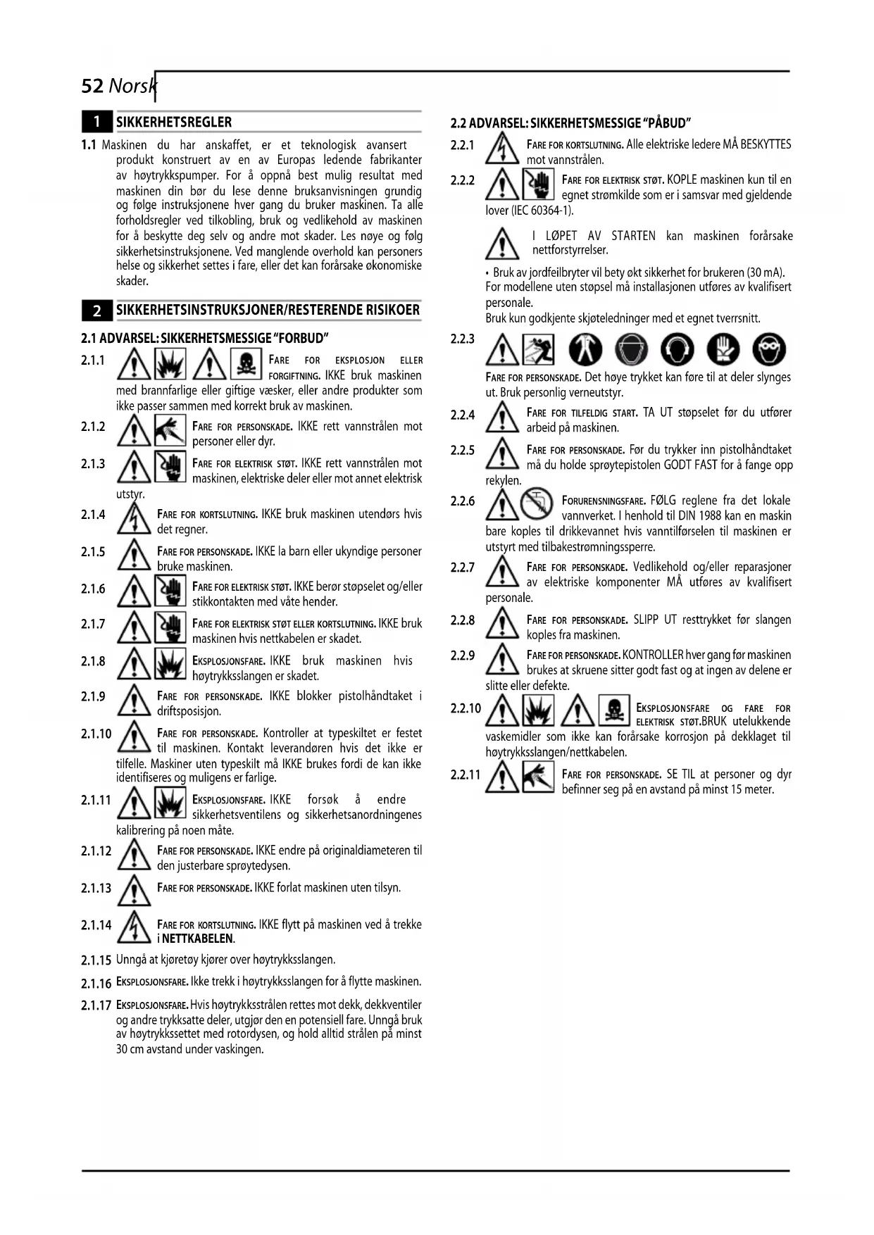 Personer uten erfaring eller personer som ikke har lest og forstått instruksjonene i håndboken må ikke bruke maskinen.Ikke bruk maskinen med brannfarlige, eksplosive eller giftige væsker.Ikke bruk maskinen i brannfarlige eller eksplosjonsfarlige omgivelser.Det er forbudt å bruke ikke originalt tilbehør eller tilbehør som ikke er spesifikt for modellen.Det er forbudt å utføre endringer på maskinen. Dersom det utføres endringer er ikke overensstemmelseserklæringen gyldig, og produ-senten heves fra ethvert ansvar.