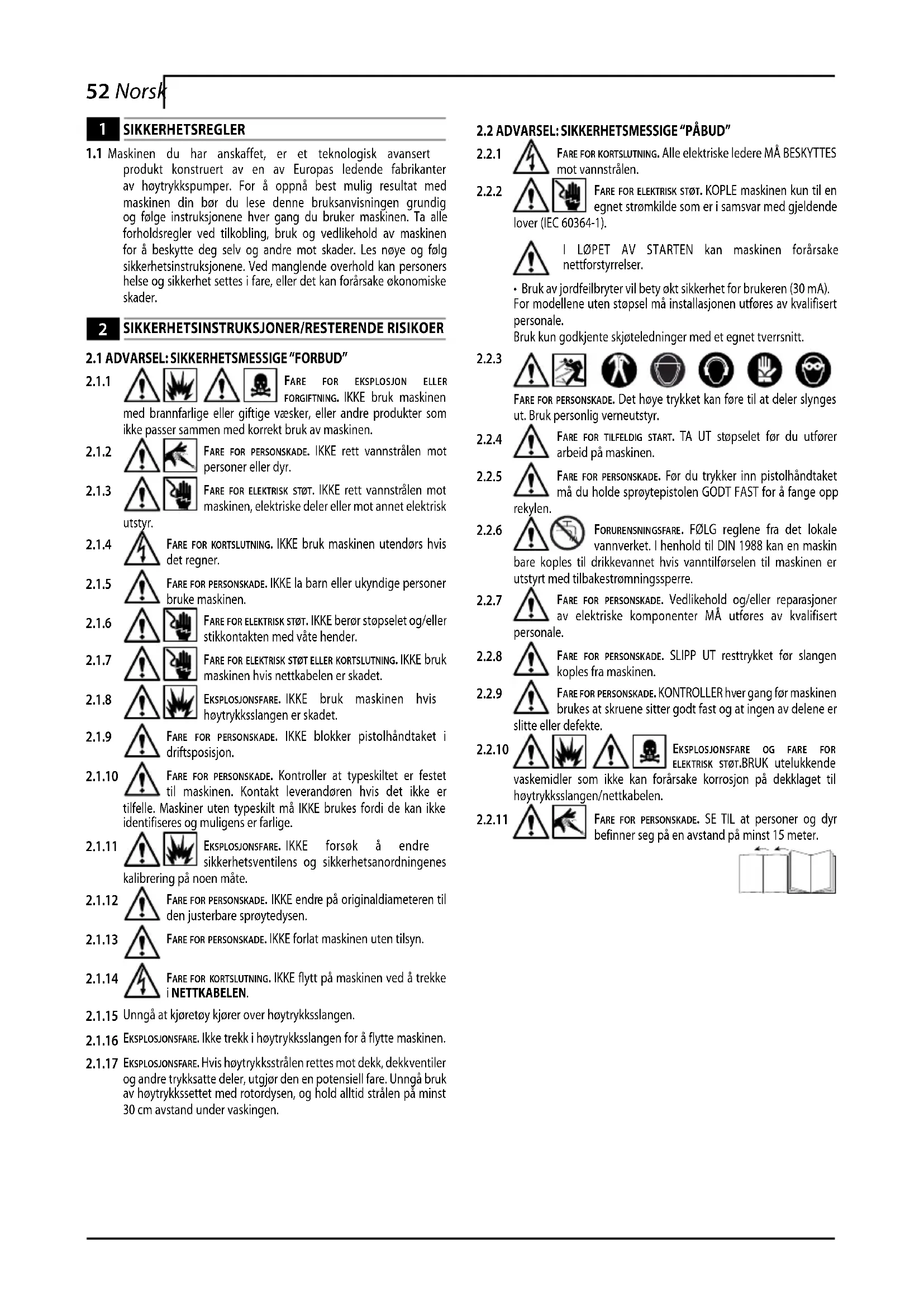 Personer uten erfaring eller personer som ikke har lest og forstått instruksjonene i håndboken må ikke bruke maskinen.Ikke bruk maskinen med brannfarlige, eksplosive eller giftige væsker.Ikke bruk maskinen i brannfarlige eller eksplosjonsfarlige omgivelser.Det er forbudt å bruke ikke originalt tilbehør eller tilbehør som ikke er spesifikt for modellen.Det er forbudt å utføre endringer på maskinen. Dersom det utføres endringer er ikke overensstemmelseserklæringen gyldig, og produ-senten heves fra ethvert ansvar.