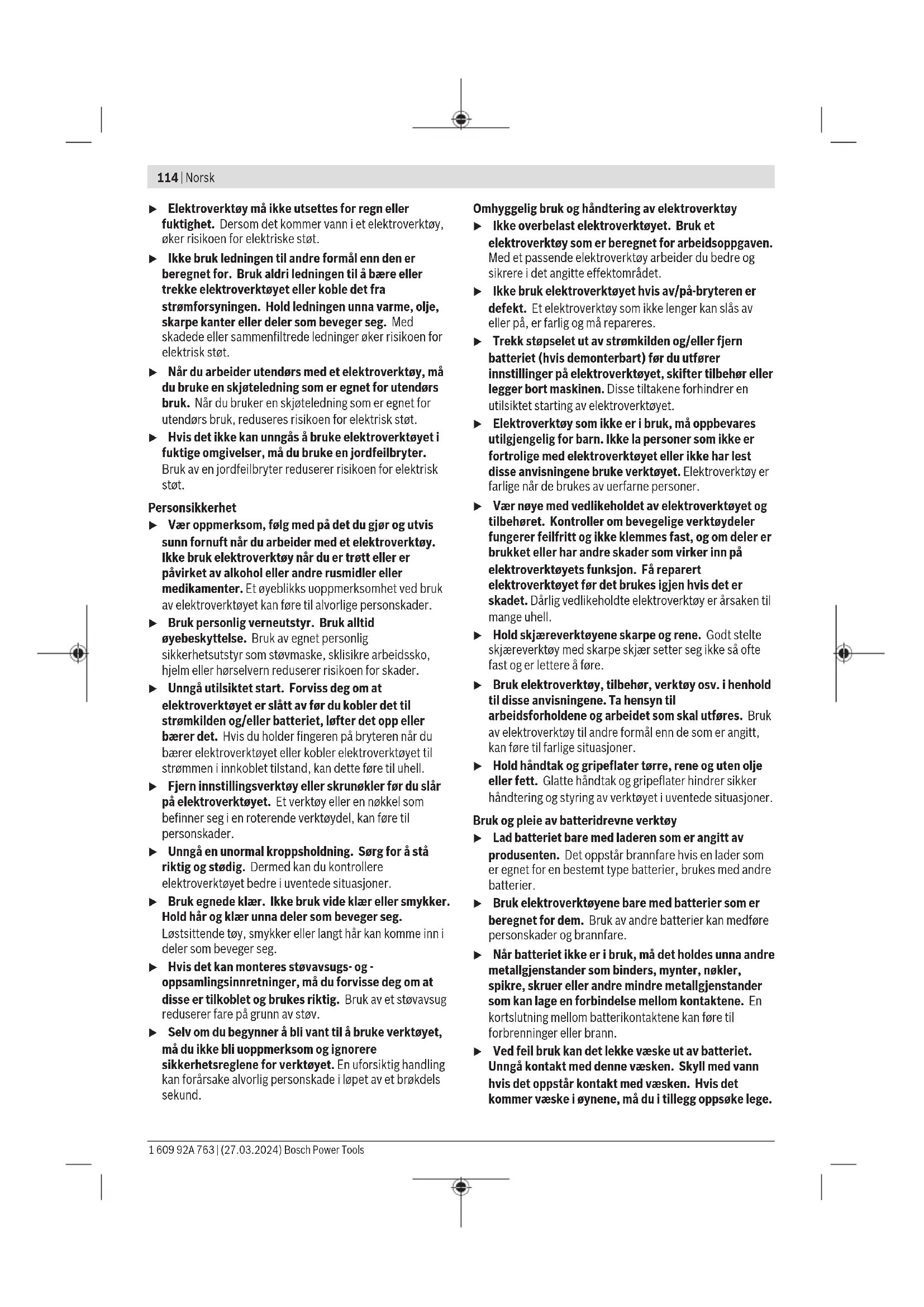 Konstantelektronikken holder turtallet så å si konstant under tomgang og last og sikrer jevn effekt. Montering Montere verneinnretning u Ta alltid batteriet ut av elektroverktøyet før arbeider på elektroverktøyet utføres (f.eks. vedlikehold, verktøyskifte osv.) og før transport og oppbevaring. Det er fare for skader hvis du trykker på av/på-bryteren ved en feiltagelse. u Før alle arbeider på elektroverktøyet utføres må støpselet trekkes ut av stikkontakten. Merknad: Etter brudd på slipeskiven under drift eller skader på festeinnretningene på vernedekselet/elektroverktøyet må elektroverktøyet omgående sendes inn til kundeservice. Adresser se avsnittet "Kundeservice og kundeveiledning". Vernedeksel for sliping Legg vernedekselet (7) på festet på elektroverktøyet. Kodetappene på vernedekselet skal stemme overens med festet. Mens du gjør dette, trykker du på utløserspaken (1) og holder den inne. Trykk vernedekselet (7) på spindelhalsen helt til kragen på vernedekselet sitter på flensen til elektroverktøyet, og drei vernedekselet til det høres at det festes. Tilpass plasseringen av vernedekselet (7) etter arbeidsoperasjonen. Dette gjør du ved å trykke utløserspaken (1) opp og dreie vernedekselet (7) til ønsket stilling. Bosch Power Tools 1 609 92A 763 | (27.03.2024)120 | Norsk u Still alltid inn vernedekselet (7) slik at begge tappene på utløserspaken (1) griper inn i de tilsvarende utsparingene til vernedekselet (7). u Still inn vernedekselet (7) slik at gnistregn i retning brukeren unngås. u I tilbehørets dreieretningen(7) skal vernedekselet bare kunne dreies ved aktivering av utløserspaken(1) ! Ellers må elektroverktøyet ikke brukes videre og må leveres til kundeservice. Merknad: Kodetappene på vernedekselet (7) sikrer at bare et vernedeksel som passer til elektroverktøyet, kan monteres. Støvavsugsdeksel for sliping Ved sliping av maling, lakk og plast ved bruk av hardmetall- koppskiver(11) kan du bruke støvavsugsdekselet(6), slik at lite støv slippes ut i omgivelsene. Støvavsugsdekselet(6) er ikke egnet for bearbeiding av metall. En egnet støvsuger fra Bosch kan kobles til støvavsugsdekselet(6). Du setter da støvsugerslangen med støvsugeradapteren i den beregnede festestussen på støvavsugsdekselet. Vernedeksel for kapping u Ved kapping må du alltid bruke vernedekselet for kapping(8) eller vernedekselet for sliping (7) sammen med beskyttelsen for kapping (9). u Sørg for tilstrekkelig støvavsug ved kapping i stein. Vernedekselet for kapping(8) monteres som vernedekselet for sliping(7). Deksel for kapping av metall Montere beskyttelsen for kapping(9) av metall på vernedekselet for sliping(7) (se bildeA): Sving festebøylen tilbake (➊). Sett beskyttelsen(9) på vernedekselet for sliping(7) (➋). Trykk festebøylen fast på vernedekselet(7)