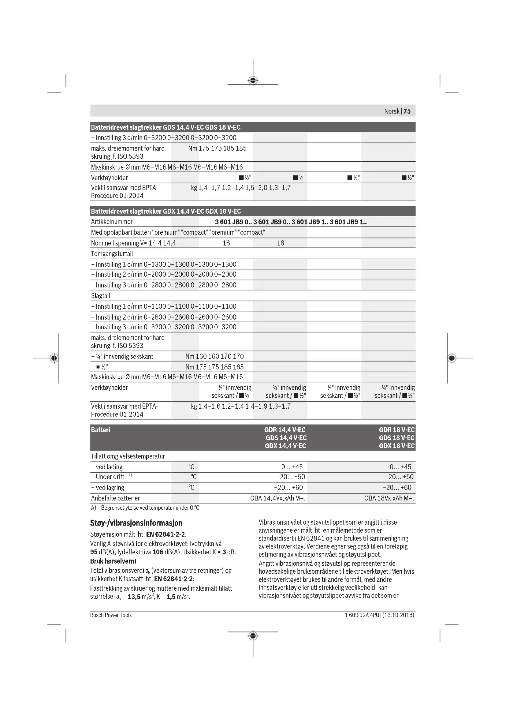 °C -20... +50 -20... +50 – ved lagring °C –20... +60 –20... +60 Anbefalte batterier GBA 14,4Vx,xAhM–. GBA 18Vx,xAhM–. A) Begrenset ytelse ved temperatur under 0°C Støy-/vibrasjonsinformasjon Støyemisjon målt iht. EN62841-2-2. Vanlig A-støynivå for elektroverktøyet: lydtrykknivå 95dB(A); lydeffektnivå 106dB(A). Usikkerhet K=3dB. Bruk hørselvern! Total vibrasjonsverdi a