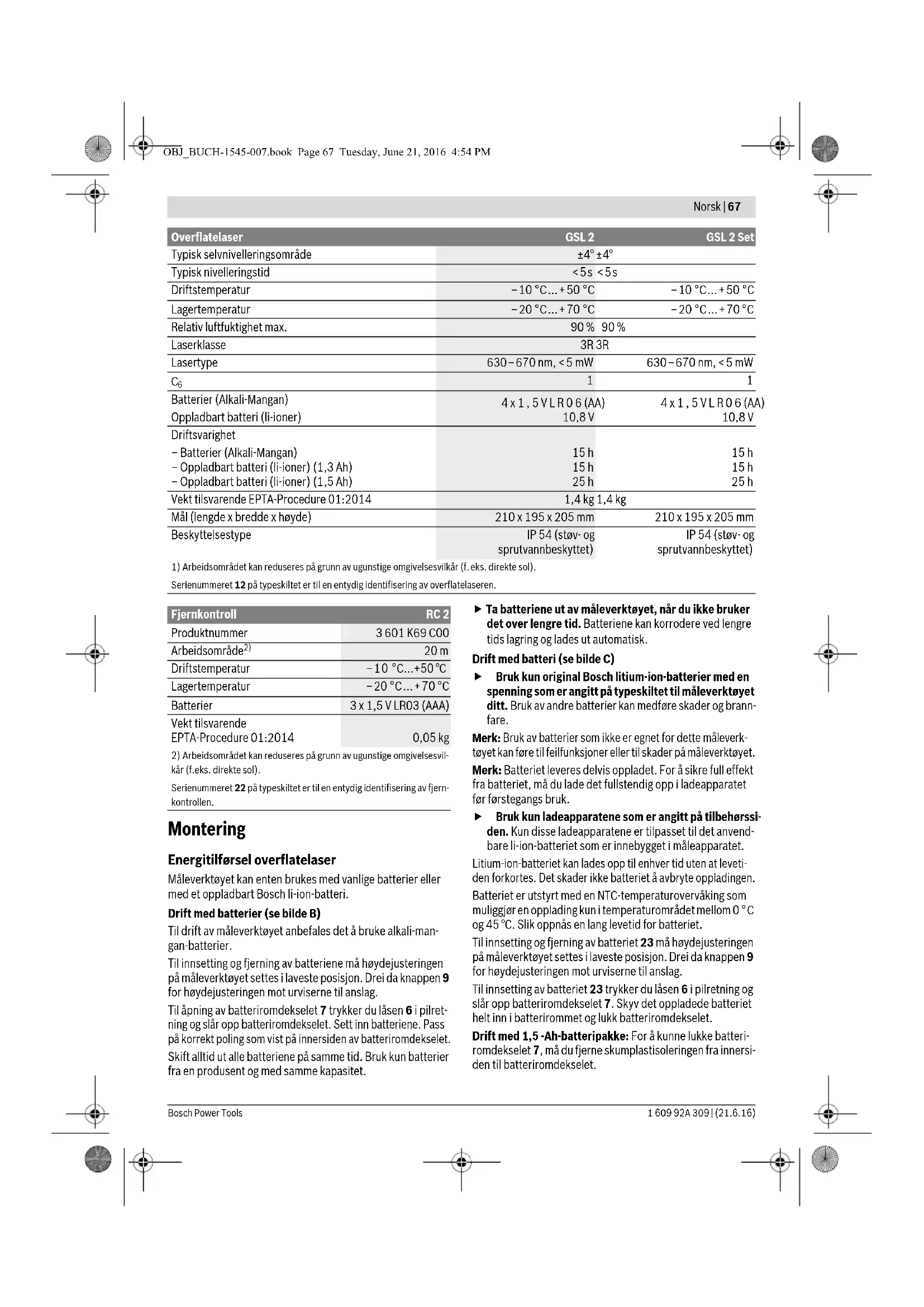 Serienummeret 12 på typeskiltet er til en entydig identifisering av overflatelaseren. OBJ_BUCH-1545-007.book Page 66 Tuesday, June 21, 2016 4:54 PMNorsk | 67 Bosch Power Tools 1 609 92A 309 | (21.6.16) Montering Energitilførsel overflatelaser Måleverktøyet kan enten brukes med vanlige batterier eller med et oppladbart Bosch li-ion-batteri. Drift med batterier (se bilde B) Til drift av måleverktøyet anbefales det å bruke alkali-man- gan-batterier. Til innsetting og fjerning av batteriene må høydejusteringen på måleverktøyet settes i laveste posisjon. Drei da knappen 9 for høydejusteringen mot urviserne til anslag. Til åpning av batteriromdekselet 7 trykker du låsen 6 i pilret- ning og slår opp batteriromdekselet. Sett inn batteriene. Pass på korrekt poling som vist på innersiden av batteriromdekselet. Skift alltid ut alle batteriene på samme tid. Bruk kun batterier fra en produsent og med samme kapasitet. Ta batteriene ut av måleverktøyet, når du ikke bruker det over lengre tid. Batteriene kan korrodere ved lengre tids lagring og lades ut automatisk. Drift med batteri (se bilde C) Bruk kun original Bosch litium-ion-batterier med en spenning som er angitt på typeskiltet til måleverktøyet ditt. Bruk av andre batterier kan medføre skader og brann- fare. Merk: Bruk av batterier som ikke er egnet for dette måleverk- tøyet kan føre til feilfunksjoner eller til skader på måleverktøyet. Merk: Batteriet leveres delvis oppladet. For å sikre full effekt fra batteriet, må du lade det fullstendig opp i ladeapparatet før førstegangs bruk. Bruk kun ladeapparatene som er angitt på tilbehørssi- den. Kun disse ladeapparatene er tilpasset til det anvend- bare li-ion-batteriet som er innebygget i måleapparatet. Litium-ion-batteriet kan lades opp til enhver tid uten at leveti- den forkortes. Det skader ikke batteriet å avbryte oppladingen. Batteriet er utstyrt med en NTC-temperaturovervåking som muliggjør en opplading kun i temperaturområdet mellom 0 ° C og 45 °C. Slik oppnås en lang levetid for batteriet. Til innsetting og fjerning av batteriet 23 må høydejusteringen på måleverktøyet settes i laveste posisjon. Drei da knappen 9 for høydejusteringen mot urviserne til anslag. Til innsetting av batteriet 23 trykker du låsen 6 i pilretning og slår opp batteriromdekselet 7. Skyv det oppladede batteriet helt inn i batterirommet og lukk batteriromdekselet. Drift med 1,5 -Ah-batteripakke: For å kunne lukke batteri- romdekselet 7, må du fjerne skumplastisoleringen fra innersi- den til batteriromdekselet. Typisk selvnivelleringsområde ±4° ±4° Typisk nivelleringstid <5s <5s Driftstemperatur –10 °C...+50 °C –10 °C ...+50 °C Lagertemperatur –20°C...+70 °C –20°C...+70 °C Relativ luftfuktighet max. 90% 90% Laserklasse 3R 3R Lasertype 630–670 nm, <5 mW 630–670 nm, <5 mW