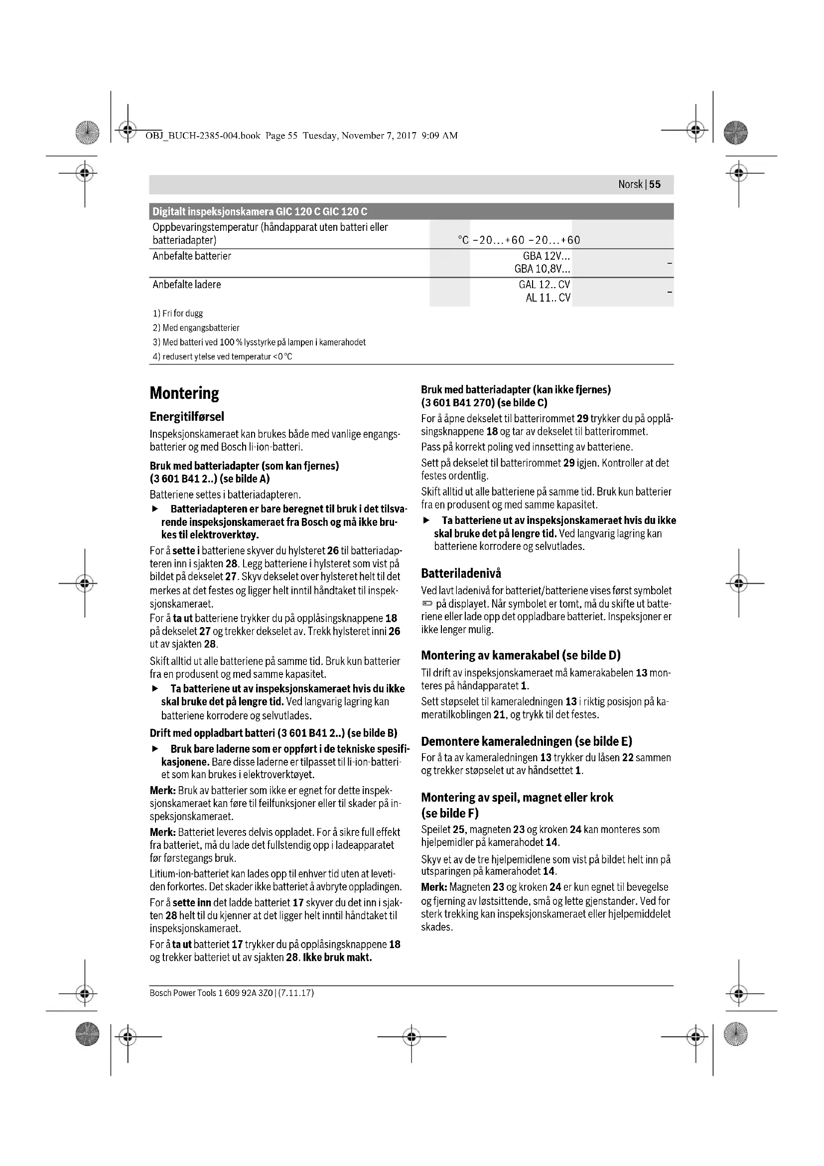 OBJ_BUCH-2385-004.book Page 54 Tuesday, November 7, 2017 9:09 AMNorsk | 55 Bosch Power Tools 1 609 92A 3Z0 | (7.11.17) Montering Energitilførsel Inspeksjonskameraet kan brukes både med vanlige engangs- batterier og med Bosch li-ion-batteri. Bruk med batteriadapter (som kan fjernes) (3 601 B41 2..) (se bilde A) Batteriene settes i batteriadapteren. Batteriadapteren er bare beregnet til bruk i det tilsva- rende inspeksjonskameraet fra Bosch og må ikke bru- kes til elektroverktøy. For å sette i batteriene skyver du hylsteret 26 til batteriadap- teren inn i sjakten 28. Legg batteriene i hylsteret som vist på bildet på dekselet 27. Skyv dekselet over hylsteret helt til det merkes at det festes og ligger helt inntil håndtaket til inspek- sjonskameraet. For å ta ut batteriene trykker du på opplåsingsknappene 18 på dekselet 27 og trekker dekselet av. Trekk hylsteret inni 26 ut av sjakten 28. Skift alltid ut alle batteriene på samme tid. Bruk kun batterier fra en produsent og med samme kapasitet. Ta batteriene ut av inspeksjonskameraet hvis du ikke skal bruke det på lengre tid. Ved langvarig lagring kan batteriene korrodere og selvutlades. Drift med oppladbart batteri (3 601 B41 2..) (se bilde B) Bruk bare laderne som er oppført i de tekniske spesifi- kasjonene. Bare disse laderne er tilpasset til li-ion-batteri- et som kan brukes i elektroverktøyet. Merk: Bruk av batterier som ikke er egnet for dette inspek- sjonskameraet kan føre til feilfunksjoner eller til skader på in- speksjonskameraet. Merk: Batteriet leveres delvis oppladet. For å sikre full effekt fra batteriet, må du lade det fullstendig opp i ladeapparatet før førstegangs bruk. Litium-ion-batteriet kan lades opp til enhver tid uten at leveti- den forkortes. Det skader ikke batteriet å avbryte oppladingen. For å sette inn det ladde batteriet 17 skyver du det inn i sjak- ten 28 helt til du kjenner at det ligger helt inntil håndtaket til inspeksjonskameraet. For å ta ut batteriet 17 trykker du på opplåsingsknappene 18 og trekker batteriet ut av sjakten 28. Ikke bruk makt. Bruk med batteriadapter (kan ikke fjernes) (3 601 B41 270) (se bilde C) For å åpne dekselet til batterirommet 29 trykker du på opplå- singsknappene 18 og tar av dekselet til batterirommet. Pass på korrekt poling ved innsetting av batteriene. Sett på dekselet til batterirommet 29 igjen. Kontroller at det festes ordentlig. Skift alltid ut alle batteriene på samme tid. Bruk kun batterier fra en produsent og med samme kapasitet. Ta batteriene ut av inspeksjonskameraet hvis du ikke skal bruke det på lengre tid. Ved langvarig lagring kan batteriene korrodere og selvutlades. Batteriladenivå Ved lavt ladenivå for batteriet/batteriene vises først symbolet på displayet. Når symbolet er tomt, må du skifte ut batte- riene eller lade opp det oppladbare batteriet. Inspeksjoner er ikke lenger mulig. Montering av kamerakabel (se bilde D) Til drift av inspeksjonskameraet må kamerakabelen 13 mon- teres på håndapparatet 1. Sett støpselet til kameraledningen 13 i riktig posisjon på ka- meratilkoblingen 21, og trykk til det festes. Demontere kameraledningen (se bilde E) For å ta av kameraledningen 13 trykker du låsen 22 sammen og trekker støpselet ut av håndsettet 1. Montering av speil, magnet eller krok (se bilde F) Speilet 25, magneten 23 og kroken 24 kan monteres som hjelpemidler på kamerahodet 14. Skyv et av de tre hjelpemidlene som vist på bildet helt inn på utsparingen på kamerahodet 14. Merk: Magneten 23 og kroken 24 er kun egnet til bevegelse og fjerning av løstsittende, små og lette gjenstander. Ved for sterk trekking kan inspeksjonskameraet eller hjelpemiddelet skades. Oppbevaringstemperatur (håndapparat uten batteri eller batteriadapter) °C –20...+60 –20...+60 Anbefalte batterier GBA 12V... GBA 10,8V...