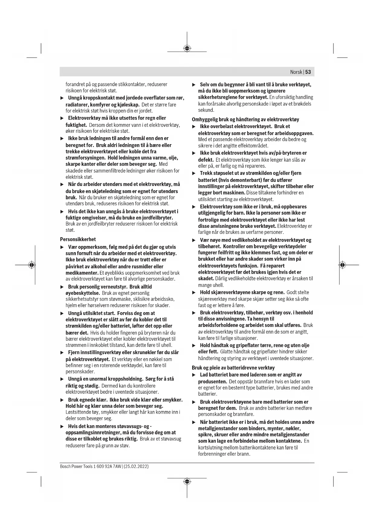 Vibrasjonsnivået og støyemisjonen som er angitt i disse anvisningene er målt i samsvar med en standardisert målemetode og kan brukes til sammenligning av elektroverktøy. Verdiene egner seg også til en foreløpig estimering av vibrasjonsnivået og støyutslippet. Angitt vibrasjonsnivå og støyutslipp representerer de hovedsakelige bruksområdene til elektroverktøyet. Men hvis elektroverktøyet brukes til andre formål, med andre innsatsverktøy eller utilstrekkelig vedlikehold, kan vibrasjonsnivået og støyutslippet avvike fra det som er angitt. Dette kan føre til en betydelig økning av vibrasjonsnivået og støyutslippet for hele arbeidstidsrommet. For en nøyaktig vurdering av vibrasjonsnivået og støyutslippet skal det også tas hensyn til de tidene verktøyet er slått av, eller går, men ikke faktisk er i bruk. Dette kan redusere vibrasjonsnivået og støyutslippet for hele arbeidstidsrommet betraktelig. Bestem ekstra sikkerhetstiltak til beskyttelse av brukeren mot vibrasjonenes virkning, som for eksempel: Vedlikehold av elektroverktøy og innsatsverktøy, holde hendene varme, organisere arbeidsforløpene. Batteri Bosch selger også batteridrevne elektroverktøy uten batteri. Det er angitt på emballasjen om et batteri følger med ditt elektroverktøy. Lade batteriet u Bruk bare laderne som er oppført i de tekniske spesifikasjonene. Kun disse laderne er tilpasset til Li- ion-batteriet som er brukt i elektroverktøyet. Merknad: I samsvar med internasjonale transportforskrifter blir litium-ion-batterier levert delvis ladet. For å sikre full effekt fra batteriet må du lade det helt opp før første gangs bruk. Sette inn batteriet Skyv det oppladede batteriet inn i batteriholderen til det låses ordentlig. Ta ut batteriet For å ta ut batteriet trykker du på utløserknappen og trekker batteriet ut. Ikke bruk makt. Batteriethar tolåsetrinn som skal hindre at batteriet faller ut hvis batteriutløserknappentrykkes inn utilsiktet. Så lenge batteriet er satt inn i elektroverktøyet, holdes det i posisjon av en fjær. Indikator for batteriladenivå De grønne lysdiodene i batteriets ladenivåindikator viser batteriets ladenivå. Av sikkerhetsgrunner er det bare mulig å få vist ladenivået når elektroverktøyet er stoppet. Trykk på knappen for indikatoren for batteriets ladenivå eller for å se ladenivået. Dette er mulig også når batteriet er tatt ut. Hvis ingen lysdiode lyser etter at knappen for indikatoren for batteriets ladenivå er trykt inn, er batteriet defekt og må skiftes ut. Batteritype GBA 18V... Lysdiode Kapasitet Lyser kontinuerlig 3 × grønt 60–100% Lyser kontinuerlig 2 × grønt 30–60% Lyser kontinuerlig 1 × grønt 5–30% Blinker 1 × grønt 0–5% Batteritype ProCORE18V... Lysdiode Kapasitet Lyser kontinuerlig 5 × grønt 80–100% Lyser kontinuerlig 4 × grønt 60–80% Lyser kontinuerlig 3 × grønt 40–60% Lyser kontinuerlig 2 × grønt 20–40% Lyser kontinuerlig 1 × grønt 5–20% Blinker 1 × grønt 0–5% Regler for optimal bruk av oppladbare batterier Beskytt batteriet mot fuktighet og vann. Batteriet må oppbevares ved temperatur fra −20°C til 50°C. Du må for eksempel ikke la det ligge i bilen om sommeren. Rengjør ventilasjonsslissene på batteriet regelmessig med en myk, ren og tørr pensel. En vesentlig kortere driftstid etter oppladingen er et tegn på at batteriet er oppbrukt og må skiftes ut. Følg anvisningene om kassering. Bosch Power Tools 1 609 92A 7AW | (25.02.2022)56 | Norsk Bruk Igangsetting Inn-/utkobling For å slå på elektroverktøyet skyver du på-/av-bryteren(3) forover, slik at I vises på bryteren. For å slå av elektroverktøyet skyver du på-/av-bryteren(3) bakover, slik at 0 vises på bryteren. Gjenstartbeskyttelse Beskyttelsen mot ny innkobling forhindrer en kontrollert starting av elektroverktøyet etter avbrudd på strømtilførselen. For å slå på igjen setter du av/på-bryteren(3) i utkoblet stilling og slår på elektroverktøyet på nytt. Mykstart Den elektroniske mykstarten begrenser dreiemomentet når verktøyet slås på og forlenger motorens levetid. Skifte skjæreretning For å skifte skjæreretning kan du dreie matriseholderen(7) i tre posisjoner med avstand på 90°. Skjæreretning bakover (mot huset) er ikke mulig. For å dreie matriseholderen(7) løsner du skruen(4) helt til du kan dreie matriseholderen. Drei den 90° til høyre eller venstre mot elektroverktøyets lengdeakse. Pass på at skruen(4) griper inn i hullet på matriseholderen(7). Stram skruen. Arbeidshenvisninger u Ta alltid batteriet ut av elektroverktøyet før arbeider på elektroverktøyet utføres (f.eks. vedlikehold, verktøyskifte osv.) og før transport og oppbevaring. Det er fare for skader hvis du trykker på av/på-bryteren ved en feiltagelse. u Elektroverktøyet er ikke egnet for stasjonær bruk. Det må for eksempel ikke spennes fast i en skrustikke eller festes på en arbeidsbenk. u Bruk vernehansker under arbeidet. Det oppstår skarpe kanter på de skårede platene, som du kan skade deg på. u Vær forsiktig med skjærespon. Spon har skarpe spisser som kan skade deg. Elektroverktøyet må kun føres inn mot arbeidsstykket i innkoblet tilstand. Hold elektroverktøyet alltid loddrett mot platens overflate og kil det ikke fast. Skjæringen utføres når stempelet beveger seg nedover. Før elektroverktøyet jevnt med lett trykk forover i skjæreretningen. Hvis du trykker det for hardt forover, reduseres levetiden til innsatsverktøyet betraktelig, og elektroverktøyet kan skades. Elektroverktøyet arbeider roligere hvis det løftes litt opp ved skjæringen. Hvis stempelet skulle klemme fast ved skjæring, må du koble ut elektroverktøyet, smøre stempelet og slakke platen. Ikke bruk makt, ellers kan stempel og matrise skades. Max. platetykkelse som skal skjæres Den maksimale platetykkelsen d max som kan skjæres avhenger av fastheten på materialet som skal bearbeides. Med elektroverktøyet kan det skjæres pl