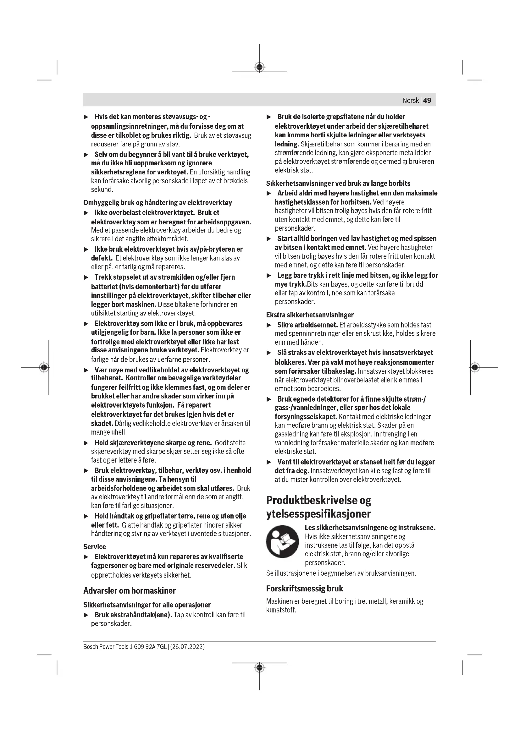 Illustrert eller beskrevet tilbehør inngår ikke i standard- leveransen. Det komplette tilbehøret finner du i vårt tilbehørsprogram. Tekniske data Bormaskin GBM 1600 RE Artikkelnummer 3601AB00.. Opptatt effekt W 850 Tomgangsturtall o/min 630 Dreiemoment Nm 11 Spindelhalsdiameter mm 43 Maks. bor-Ø – Stål mm 16 – Tre mm 40 – Aluminium mm 16 Chuckspennområde mm 3–16 Høyre-/venstregang ● Maksimal rørekurvdiameter mm 160 Vekt i samsvar med EPTA-Procedure 01:2014 kg 3,0 Kapslingsgrad / II Angivelsene gjelder for merkespenning [U] på 230 V. Ved avvikende spenning og på utførelser for bestemte land kan disse angivelsene variere. Støy-/vibrasjonsinformasjon Støyemisjon målt i henhold til EN62841-2-1. Vanlig A-støynivå for elektroverktøyet: lydtrykknivå 85dB(A); lydeffektnivå 96dB(A). Usikkerhet K = 5dB. Bruk hørselvern! Vibrasjon totalt a