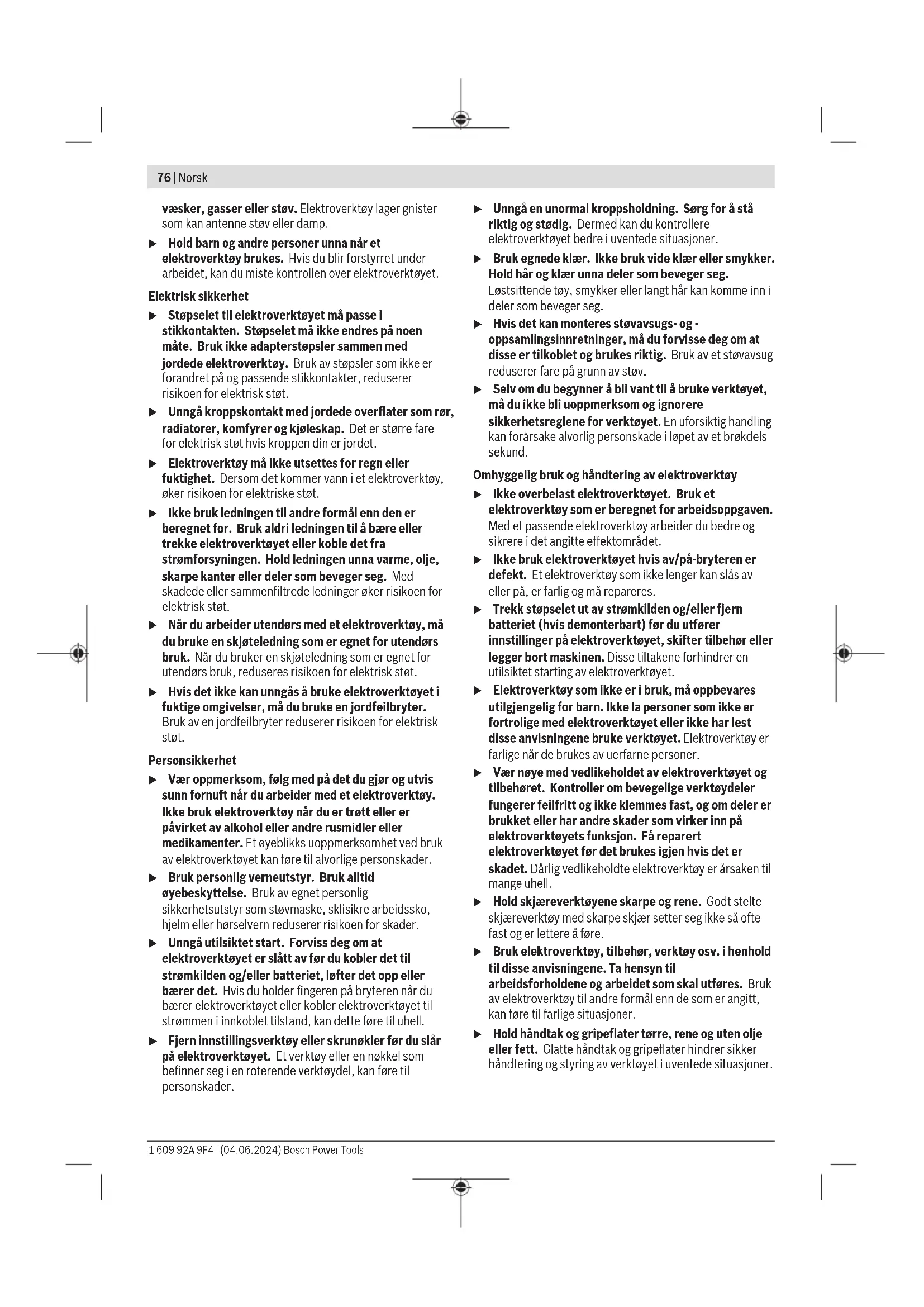 1,5 1,5 1,5 Vibrasjonsnivået og støyemisjonen som er angitt i disse anvisningene er målt i samsvar med en standardisert målemetode og kan brukes til sammenligning av elektroverktøy. Verdiene egner seg også til en foreløpig estimering av vibrasjonsnivået og støyutslippet. Angitt vibrasjonsnivå og støyutslipp representerer de hovedsakelige bruksområdene til elektroverktøyet. Men hvis elektroverktøyet brukes til andre formål, med andre innsatsverktøy eller utilstrekkelig vedlikehold, kan vibrasjonsnivået og støyutslippet avvike fra det som er angitt. Dette kan føre til en betydelig økning av vibrasjonsnivået og støyutslippet for hele arbeidstidsrommet. For en nøyaktig vurdering av vibrasjonsnivået og støyutslippet skal det også tas hensyn til de tidene verktøyet er slått av, eller går, men ikke faktisk er i bruk. Dette kan redusere vibrasjonsnivået og støyutslippet for hele arbeidstidsrommet betraktelig. Bestem ekstra sikkerhetstiltak til beskyttelse av brukeren mot vibrasjonenes virkning, som for eksempel: Vedlikehold av elektroverktøy og innsatsverktøy, holde hendene varme, organisere arbeidsforløpene. Bosch Power Tools 1 609 92A 9F4 | (04.06.2024)80 | Norsk Montering u Bruk kun sagblad med en maksimal godkjent hastighet som er høyere enn elektroverktøyets tomgangsturtall. Sette på / bytte sirkelsagblad u Før alle arbeider på elektroverktøyet utføres må støpselet trekkes ut av stikkontakten. u Bruk vernehansker ved montering av sagbladet. Ved berøring av sagbladet er det fare for skader. u Bruk aldri slipeskiver som innsatsverktøy. u Bruk kun sagblad som tilsvarer de tekniske dataene som er angitt i denne bruksanvisningen og på elektroverktøyet og som er kontrollert jf. EN847‑1 og tilsvarende markert. Velge sagblad Du finner en oversikt over anbefalte sagblad sist i denne veiledningen. Ta av sagblad (se bilde A) Når du skal bytte verktøy, er det best å legge elektroverktøyet på fronten av motorhuset. – Trykk på spindellåseknappen (5), og hold den inne. u Du må bare trykke på spindellåseknappen (5) når sagspindelen er stoppet. Elektroverktøyet kan ta skade hvis det velter. – Skru spennskruen (20) ut i dreieretningen ➊ med unbrakonøkkelen (4). – Sving pendelvernedekselet (12) tilbake, og hold det fast. – Ta spennflensen (21) og sagbladet (22) fra sagspindelen (24). Sette på sagblad (se bilde A) Når du skal bytte verktøy, er det best å legge elektroverktøyet på fronten av motorhuset. – Rengjør sagbladet (22) og alle fastspenningsdelene som skal monteres. – Sving pendelvernedekselet (12) tilbake, og hold det fast. – Sett sagbladet (22) på festeflensen (23). Tennenes kutteretning (pilens retning på sagbladet) og dreieretningspilen på vernedekselet (12)må stemme overens. – Sett på spennflensen (21), og skru inn spennskruen (20) i dreieretningen ➋. Vær oppmerksom på riktig monteringsposisjon for festeflensen (23) og spennflensen (21). – Trykk på spindellåseknappen (5), og hold den inne. – Stram spennskruen (20) i dreieretningen ➋ med unbrakonøkkelen (4). Tiltrekkingsmomentet skal være 6−9Nm, noe som tilsvarer fingerstramt i tillegg til ¼ omdreining. Støv-/sponavsuging Støv fra materialer som blyholdig maling, noen tresorter, mineraler og metall kan være helsefarlige. Berøring eller innånding av støv kan utløse allergiske reaksjoner og/eller åndedrettssykdommer hos brukeren eller personer som befinner seg i nærheten. Visse typer støv som eike- eller bøkestøv gjelder som kreftfremkallende, spesielt i kombinasjon med tilsetningsstoffer til trebearbeidelse (kromat, trebeskyttelsesmidler). Asbestholdig materiale må kun bearbeides av fagfolk. – Bruk helst et støvavsug som er egnet for dette materialet. – Sørg for god ventilasjon av arbeidsplassen. – Det anbefales å bruke en støvmaske med filterklasse P2. Følg ditt lands gyldige forskrifter for de materialene som skal bearbeides. u Unngå støv på arbeidsplassen. Støv kan lett antennes. Montere støvsugeradapter (se bilde B) Skyv støvsugeradapteren (26) på sponutkastet (16) til den låses. Fest støvsugeradapteren (26) i tillegg med skruen (25). En støvsugerslange med diameter på 35 mm kan kobles til støvsugeradapteren (26). u Støvsugeradapteren må ikke monteres uten tilkoblet eksternt avsug. Det kan føre til at sugekanalen tilstoppes. u Det må ikke kobles en støvsekk til støvsugeradapteren. Det kan føre til tilstopping av avsugssystemet. Rengjør støvsugeradapteren (26) jevnlig for å sikre optimal sugeeffekt. Eksternt avsug Koble sugeslangen til en støvsuger (tilbehør). Du finner en oversikt over tilkobling til forskjellige støvsugere sist i denne veiledningen. Elektroverktøyet kan kobles direkte til en stikkontakt på en Bosch universalsuger med fjernstart. Denne starter automatisk når elektroverktøyet slås på. Støvsugeren må være egnet til materialet som skal bearbeides. Ved oppsuging av spesielt helsefarlig, kreftfremkallende eller tørt støv må du bruke en spesialstøvsuger. Bruk u Før alle arbeider på elektroverktøyet utføres må støpselet trekkes ut av stikkontakten. Driftsmoduser Stille inn sagedybden (se bilde C) u Tilpass kuttedybden til tykkelsen på emnet. Mindre enn en full tannhøyde bør være synlig under emnet. Løsne spennspaken (27). For mindre kuttedybde trekker du sagen bort fra grunnplaten (14), og for større kuttedybde trykker du sagen mot grunnplaten (14). Still inn ønsket mål på skalaen for kuttedybde. Stram spennspaken (27) igjen. Hvis det ikke er mulig å justere kuttedybden ordentlig etter at du har løsnet på spennspaken (27), trekker du 1 609 92A 9F4 | (04.06.2024) Bosch Power ToolsNorsk | 81 spennspaken (27) bort fra sagen og svinger den ned. Slipp spennspaken (27) igjen. Gjenta denne prosedyren til ønsket kuttedybde kan stilles inn. Spennspakens (27) fastspenningskraft kan justeres. Dette gjør du ved å skru av spennspaken (27) og skru den fast igjen