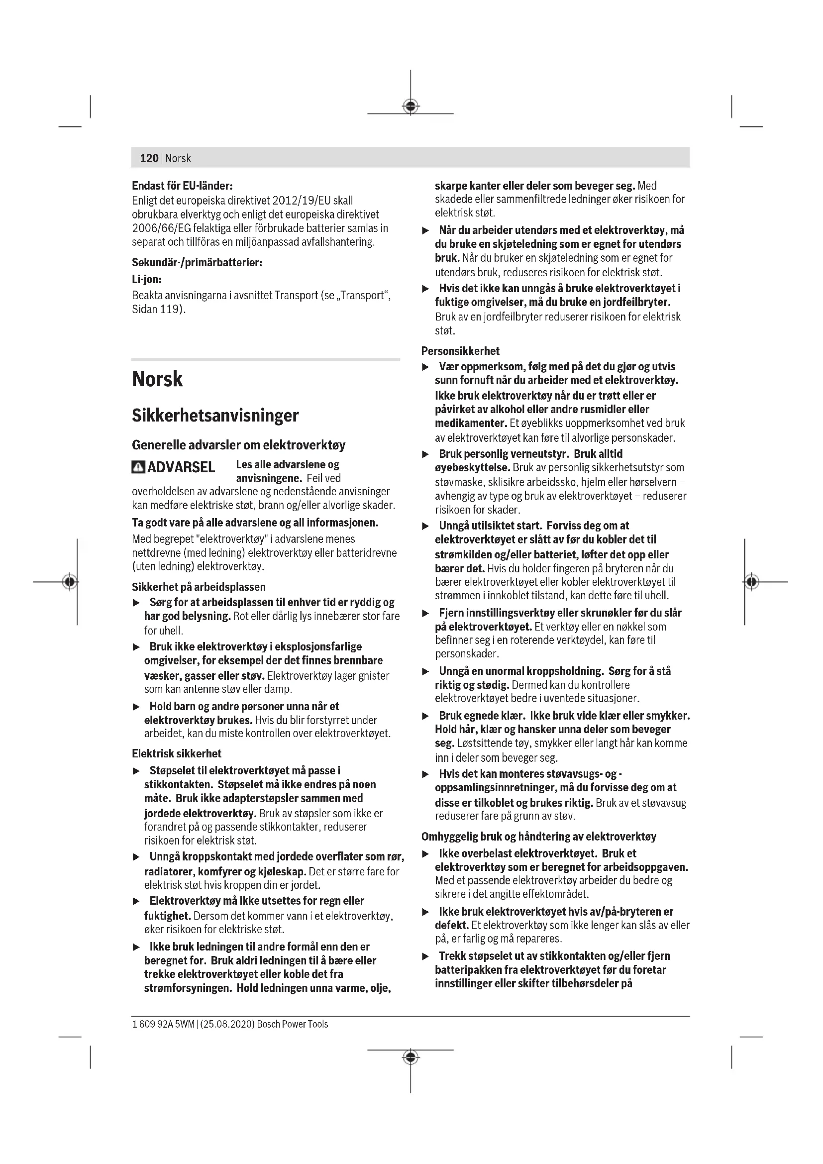 Low Energy Module GCY 30-4 fås som tilbehør. For elektroverktøyene GWS 18V-10 PSC følger den med ved levering. Les bruksanvisningen som følger med for informasjon om Bluetooth® Low Energy Module GCY30-4. Bosch Power Tools 1 609 92A 5WM | (25.08.2020)126 | Norsk Opplading av batteriet u Bruk bare laderne som er oppført i de tekniske spesifikasjonene. Kun disse laderne er tilpasset til Li- ion-batteriet som er brukt i elektroverktøyet. Merk: Batteriet er delvis ladet ved levering. For å sikre full effekt fra batteriet må du lade det helt opp i laderen før første gangs bruk. Litium-ion-batteriet kan lades opp til enhver tid uten at levetiden forkortes. Det skader ikke batteriet å avbryte oppladingen. Li-Ion-batteriet har "Electronic Cell Protection (ECP)" som beskytter mot dyputladning. Når batteriet er utladet, kobles elektroverktøyet ut med en beskyttelseskobling: Innsatsverktøyet beveger seg ikke lenger. u Ikke fortsett å trykke på av/på-bryteren etter automatisk utkobling av elektroverktøyet. Batteriet kan ta skade. Følg informasjonene om kassering. Fjerning av batteriet Batteriet (8) har to låsetrinn som skal hindre at batteriet faller ut hvis batteriutløserknappen (9) trykkes inn utilsiktet. Så lenge batteriet er satt inn i elektroverktøyet, holdes det i posisjon av en fjær. For å ta ut batteriet (8) trykker du på utløserknappen (9) og trekker batteriet ut av elektroverktøyet. Ikke bruk makt. Indikator for batteriladenivå (batteritype GBA18V...) (se bilde A) De tre grønne lysdiodene i batteriets ladenivåindikator (29) viser batteriets (8) ladenivå. Av sikkerhetsgrunner er det bare mulig å få vist ladenivået når elektroverktøyet er stoppet. Trykk på knappen (28) for å se ladenivået. Dette er mulig også når batteriet (8) er tatt ut. LED Kapasitet Kontinuerlig lys 3x grønt ≥ 2/3 Kontinuerlig lys 2x grønt ≥ 1/3 Kontinuerlig lys 1x grønt < 1/3 Blinkende lys 1 x grønt Reserve Hvis ingen lysdiode lyser etter at knappen (28) er trykt, er batteriet defekt og må skiftes ut. Merknad: Batteriets ladenivå vises også på brukergrensesnittet (5) (se „Brukergrensesnitt (se bilde D)“, Side129). Indikator for batteriladenivå (batteritype GBA 18V 6.3Ah, ProCORE18V...) (se bilde B) De fem grønne lysdiodene i batteriets ladenivåindikator (31) viser batteriets ladenivå. Av sikkerhetsgrunner er det bare mulig å få vist ladenivået når elektroverktøyet er stoppet. Trykk på knappen (30) for å se ladenivået. Dette er mulig når batteriet er tatt ut også. Lysdioder Kapasitet Kontinuerlig lys 5× grønt 80−100 % Kontinuerlig lys 4× grønt 60−80 % Kontinuerlig lys 3× grønt 40−60 % Kontinuerlig lys 2× grønt 20−40 % Kontinuerlig lys 1× grønt 5−20 % Blinker 1× grønt 0−5 % Hvis ingen lysdiode lyser etter at knappen (30) er trykt, er batteriet defekt og må skiftes ut. Merknad: Batteriets ladenivå vises også på brukergrensesnittet (5) (se „Brukergrensesnitt (se bilde D)“, Side129). Montere verneinnretning u Ta alltid batteriet ut av elektroverktøyet før arbeider på elektroverktøyet utføres (f.eks. vedlikehold, verktøyskifte osv.) og før transport og oppbevaring. Det er fare for skader hvis du trykker på av/på-bryteren ved en feiltagelse. Merknad: Etter brudd på slipeskiven under drift eller skader på festeinnretningene på vernedekselet/elektroverktøyet må elektroverktøyet omgående sendes inn til kundeservice. Adresser se avsnittet "Kundeservice og kundeveiledning". Vernedeksel for sliping Legg vernedekselet (13) på festet på elektroverktøyet. Kodetappene på vernedekselet skal stemme overens med festet. Mens du gjør dette, trykker du på utløserspaken (1) og holder den inne. Trykk vernedekselet (13) på spindelhalsen helt til kragen på vernedekselet sitter på flensen til elektroverktøyet, og drei vernedekselet til det høres at det festes. Tilpass plasseringen av vernedekselet (13) etter arbeidsoperasjonen. Dette gjør du ved å trykke utløserspaken (1) opp og dreie vernedekselet (13) til ønsket stilling. u Still alltid inn vernedekselet (13) slik at alle de tre røde tappene på utløserspaken (1) griper inn i de tilsvarende utsparingene til vernedekselet (13) . u Still inn vernedekselet (13) slik at gnistregn i retning brukeren unngås. u Vernedekselet (13) skal bare kunne dreies ved aktivering av utløserspaken (1) ! Ellers må elektroverktøyet ikke brukes videre og må leveres til kundeservice. Merknad: Kodetappene på vernedekselet (13) sikrer at bare et vernedeksel som passer til elektroverktøyet, kan monteres. 1 609 92A 5WM | (25.08.2020) Bosch Power ToolsNorsk | 127 Støvavsugsdeksel for sliping Ved sliping av maling, lakk og plast ved bruk av hardmetall- koppskiver (16) kan du bruke støvavsugsdekselet (12), slik at lite støv slippes ut i omgivelsene. Støvavsugsdekselet (12) er ikke egnet for bearbeiding av metall. En egnet støvsuger fra Bosch kan kobles til støvavsugsdekselet (12). Støvavsugsdekselet (12) monteres som vernedekselet (13). Børsteringen kan skiftes ut. Vernedeksel for kapping u Ved kapping med bundne slipemidler må du alltid bruke vernedekselet for kapping (18). u Sørg for tilstrekkelig støvavsug ved kapping i stein. Vernedekselet for kapping (18) monteres som vernedekselet for sliping (13). Støvavsugsdeksel for kapping med styreskinner Støvavsugsdekselet for kapping med styreskinner (32) monteres som vernedekselet for sliping (13). Ekstrahåndtak u Du må ikke bruke elektroverktøyet uten ekstrahåndtaket (11). Skru fast ekstrahåndtaket (11) til høyre eller venstre på girhodet, avhengig av hvordan du arbeider. Vibrasjonsdempende ekstrahåndtak Det vibrasjonsdempende ekstrahåndtaket gir mulighet til sikrere og mer komfortabelt arbeid med lite vibrasjoner. u Du må aldri endre på ekstrahåndtaket. Ekstrahåndtaket må ikke brukes hvis det er skadet. Håndbeskyttelse u Monter alltid håndbeskyttelsen når du skal arbeide med gummislipeskiven (22) eller kop