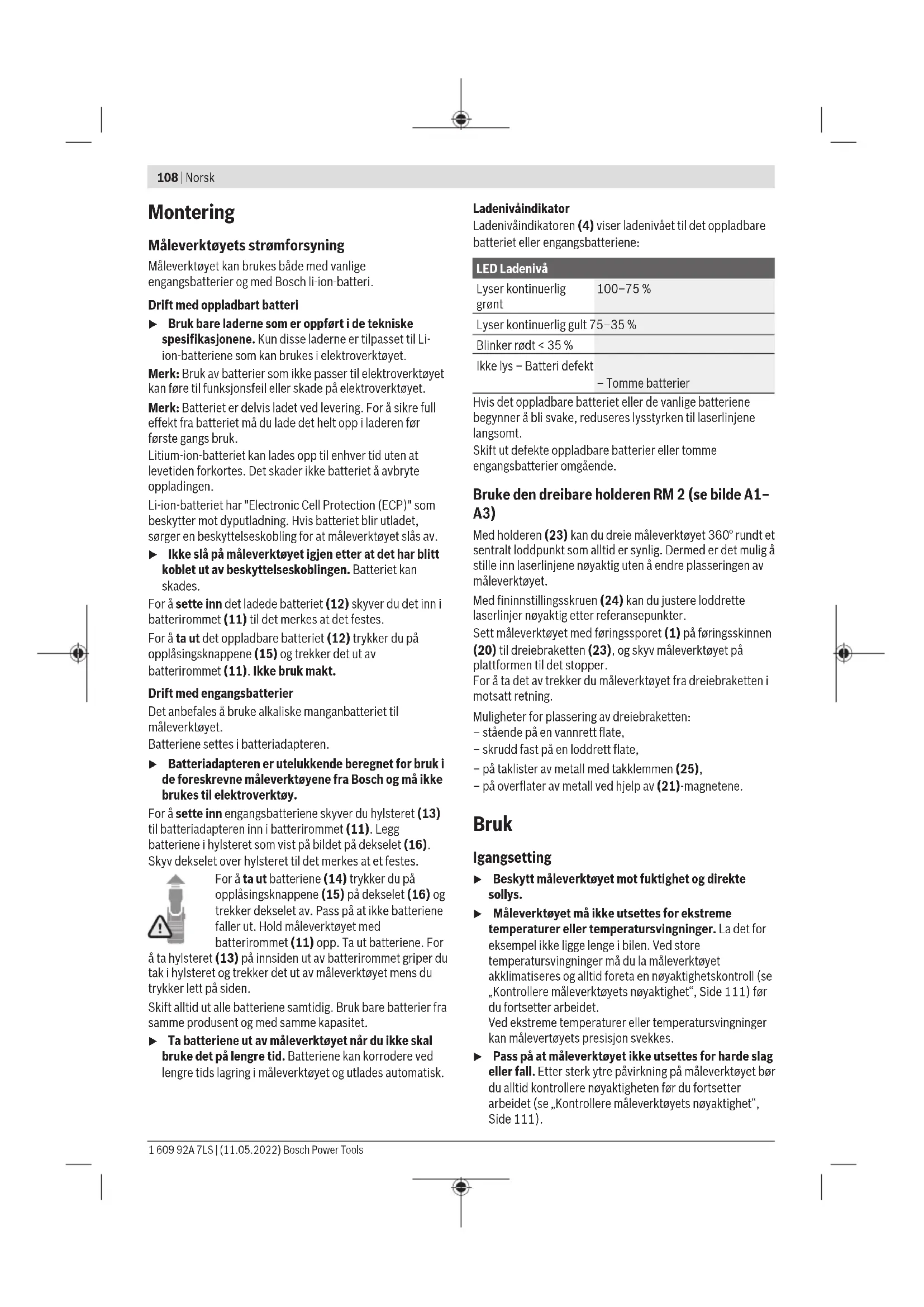Ved 20–25°C C) De angitte verdiene forutsetter vanlige til gunstige omgivelsesforhold (f.eks. ingen vibrasjon, ingen tåke, ingen røyk, ikke direkte sollys). Etter store temperatursvingninger kan det oppstå avvik ved nøyaktigheten. D) Det oppstår bare ikke-ledende smuss, men det forventes nå og da forbigående ledeevne forårsaket av kondens. E) Kortere driftstid ved Bluetooth®-drift og/eller i forbindelse med RM 3 F) I forbindelse med Bluetooth® Low Energy-enheter kan det, avhengig av modell og operativsystem, hende at det ikke er mulig å opprette forbindelse. Bluetooth®-enheter må støtte SPP-profilen. G) Avhengig av batteriet H) Li-ion-batteriet og batteriladeren AA1 er utelukket fra IP54. Tekniske data beregnet med batteri fra standardleveransen. Måleverktøyet identifiseres ved hjelp av serienummeret (19) på typeskiltet. Bosch Power Tools 1 609 92A 7LS | (11.05.2022)108 | Norsk Montering Måleverktøyets strømforsyning Måleverktøyet kan brukes både med vanlige engangsbatterier og med Bosch li-ion-batteri. Drift med oppladbart batteri u Bruk bare laderne som er oppført i de tekniske spesifikasjonene. Kun disse laderne er tilpasset til Li- ion-batteriene som kan brukes i elektroverktøyet. Merk: Bruk av batterier som ikke passer til elektroverktøyet kan føre til funksjonsfeil eller skade på elektroverktøyet. Merk: Batteriet er delvis ladet ved levering. For å sikre full effekt fra batteriet må du lade det helt opp i laderen før første gangs bruk. Litium-ion-batteriet kan lades opp til enhver tid uten at levetiden forkortes. Det skader ikke batteriet å avbryte oppladingen. Li-ion-batteriet har "Electronic Cell Protection (ECP)" som beskytter mot dyputladning. Hvis batteriet blir utladet, sørger en beskyttelseskobling for at måleverktøyet slås av. u Ikke slå på måleverktøyet igjen etter at det har blitt koblet ut av beskyttelseskoblingen. Batteriet kan skades. For å sette inn det ladede batteriet (12) skyver du det inn i batterirommet (11) til det merkes at det festes. For å ta ut det oppladbare batteriet (12) trykker du på opplåsingsknappene (15) og trekker det ut av batterirommet (11). Ikke bruk makt. Drift med engangsbatterier Det anbefales å bruke alkaliske manganbatteriet til måleverktøyet. Batteriene settes i batteriadapteren. u Batteriadapteren er utelukkende beregnet for bruk i de foreskrevne måleverktøyene fra Bosch og må ikke brukes til elektroverktøy. For å sette inn engangsbatteriene skyver du hylsteret (13) til batteriadapteren inn i batterirommet (11). Legg batteriene i hylsteret som vist på bildet på dekselet (16). Skyv dekselet over hylsteret til det merkes at et festes. For å ta ut batteriene (14) trykker du på opplåsingsknappene (15) på dekselet (16) og trekker dekselet av. Pass på at ikke batteriene faller ut. Hold måleverktøyet med batterirommet (11) opp. Ta ut batteriene. For å ta hylsteret (13) på innsiden ut av batterirommet griper du tak i hylsteret og trekker det ut av måleverktøyet mens du trykker lett på siden. Skift alltid ut alle batteriene samtidig. Bruk bare batterier fra samme produsent og med samme kapasitet. u Ta batteriene ut av måleverktøyet når du ikke skal bruke det på lengre tid. Batteriene kan korrodere ved lengre tids lagring i måleverktøyet og utlades automatisk. Ladenivåindikator Ladenivåindikatoren(4) viser ladenivået til det oppladbare batteriet eller engangsbatteriene: LED Ladenivå Lyser kontinuerlig grønt 100–75% Lyser kontinuerlig gult 75–35% Blinker rødt <35% Ikke lys – Batteri defekt – Tomme batterier Hvis det oppladbare batteriet eller de vanlige batteriene begynner å bli svake, reduseres lysstyrken til laserlinjene langsomt. Skift ut defekte oppladbare batterier eller tomme engangsbatterier omgående. Bruke den dreibare holderenRM2 (sebildeA1– A3) Med holderen(23) kan du dreie måleverktøyet 360° rundt et sentralt loddpunkt som alltid er synlig. Dermed er det mulig å stille inn laserlinjene nøyaktig uten å endre plasseringen av måleverktøyet. Med fininnstillingsskruen(24) kan du justere loddrette laserlinjer nøyaktig etter referansepunkter. Sett måleverktøyet med føringssporet (1) på føringsskinnen (20) til dreiebraketten (23), og skyv måleverktøyet på plattformen til det stopper. For å ta det av trekker du måleverktøyet fra dreiebraketten i motsatt retning. Muligheter for plassering av dreiebraketten: – stående på en vannrett flate, – skrudd fast på en loddrett flate, – på taklister av metall med takklemmen (25), – på overflater av metall ved hjelp av (21)-magnetene. Bruk Igangsetting u Beskytt måleverktøyet mot fuktighet og direkte sollys. u Måleverktøyet må ikke utsettes for ekstreme temperaturer eller temperatursvingninger. La det for eksempel ikke ligge lenge i bilen. Ved store temperatursvingninger må du la måleverktøyet akklimatiseres og alltid foreta en nøyaktighetskontroll (se „Kontrollere måleverktøyets nøyaktighet“, Side111) før du fortsetter arbeidet. Ved ekstreme temperaturer eller temperatursvingninger kan målevertøyets presisjon svekkes. u Pass på at måleverktøyet ikke utsettes for harde slag eller fall. Etter sterk ytre påvirkning på måleverktøyet bør du alltid kontrollere nøyaktigheten før du fortsetter arbeidet (se „Kontrollere måleverktøyets nøyaktighet“, Side111). 1 609 92A 7LS | (11.05.2022) Bosch Power ToolsNorsk | 109 u Slå av måleverktøyet når du transporterer det. Når det slås av, låses pendelenheten. Denne kan skades ved kraftige bevegelser. Inn-/utkobling For å slå på måleverktøyet skyver du av/på-bryteren(2) til stillingen On (for arbeid med pendellås) eller til stillingen On (for arbeid med automatisk nivellering). Måleverktøyet sender laserstråler ut av åpningene(3) umiddelbart etter at det er slått på. u Rett aldri laserstrålen mot personer eller dyr, og se ikke selv inn i laserstrålen, heller ikke fra større avstand. For å slå a