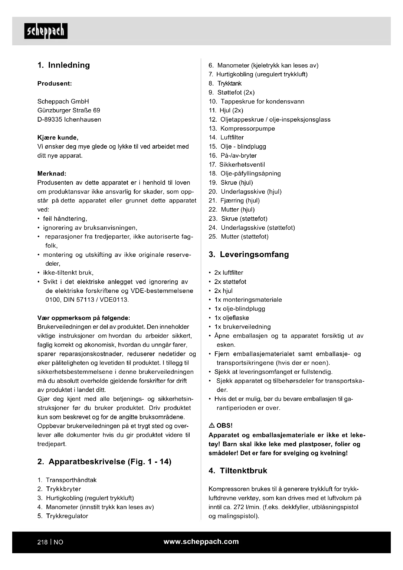 Feil Mulig årsak Tiltak Kompressor går ikke. Nettspenning ikke tilgjengelig. Kontroller kabelen, strømpluggen og stikkontakten. For lav nettspenning. Unngå for lange skjøteledninger. Bruk en skjøteledning med tilstrekkelig ledertverrsnitt. Utetemperatur for lav. Må ikke drives under +5° C utetemperatur. Motor overopphetet. La motoren avkjøles, fjern ev. årsaken for overopphe- ting. Kompressoren går men uten trykk. Sikkerhetsventil (17) utett. Skift ut sikkerhetsventil (17). Tetninger ødelagt. Kontroller tetningene og få ødelagte tetninger bli skiftet ut av et fagverksted. Tappeskrue for kondensvann (10) lekker. Trekk til skruen for hånd. Kontroller tetningen på skruen og skift ut om nødven- dig. Kompressoren går, trykk vises på manometeret, men verktøyene går ikke. Slangeforbindelser utett. Kontroller trykkluftslangen og verktøyene, skift ut om nødvendig. Hurtigkobling utett. Kontroller hurtigkobling, skift ut om nødvendig. Stilt inn for lavt trykk på trykkre- gulatoren (5). Skru opp trykkregulatoren ytterligere.www.scheppach.com