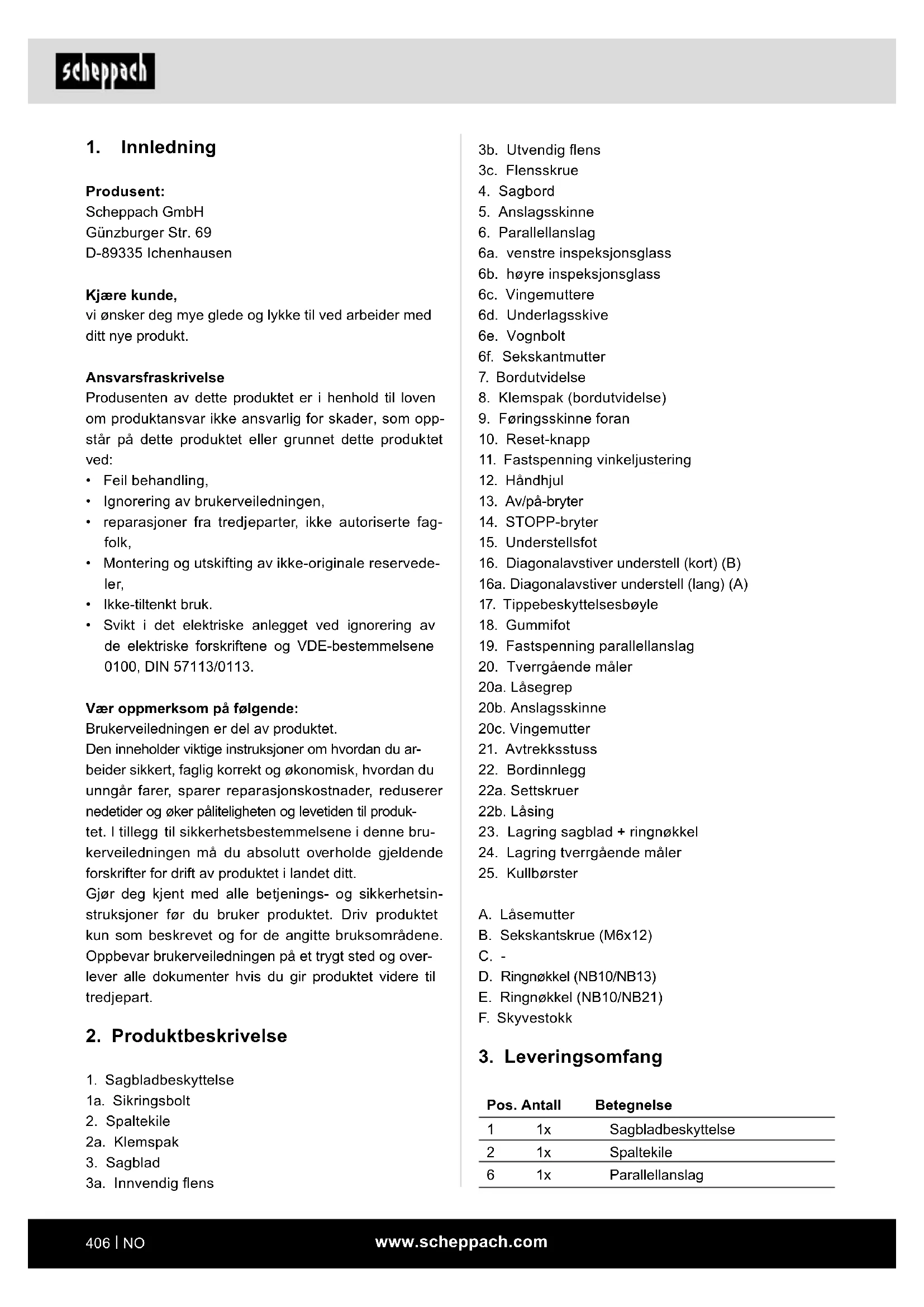 - Helseskadelige utslipp av trestøv ved bruk i lukkede rom. Forklaring av signalordene i brukerveiledningen FARE Signalord for å indikere en overhengende farlig situasjon som, hvis den ikke unngås, vil resultere i død eller alvorlig personskade. ADVARSEL Signalord for å indikere en mulig farlig situasjon som, hvis den ikke unngås, kan føre til død eller alvorlig personskade. FORSIKTIG Signalord for å indikere en potensielt farlig situasjon som, hvis den ikke unngås, kan føre til mindre eller moderat personskade. OBS Signalord for å indikere en mulig farlig situasjon som, hvis den ikke unngås, kan føre til materielle skader på produktet eller eiendom/eiendeler. 15 4x Understellsfot 16 2x Diagonalavstiver understell (kort) (B) 16 a 2x Diagonalavstiver understell (lang) (A) 17 2x Tippebeskyttelsesbøyle 18 4x Gummifot 20 1x Tverrgående måler 20b 1x Anslagsskinne (tverrgående måler) A 28x Låsemutter B 28x Sekskantskrue (M6x12) D 1x Ringnøkkel (NB10/NB13) E 1x Ringnøkkel (NB10/NB21) F 1x Skyvestokk 1x Bruksanvisning