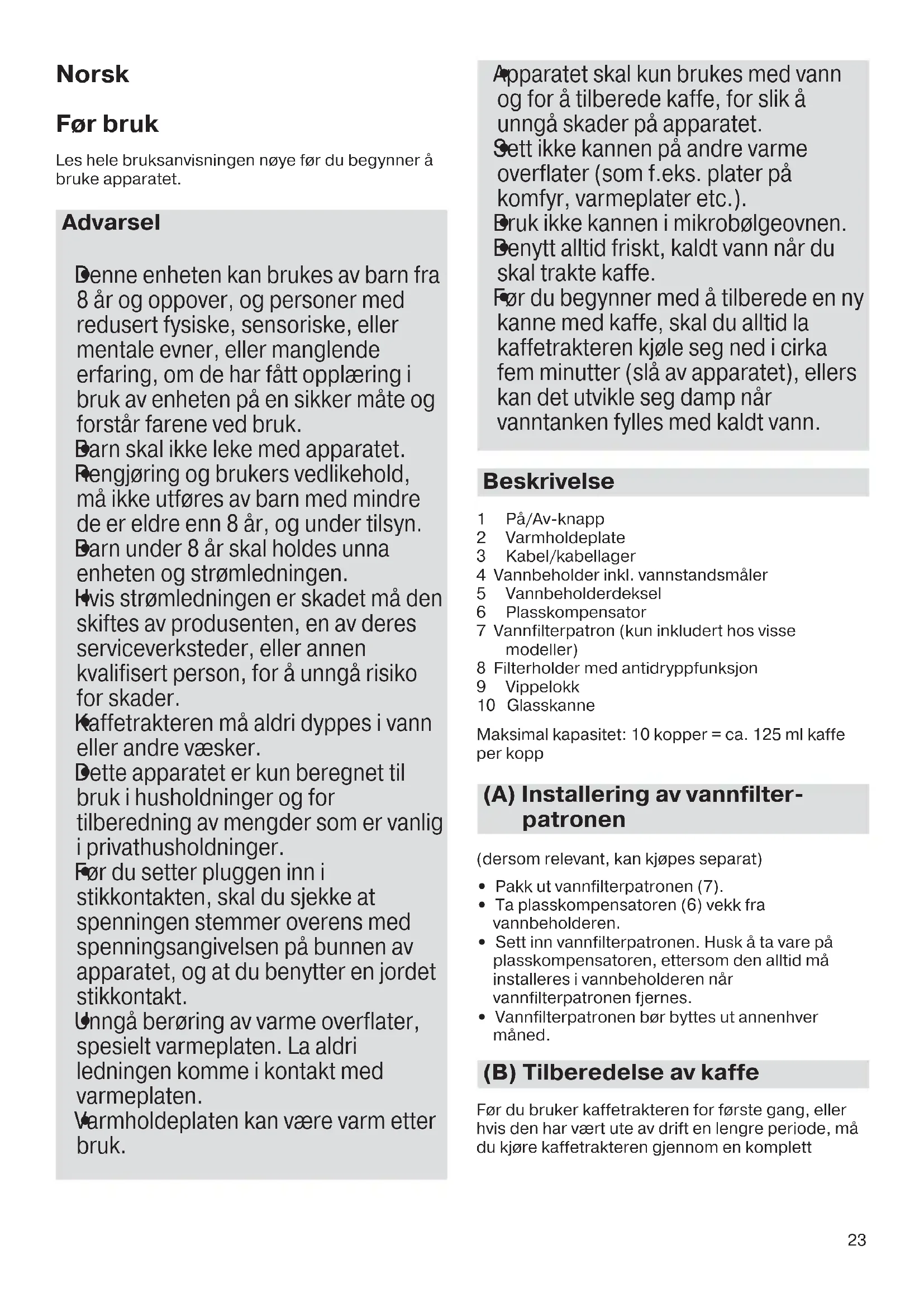 - Vannfilterpatronen bør byttes ut annenhver måned. (B) Tilberedelse av kaffe Før du bruker kaffetrakteren for første gang, eller hvis den har vært ute av drift en lengre periode, må du kjøre kaffetrakteren gjennom en komplett 23traktesyklus uten kaffegrut. Bruk en full kanne (10 kopper) av friskt, kaldt vann.