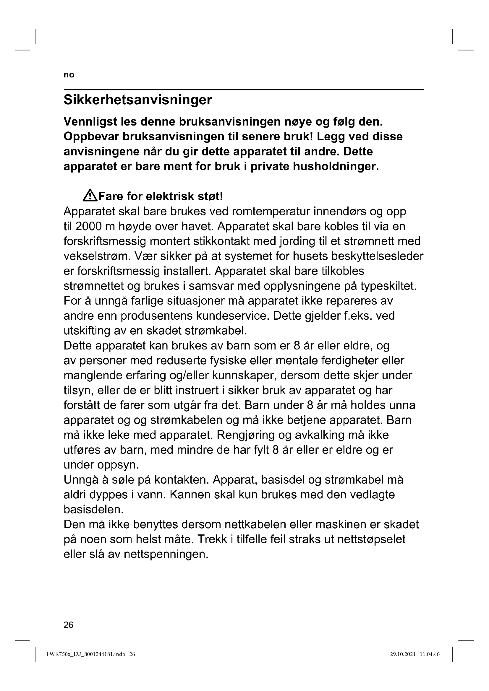 ADVARSEL: Dette apparatet må ikke brukes i nærheten av badekar, dusj vask eller andre beholdere som er fylt med vann. WKvelningsfare! La aldri små barn leke med innpakningsmaterialet. WFare for skade! Feil bruk av apparatet kan føre til personskader. WObs! Rengjøring av overater som kommer i kontakt med næringsmidler! De spesielle instruksjonene om rengjøring i veiledningen skal følges. TWK750x_EU_8001244181.indb 26TWK750x_EU_8001244181.indb 26 29.10.2021 11:04:4629.10.2021 11:04:4627