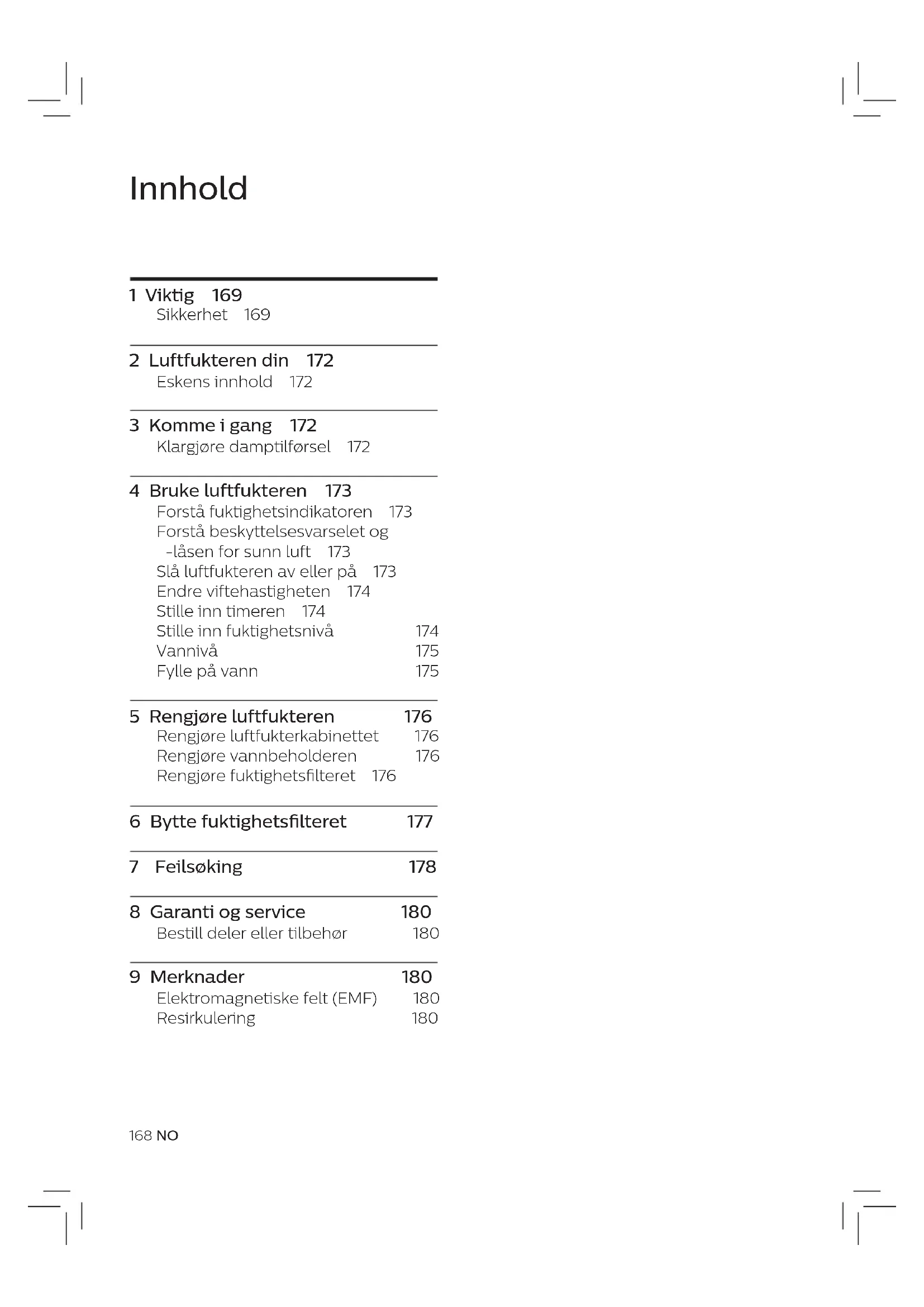 - For å oppnå mest mulig fukt kan du legge lteret i vann i 30 minutter før bruk. 3 Monter det nye fuktighetslteret rundt lterstøtten (g d). 4 Sett fuktighetslteret og lterstøtten tilbake i vannbeholderen (g. e). 5 Fyll vannbeholderen med kaldt springvann til vannet når indikasjonen for maksimumsnivå (g f). 6 Plasser den øvre enheten tilbake på vannbeholderen (g. g). 2 Luftfukteren din Gratulerer med kjøpet, og velkommen til Philips! Hvis du vil dra full nytte av støtten som Philips tilbyr, kan du registrere produktet ditt på www.philips.com/welcome. Luftfukteren fra Philips gir frisk, fuktig luft til hjemmet for sunnere inneklima. Den har et avansert fordampingssystem med NanoCloud-teknologi og et spesielt fuktighetslter som slipper ut H2O-molekyler i tørr luft, og produserer sunn og fuktig luft uten dugg. Fuktighetslteret holder på bakterier, kalsium og andre partikler fra vannet. Derfor får du ren og fuktig luft i hjemmet. Aldri mer tørr luft om vinteren eller fra klimaanlegget. Les denne bruksanvisningen nøye før du installerer og bruker luftfukteren. Ta vare på den for fremtidig bruk. Eskens innhold Kontroller og identiser innholdet i pakken (g. a): A Øvre enhet B Fuktighetslter (FY2402) C Filterstøtte D Flåte E Vannbeholder F Brukerhåndbok G Garanti173NO Norsk Beskyttelseslåsen for sunn luft sørger alltid for at luftfukteren slutter å fungere når vannbeholderen er tom for vann. Når vannbeholderen er tom og må fylles, slår beskyttelseslåsen for sunn luft av luftfukteren etter 30 minutter, og en rød indikator lyser. Når du fyller vannbeholderen på riktig måte, slås luftfukteren på igjen. Merk