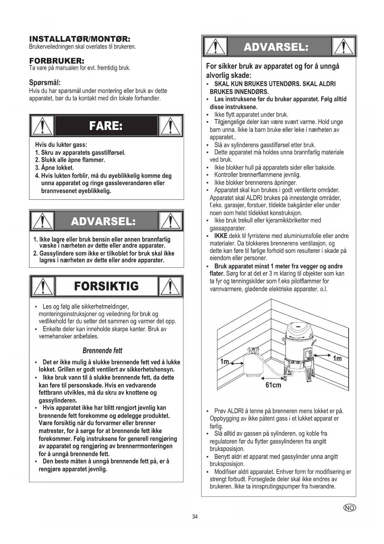 VarmeskjoldKontrolpaneletBrænderrørFjern skruer34 INSTALLATØR/MONTØR: Brukerveiledningen skal overlates til brukeren. FORBRUKER: Ta vare på manualen for evt. fremtidig bruk. Spørsmål: Hvis du har spørsmål under montering eller bruk av dette apparatet, bør du ta kontakt med din lokale forhandler. FARE: Hvis du lukter gass:1. Skru av apparatets gasstilførsel.2. Slukk alle åpne flammer.3. Åpne lokket.4. Hvis lukten forblir, må du øyeblikkelig komme deg unna apparatet og ringe gassleverandøren eller brannvesenet øyeblikkelig. ADVARSEL: 1. Ikke lagre eller bruk bensin eller annen brannfarlig væske i nærheten av dette eller andre apparater.2. Gassylindere som ikke er tilkoblet for bruk skal ikke lagres i nærheten av dette eller andre apparater. FORSIKTIG Ÿ Les og følg alle sikkerhetmeldinger, monteringsinstruksjoner og veiledning for bruk og vedlikehold før du setter det sammen og varmer det opp.Ÿ Enkelte deler kan inneholde skarpe kanter. Bruk av vernehansker anbefales. Brennende fett Ÿ Det er ikke mulig å slukke brennende fett ved å lukke lokket. Grillen er godt ventilert av sikkerhetshensyn.Ÿ Ikke bruk vann til å slukke brennende fett, da dette kan føre til personskade. Hvis en vedvarende fettbrann utvikles, må du skru av knottene og gassylinderen.Ÿ Hvis apparatet ikke har blitt rengjort jevnlig kan brennende fett forekomme og ødelegge produktet. Være forsiktig når du forvarmer eller brenner matrester, for å sørge for at brennende fett ikke forekommer. Følg instruksene for generell rengjøring av apparatet og rengjøring av brennerrmonteringen for å unngå brennende fett.Ÿ Den beste måten å unngå brennende fett på, er å rengjøre apparatet jevnlig. ADVARSEL: Ÿ Prøv ALDRI å tenne på brenneren mens lokket er på. Oppbygging av ikke påtent gass i et lukket apparat er farlig.Ÿ Slå alltid av gassen på sylinderen, og koble fra regulatoren før du flytter gassylinderen fra angitt bruksposisjon.Ÿ Benytt aldri et apparat med gassylinder unna angitt bruksposisjon.Ÿ Modifiser aldri apparatet. Enhver form for modifisering er strengt forbudt. Forseglede deler skal ikke endres av brukeren. Ikke ta innsprutingspumper fra hverandre.Ÿ SKAL KUN BRUKES UTENDØRS. SKAL ALDRI BRUKES INNENDØRS.Ÿ Les instruksene før du bruker apparatet. Følg alltid disse instruksene.Ÿ Ikke flytt apparatet under bruk.Ÿ Tilgjengelige deler kan være svært varme. Hold unge barn unna. Ikke la barn bruke eller leke i nærheten av apparatet..Ÿ Slå av sylinderens gasstilførsel etter bruk.Ÿ Dette apparatet må holdes unna brannfarlig materiale ved bruk.Ÿ Ikke blokker hull på apparatets sider eller bakside.Ÿ Kontroller brennerflammene jevnlig.Ÿ Ikke blokker brennerens åpninger.Ÿ Apparatet skal kun brukes i godt ventilerte områder. Apparatet skal ALDRI brukes på innestengte områder, f.eks. garasjer, forstuer, tildekte bakgårder eller under noen som helst tildekket konstruksjon.Ÿ Ikke bruk trekull eller kjeramikkbriketter med gassapparater.Ÿ IKKE dekk til fyrristene med aluminiumsfolie eller andre materialer. Da blokkeres brennerens ventilasjon, og dette kan føre til farlige forhold som resulterer i skade på eiendom eller personer.Ÿ Bruk apparatet minst 1 meter fra vegger og andre flater. Sørg for at det er 3 m klaring til objekter som kan ta fyr og tenningskilder som f.eks pilotflammer for vannvarmere, glødende elektriske apparater, o.l. For sikker bruk av apparatet og for å unngå alvorlig skade: