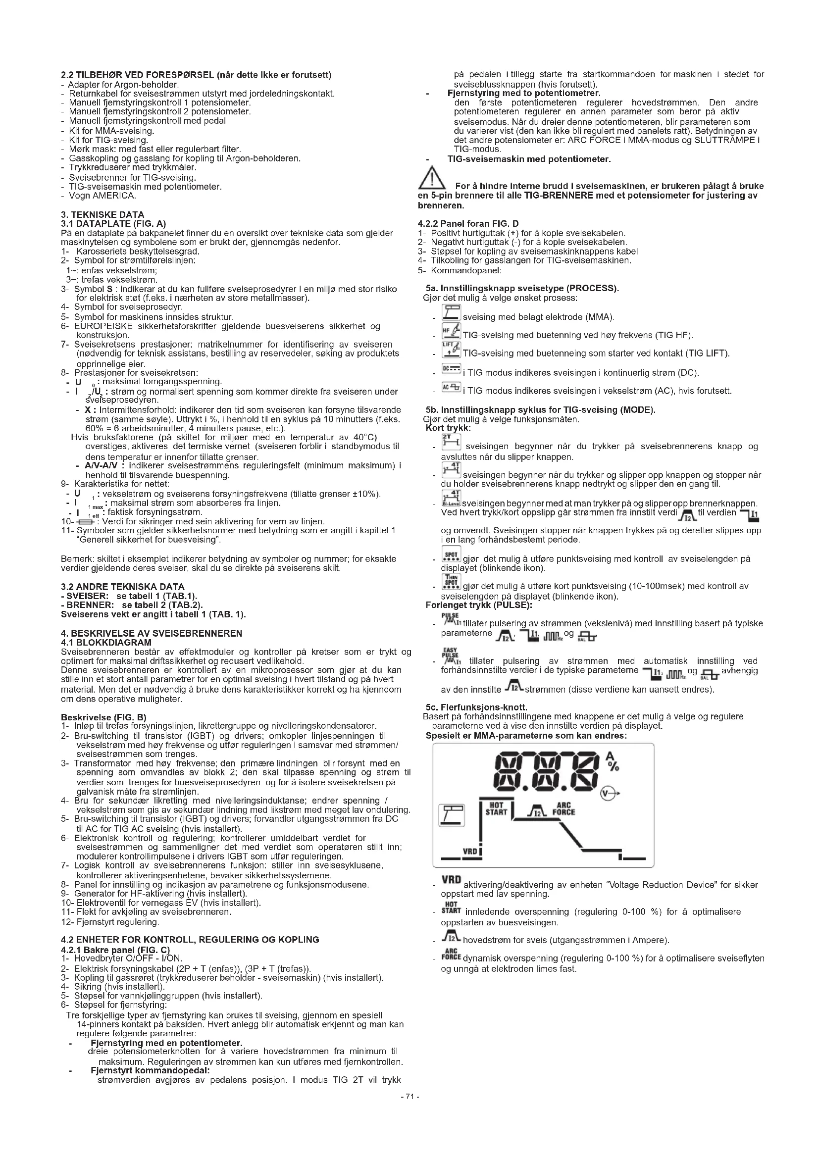 8.FEILSØKING........................................................................................................73 s. s. SVEISEBRENNER MED INVERTER FOR TIG- OG MMA-SVEISING FOR BRUK I INDUSTRIEROGNDUSTRIELTOGPROFESJONELTBRUK. Bemerk:itekstennedenforbrukestermen“sveisebrenner”. 1.GENERELLSIKKERHETFORBUESVEISING Operatøren må´ha tilstrekkelig kjenndom for å garantere et sikkert bruk av sveiseren og han må ha kjenndom om risikoene med buesveising, forholdsregneleogprosedyrenefornødsituasjoner. (Seogsånorm“EN60974-9:Apparatertilbuesveising.Avsnitt9:Installasjon ogbruk”). - Unngådirekte kontaktmedsveisekretsen, spenningen frasveisebrenneren utenbelastningkanværefarliginoentilfeller. - Koplingen av sveisekablene, operasjonene for kontroll og reparasjon må utföresmedsveisebrennerenslåttavogfrakopletfrastrømnettet. - Slå av sveisebrenneren og frakople den fra strømforsyningsnettet för du skifterutslitnedelerepåsveisebrenneren. - Utfør tilkoplingen til strømnettet i henhold til generelle sikkerhetslover og bestemmelser. -Sveisebrennerenmåforsynesmedstrømbarefraetforsyningssystemmed nøytraljordeledning. - Kontrollerattilførselsledningensjordingfungerer. - Brukikkesveisebrennerenifuktigeellerpåvåtesteder,ikkesveisuteiregnet. - Brukikkekablermedutslittisolasjonellerløsekontakter. - Ikkesveis påbeholdere,bokserellerrør sominnholderellerharinneholdt brennbarematerialer,gasserellervæsker. - Unngåå arbeide på overater som er rengjort med klorholdige løsemidler ellerinærhetenavslikeløsemidler. - Sveisaldripåbeholdereundertrykk. - Fjernaltbrennbartmaterialefraarbeidsstedet(f.eks.tre,papir,kluteretc.). - Sørgforskikkeligventilasjonellerutstyrforfjerningavsveiserøykinærheten avbuen;deterviktigåutføreensystematiskvurderingavgrenseverdienefor sveiserøykenIoverensstemmelsemedsammensetningen,konsentrasjonen ogvarighetenavkontakten. - Holdbeholderenbortefravarmekilderogdirektesollys(hvisbrukt). - Brukenelektriskisolasjonsomeregnettilbrenneren,stykketsombearbeides ognoenjordetmetalldelersomerplassertinærheten(tilgjengelig). Detteoppnåsnormaltvedåbrukehansker,skor,hjelmogklærgittfordette formålet,ogvedbrukavisolasjonsramperellertepper. - BeskyttalltidøynenemedltrenesomskalbrukesihenholdtilUNIEN169 ellerUNIEN379dersomdeermontertpåmaskerellerhjelmerisamsvarmed UNIEN175. Brukpassendeverneklærsomerbrannhemmende(i samsvar medUNIEN 11611)ogsveisehansker(ihenholdtilUNIEN12477)foråunngåeksponering avhudenforultraolettoginfrarødstrålingprodusertavbuen.Beskyttelsen bør bli utvidet til andre mennesker i nærheten lysbuen ved hjelp av ikke- reekterendeskjermerellergardiner. - Støy:Dersomsveisingenerspesieltintensiv,ogdetoppståetnivåavdaglig eksponering(LEPd)somtilsvarerellermerenn85dB(A),erdetobligatorisk åbrukeegnetpersonligverneutstyr(Tabell1). -Overgangenavsveisespenningenførertilelektromagnetiskefelt(EMF)ved sveisekretsen. De elektromagnetiske feltene kan interferire med noen medisinske apparater (f.eks.pace-maker,åndningsmaskiner,metallproteseretc.). Deternødvendigåutføreverneprosedyrerforpersonenesomskalhapåseg disseapparatene.Foreksempelskaldeikkegåbortisveiserensbruksområde. Dennesveisebrennerenoppfyllerkraveneforproduktetstekniskestandardfor eksklusiv bruk i industrimiljøer og for profesjonal anvendelse. Vi garanterer ikke overensstemmelse med grenseverdiene når det gjelder kontakt med elektromagnetiskefeltihjemmetformennesker. Operatøren skal bruke følgende prosedyrer for å minke all kontakt med elektromagnetiskefelt: - Installerdetosveisekablenesånærehverandresommulig. - Holdhodetogkroppensålangtbortesommuligfrånsveisekretsen. - Lindealdrigsveisekablenerundtkroppen. - Du skal aldri sveise med kroppen i sveisekretsen. Hold begge kablene på sammesideavkroppen. - Koplereturkabelnforsveisespenningentilstykketsomskalsveisessånære somsmuligtilskjøtensomskaldannes. - Du skal ikke sveise ved å oppholde deg eller støtte deg ved helt nære sveisebrenneren(mindsteavstand:50cm). - Laaldrigmagnetiskeformålavjernværeinærhetenavsveisekretsen. - Mindsteavstandd=20cm(FIG.O). -ApparatavklasseA: Dennesveisebrennerenoppfyllerkraveneforproduktetstekniskestandardfor eksklusivbrukiindustrimiljøerogforprofesjonalanvendelse.Vigarantererikke overensstemmelsemeddenelektromagnetiskeoverensstemmelsenibygninger medleiligheterelleribygningersomerdirektkoplettiletforsyningsnettmed lavspenningsomforsynerbygningenemedleiligheter. EKSTRA FORHOLDSREGLER - SVEISEOPERASJONER: - Imiljöermedstorrisikoforelektriskstøt. - Iavgrensetmijøer. - Inærværavlettantenneligeelleresplosivematerialer. MÅdeførstblivurdertaven“Ansvarligekspert”ogsidenblifullførtinærvær avandrepersonermednødvendigekjenndommerifallavnødsituasjoner. ManMÅbrukedetekniskevernesystemenesomerbeskrvetei7.10;A.8;A.10. inormen “EN60974-9:Apparater til buesveising.Avsnitt9: Installasjonog bruk”. -Det er forbudt å svelse med operatøren oppløft fra gulvet, med unntak av eventueltbrukavsikkerhetsramper. -SPENNINGMELLOMELEKTRODHOLDERELLERBRENNER:hvisduarbeider mederesveisererpåendelellerpådelersomerkopletmellomhverandre påelektriskmåte,kanfarligelektrisitetpåtomgangoppståmellomdeulike elektrodholdereellerbrennere,medetverdisomkanværedobbeltsåstorti henholdtiltillattgrenseverdi. Deternødvendigatenorganisatørmederfareingeravgjørhvisderernoen risikoer,slikatmankanbrukeverneutstyrsomeregnet,isamsvarmed7.9 inormen “EN60974-9:Apparater til buesveising.Avsnitt9: Installasjonog bruk”. ANDRE RISIKOER - VELTING:plassersveiserenpåenhorisontaloveratemedlempeligkapasitet ihenholdtilmassen;ellers(f.eks.gulvmedskråninger,ujevntgulv,etc),er derfareforvelting. -GALT BRUK: det er farlig å bruke sveiseren for prosedyrer som ikke er beskrevetibrukerveiledningen(f.eks.foråtineopprørivannettet). - Deterforbudtåbrukehåndtaketforåhengesveisemaskinenopp. 2.INNLEDNINGOGALMINDELIGBESKRIVELSE 2.1PRESENTASJON Denne sveisebrenneren er en strømkilde for buesveising, utført spesielt for