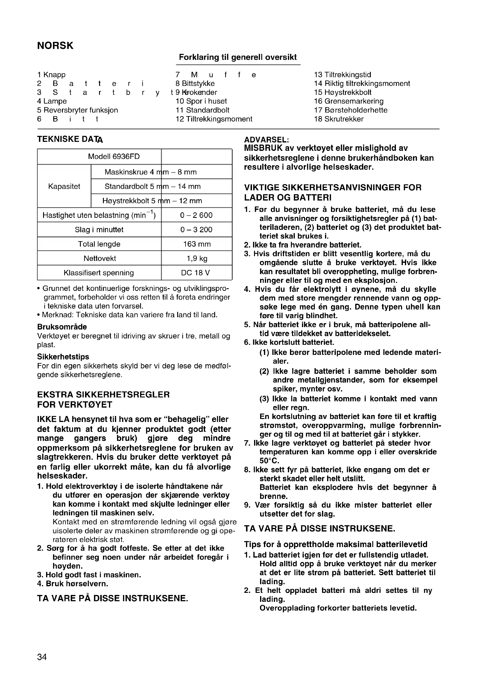 TA VARE PÅ DISSE INSTRUKSENE. ADVARSEL: MISBRUK av verktøyet eller mislighold av sikkerhetsreglene i denne brukerhåndboken kan resultere i alvorlige helseskader.