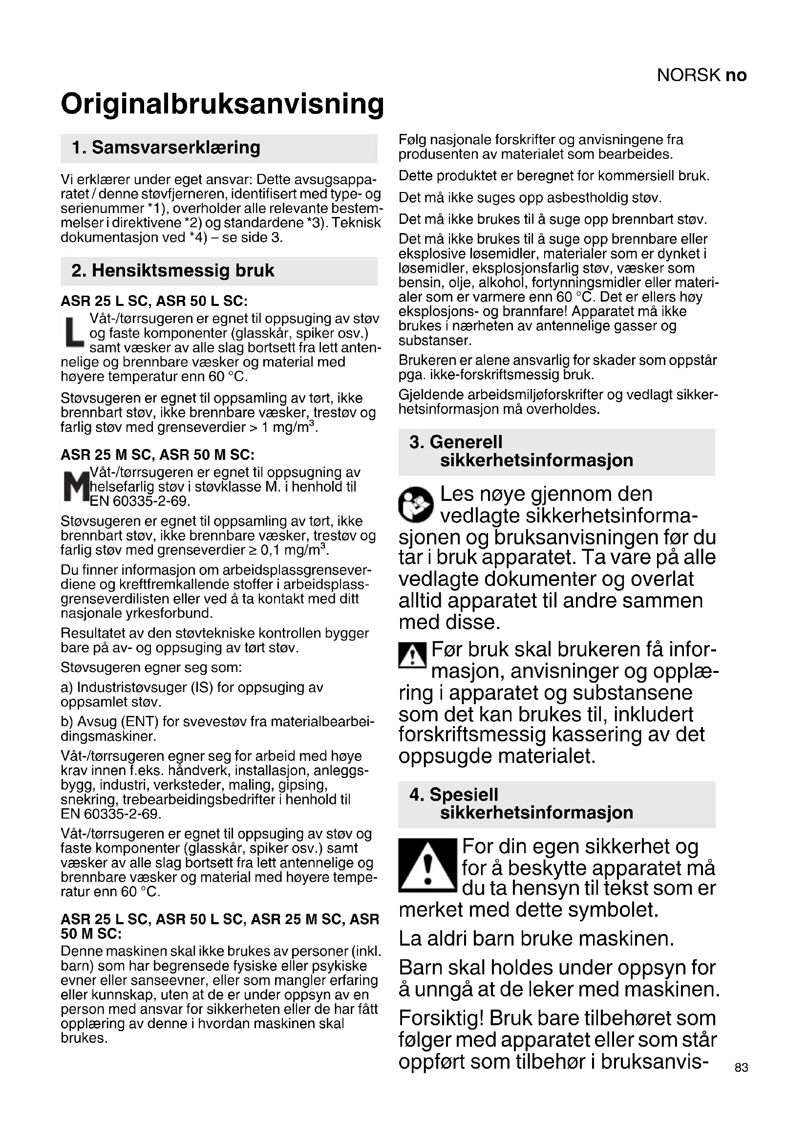 Originalbruksanvisning Vi erklærer under eget ansvar: Dette avsugsappa- ratet / denne støvfjerneren, identifisert med type- og serienummer *1), overholder alle relevante bestem- melser i direktivene *2) og standardene *3). Teknisk dokumentasjon ved *4) – se side 3. ASR 25 L SC, ASR 50 L SC: Våt-/tørrsugeren er egnet til oppsuging av støv og faste komponenter (glasskår, spiker osv.) samt væsker av alle slag bortsett fra lett anten- nelige og brennbare væsker og material med høyere temperatur enn 60 °C. Støvsugeren er egnet til oppsamling av tørt, ikke brennbart støv, ikke brennbare væsker, trestøv og farlig støv med grenseverdier > 1 mg/m³. ASR 25 M SC, ASR 50 M SC: Våt-/tørrsugeren er egnet til oppsugning av helsefarlig støv i støvklasse M. i henhold til EN 60335-2-69. Støvsugeren er egnet til oppsamling av tørt, ikke brennbart støv, ikke brennbare væsker, trestøv og farlig støv med grenseverdier ≥ 0,1 mg/m³. Du finner informasjon om arbeidsplassgrensever- diene og kreftfremkallende stoffer i arbeidsplass- grenseverdilisten eller ved å ta kontakt med ditt nasjonale yrkesforbund. Resultatet av den støvtekniske kontrollen bygger bare på av- og oppsuging av tørt støv. Støvsugeren egner seg som: a) Industristøvsuger (IS) for oppsuging av oppsamlet støv. b) Avsug (ENT) for svevestøv fra materialbearbei- dingsmaskiner. Våt-/tørrsugeren egner seg for arbeid med høye krav innen f.eks. håndverk, installasjon, anleggs- bygg, industri, verksteder, maling, gipsing, snekring, trebearbeidingsbedrifter i henhold til EN 60335-2-69. Våt-/tørrsugeren er egnet til oppsuging av støv og faste komponenter (glasskår, spiker osv.) samt væsker av alle slag bortsett fra lett antennelige og brennbare væsker og material med høyere tempe- ratur enn 60 °C. ASR 25 L SC, ASR 50 L SC, ASR 25 M SC, ASR 50 M SC: Denne maskinen skal ikke brukes av personer (inkl. barn) som har begrensede fysiske eller psykiske evner eller sanseevner, eller som mangler erfaring eller kunnskap, uten at de er under oppsyn av en person med ansvar for sikkerheten eller de har fått opplæring av denne i hvordan maskinen skal brukes. Følg nasjonale forskrifter og anvisningene fra produsenten av materialet som bearbeides. Dette produktet er beregnet for kommersiell bruk. Det må ikke suges opp asbestholdig støv. Det må ikke brukes til å suge opp brennbart støv. Det må ikke brukes til å suge opp brennbare eller eksplosive løsemidler, materialer som er dynket i løsemidler, eksplosjonsfarlig støv, væsker som bensin, olje, alkohol, fortynningsmidler eller materi- aler som er varmere enn 60 °C. Det er ellers høy eksplosjons- og brannfare! Apparatet må ikke brukes i nærheten av antennelige gasser og substanser. Brukeren er alene ansvarlig for skader som oppstår pga. ikke-forskriftsmessig bruk. Gjeldende arbeidsmiljøforskrifter og vedlagt sikker- hetsinformasjon må overholdes. Les nøye gjennom den vedlagte sikkerhetsinforma- sjonen og bruksanvisningen før du tar i bruk apparatet. Ta vare på alle vedlagte dokumenter og overlat alltid apparatet til andre sammen med disse. Før bruk skal brukeren få infor- masjon, anvisninger og opplæ- ring i apparatet og substansene som det kan brukes til, inkludert forskriftsmessig kassering av det oppsugde materialet. For din egen sikkerhet og for å beskytte apparatet må du ta hensyn til tekst som er merket med dette symbolet. La aldri barn bruke maskinen. Barn skal holdes under oppsyn for å unngå at de leker med maskinen. Forsiktig! Bruk bare tilbehøret som følger med apparatet eller som står oppført som tilbehør i bruksanvis-