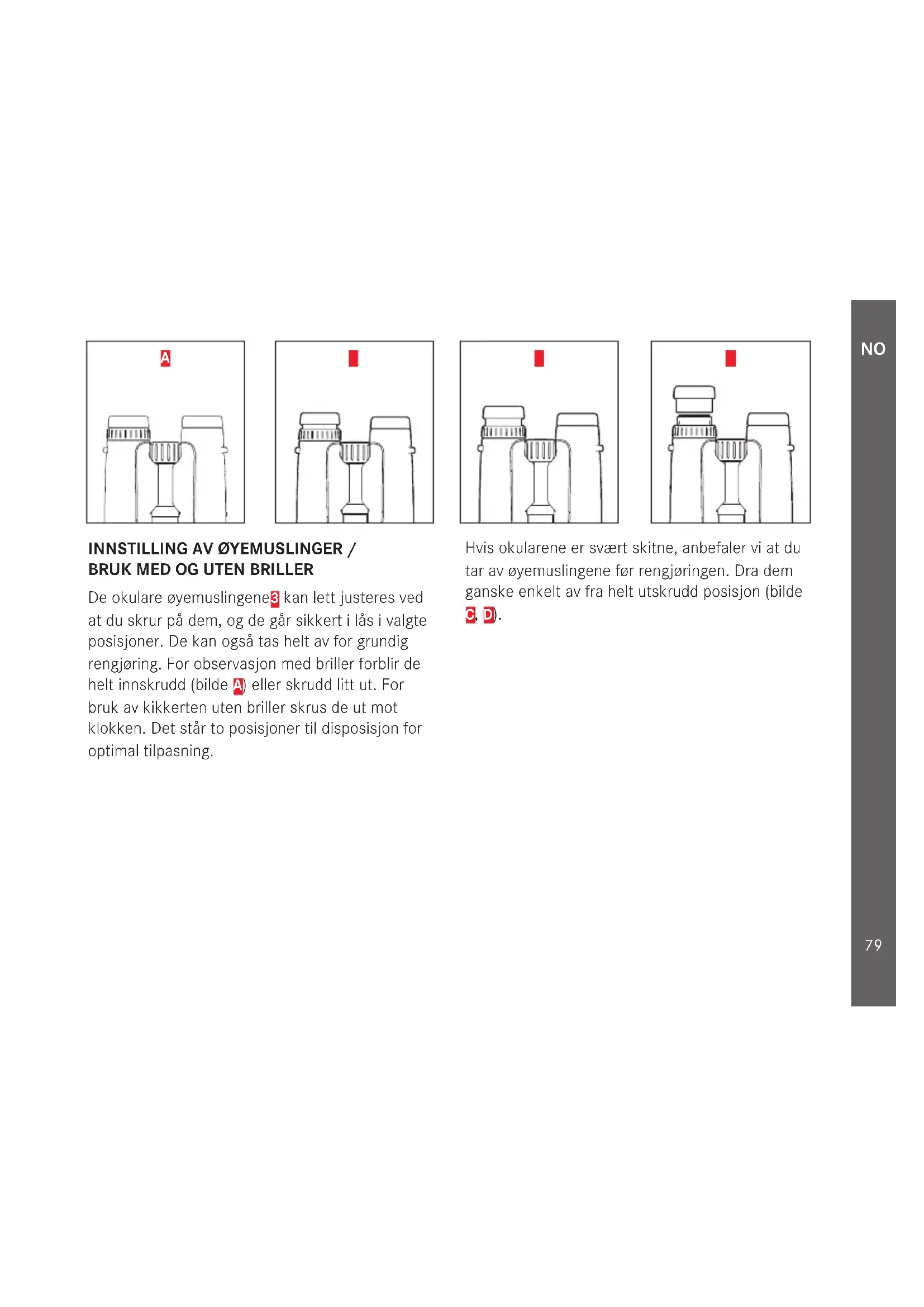 De okulare øyemuslingene 3 kan lett justeres ved at du skrur på dem, og de går sikkert i lås i valgte posisjoner. De kan også tas helt av for grundig rengjøring. For observasjon med briller forblir de helt innskrudd (bilde A) eller skrudd litt ut. For bruk av kikkerten uten briller skrus de ut mot klokken. Det står to posisjoner til disposisjon for optimal tilpasning. Hvis okularene er svært skitne, anbefaler vi at du tar av øyemuslingene før rengjøringen. Dra dem ganske enkelt av fra helt utskrudd posisjon (bilde C, D).
