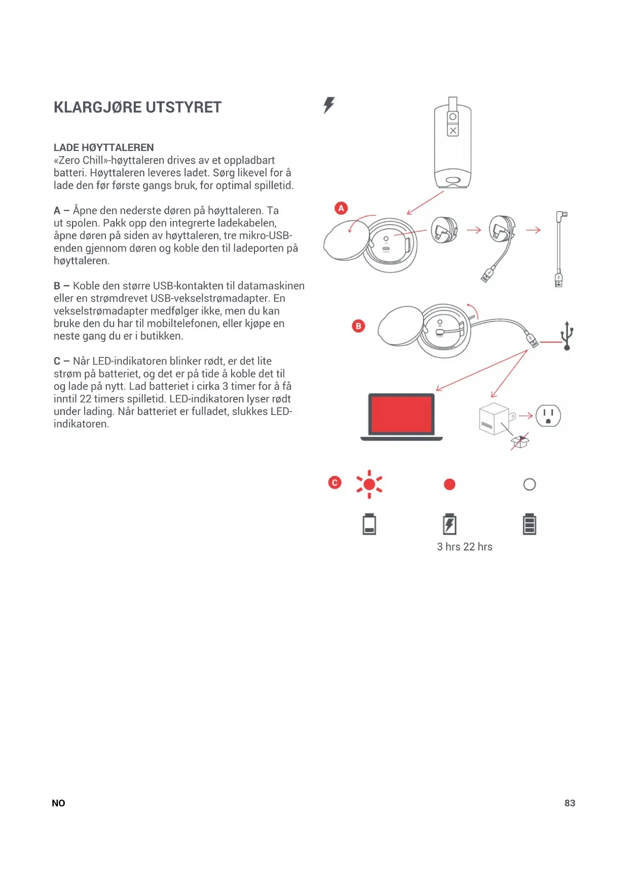 «Zero Chill»-høyttaleren drives av et oppladbart batteri. Høyttaleren leveres ladet. Sørg likevel for å lade den før første gangs bruk, for optimal spilletid. A – Åpne den nederste døren på høyttaleren. Ta ut spolen. Pakk opp den integrerte ladekabelen, åpne døren på siden av høyttaleren, tre mikro-USB- enden gjennom døren og koble den til ladeporten på høyttaleren. B – Koble den større USB-kontakten til datamaskinen eller en strømdrevet USB-vekselstrømadapter. En vekselstrømadapter medfølger ikke, men du kan bruke den du har til mobiltelefonen, eller kjøpe en neste gang du er i butikken. C – Når LED-indikatoren blinker rødt, er det lite strøm på batteriet, og det er på tide å koble det til og lade på nytt. Lad batteriet i cirka 3 timer for å få inntil 22 timers spilletid. LED-indikatoren lyser rødt under lading. Når batteriet er fulladet, slukkes LED- indikatoren. NO84 BRUK