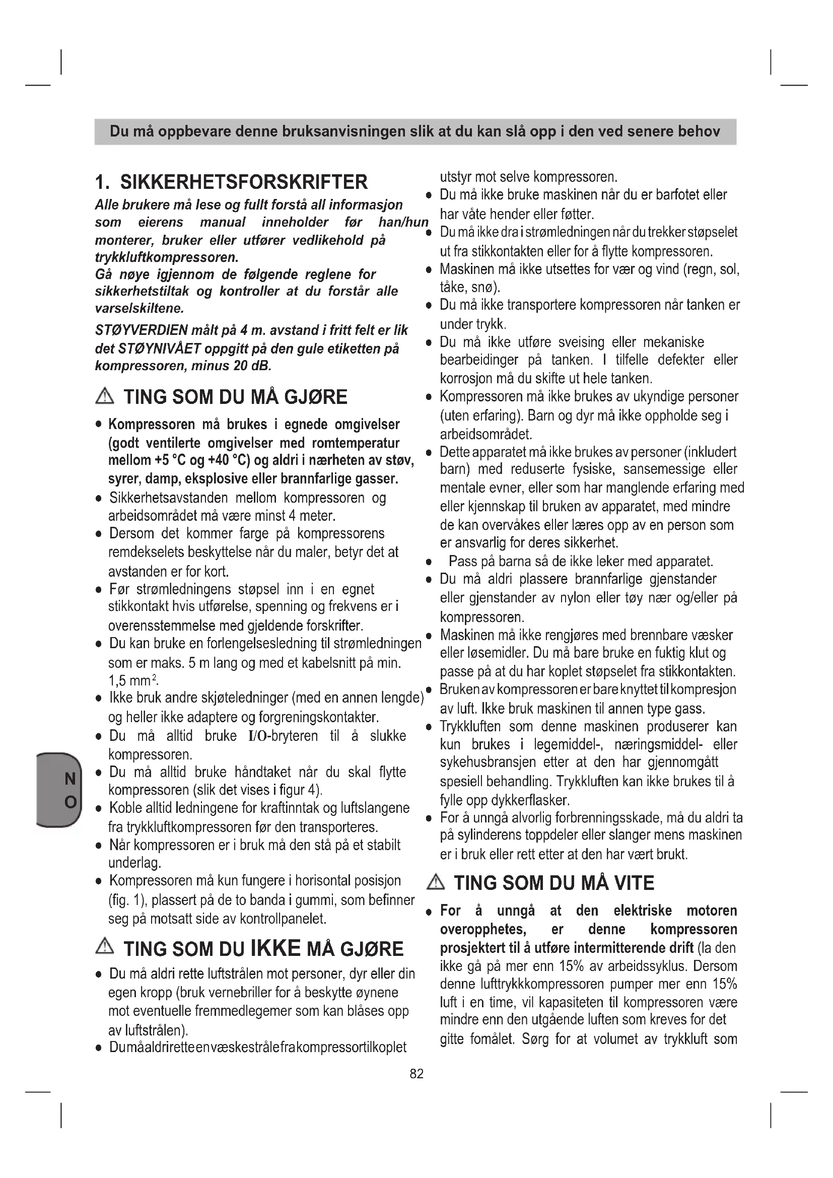 ● Ikke bruk andre skjøteledninger (med en annen lengde) oghellerikkeadaptereogforgreningskontakter. ● Du må alltid bruke I/O-bryteren til å slukke kompressoren. ● Du må alltid bruke håndtaket når du skal flytte kompressoren(slikdetvisesifigur4). ● Koble alltid ledningene for kraftinntak og luftslangene fratrykkluftkompressorenførdentransporteres. ● Når kompressoren er i bruk må den stå på et stabilt underlag. ● Kompressoren må kun fungere i horisontal posisjon (fig.1),plassertpådetobandaigummi,sombefinner segpåmotsattsideavkontrollpanelet. TING SOM DU IKKE MÅ GJØRE ● Du må aldri rette luftstrålen mot personer, dyr eller din egen kropp (bruk vernebriller for å beskytte øynene mot eventuelle fremmedlegemer som kan blåses opp avluftstrålen). ● Du må aldri rette en væskestråle fra kompressortilkoplet utstyrmotselvekompressoren. ● Du må ikke bruke maskinen når du er barfotet eller harvåtehenderellerføtter.