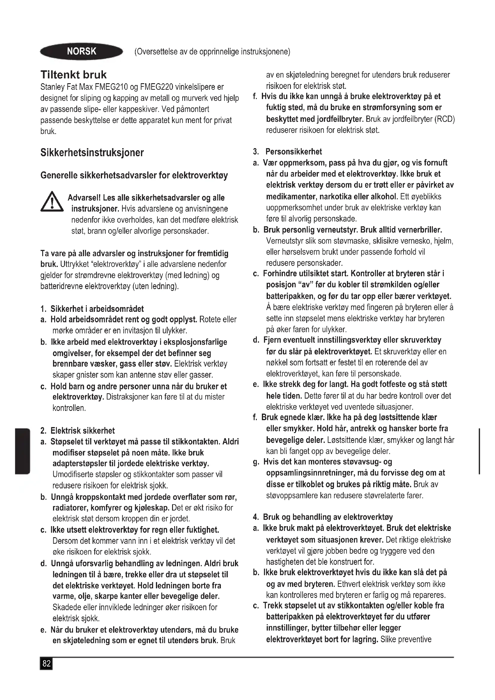 u Plasser tappene på vernet (7) i forhold til fordypningene i navet. Dette vil rette tappene med sporene på girkassedekselet som vist på gur J. u Trykk vernet ned til verntappen kommer inn i sporet på girkassenavet som vist på gur K. u Roter vernet (7) mot klokken for å låse det på plass. Beskyttelseskroppen skal plasseres mellom spindelen og brukeren for å gi maksimal beskyttelse for brukeren som vist på gur L. u Trekk til låseskruen for å sikre vernet på girkassedekselet. Det skal være umulig for deg å rotere vernet for hånd. Ikke bruk sliperen med et løst vern. u For å fjerne vernet skal du løsne vernlåsskruen. Så skal du rotere vernet slik at de tre tappene på vernet (7) innretter seg med de tre sporene på navet og dra opp vernet. Montere kuttehjul u Sett den ugjengede støtteensen på spindelen med forhøyet senter opp (pilot) skal peke oppover. Det forhøyede senteret (pilot) på støtteensen er mot hjulet når det monteres. u Legg skiven på støtteensen, sentrer hjulet på det forhøyede senteret (pilot). u Installer den gjengede festemutteren med forhøyet senter (pilot) bort fra hjulet.89 (Oversettelse av de opprinnelige instruksjonene) NORSK u Trykk ned spindellåsknappen og stram festemutteren med skiftenøkkelen som følger med. u For å fjerne hjulet, hold nede spindelåsknappen og løsne den gjengede festemutteren med skiftenøkkelen som følger med. Advarsel! Ikke bruk skiver for kantsliping/kapping for sliping av overater, da slike skiver ikke er designet for sidetrykk som oppstår ved overatesliping. Det kan føre til at skivene brekker og til personskader. u La verktøyet komme opp i full hastighet før du lar det berøre arbeidsoveraten. u Bruk minimalt trykk mot arbeidsaten for å la verktøyet gå med full hastighet. Slipehastigheten er høyest når verktøyet går med høy hastighet. u Når du har startet et kutt og har laget et spor i arbeidsstykket, ikke endre vinkelen på kuttet. Endring av vinkelen kan føre til at skiven bøyer seg og kan brekke. u Løft verktøyet fra arbeidsaten før du slår verktøyet av. La verktøyet stoppe rotasjonen før du legger det ned. Bruk Advarsel! La verktøyet arbeide i sin egen hastighet. Må ikke overbelastes. u Før ledningen med varsomhet for å unngå å kutte den ved et uhell. u Vær forberedt på en strøm av gnister når slipe- eller kutteskiven berører arbeidsstykket. u Plasser alltid verktøyet slik at vernet gir maksimal beskyttelse mot slipe eller kutteskiven. Slå på og av u Trykk på av/på-knappen (1) for å slå verktøyet på. u Slipp av/på-knappen (1) for å slå verktøyet av. Advarsel! Ikke slå verktøyet av mens det er belastet. Råd for optimal bruk u Hold verktøyet fast med den ene hånden rundt sidehåndtaket og den andre hånden rundt hovedhåndtaket. u Når du sliper, må du alltid opprettholde en vinkel på ca. 15° mellom skiven og arbeidsstykkets overate. Vedlikehold Det nettdrevne/batteridrevne Stanley Fat Max-apparatet/- verktøyet er konstruert for å være i drift over lengre tid med et minimum av vedlikehold. For at den skal fungere tilfredsstillende over tid, er det viktig å sørge for riktig stell av verktøyet og regelmessig renhold. Advarsel! Før du utfører vedlikehold på elektriskdrevet/ batteridrevet elektroverktøy: u Slå av apparatet/verktøyet og trekk ut støpselet. u Eller slå av apparatet/verktøyet og fjern batteriet fra dette hvis apparatet/verktøyet har separat batteripakke. u Eller la batteriet gå helt tomt hvis det er innebygd, og slå deretter av. u Fjern laderen fra stikkontakten før du rengjør den. Laderen krever ikke annet vedlikehold enn regelmessig rengjøring. u Rengjør ventilasjonsåpningene i apparatet/verktøyet/ laderen jevnlig med en myk børste eller tørr klut. u Rengjør motorhuset regelmessig med en fuktig klut. Ikke bruk slipende eller løsemiddelbaserte rengjøringsmidler. u Åpne chucken regelmessig, og bank på den for å fjerne eventuelt støv fra innsiden (hvis det er aktuelt). Feilsøking Problem Mulig årsak Mulig løsning Enheten starter ikke. Strømkabelen er ikke satt inn. Strømkabel eller bryter er skadet. Sett inn strømkabelen i en fungerende stik- kontakt. Få byttet ledningen eller bryteren ved et Stanley Fat Max- servicesenter eller et autorisert verksted.) Diagram over tilbehør for sliping og kutting 115mm slipehjul Type 27-vern Type 27-vern Ugjenget bakre ens Type 27 hjul med nav Type 27-skive med midtstilt trykk Gjenget klemmemutter90 (Oversettelse av de opprinnelige instruksjonene) NORSK 115mm sandpapir-lamellskiver Type 27-vern Type 27-vern Sandpapir lamellskiver med nav Ugjenget bakre ens Sandpapir lamellskiver uten nav Gjenget klemmemutter 115mm type 41 kuttehjul Type 41-vern Type 41-vern Underlagsens Underlagsens Kappehjul Diamantkutteskiver Klemmemutter Klemmemutter Trådskiver Type 27-vern Type 27-vern 3 tommers stålbørstekopp 4 tommers stålbørstekopp Sandpapirskiver Underlagsskive i gummi Sandpapirskive Gjenget klemmemutter Miljøvern