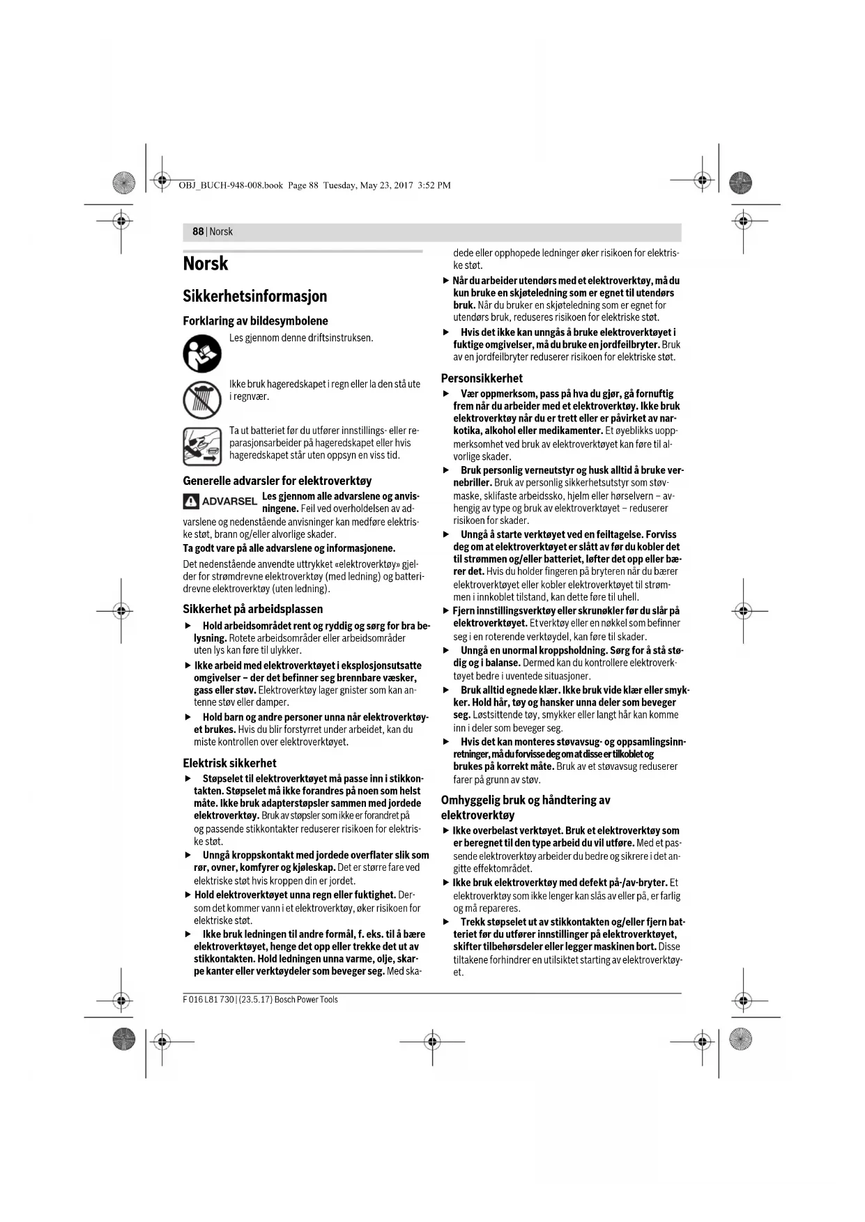 - avhengig av benyttet batteri OBJ_BUCH-948-008.book Page 91 Tuesday, May 23, 2017 3:52 PM92 | Norsk F 016 L81 730 | (23.5.17) Bosch Power Tools Ikke bruk 4,0 Ah batteriet sammen med dette elektro- verktøyet. Støy-/vibrasjonsinformasjon Støyutslippsverdier målt i henhold til EN 60745-2-15. Maskinens A-bedømte typiske støynivå er: Lydtrykknivå 67 dB(A); lydeffektnivå 87 dB(A). Usikkerhet K =3 dB. Bruk hørselvern! Totale svingningsverdier a
