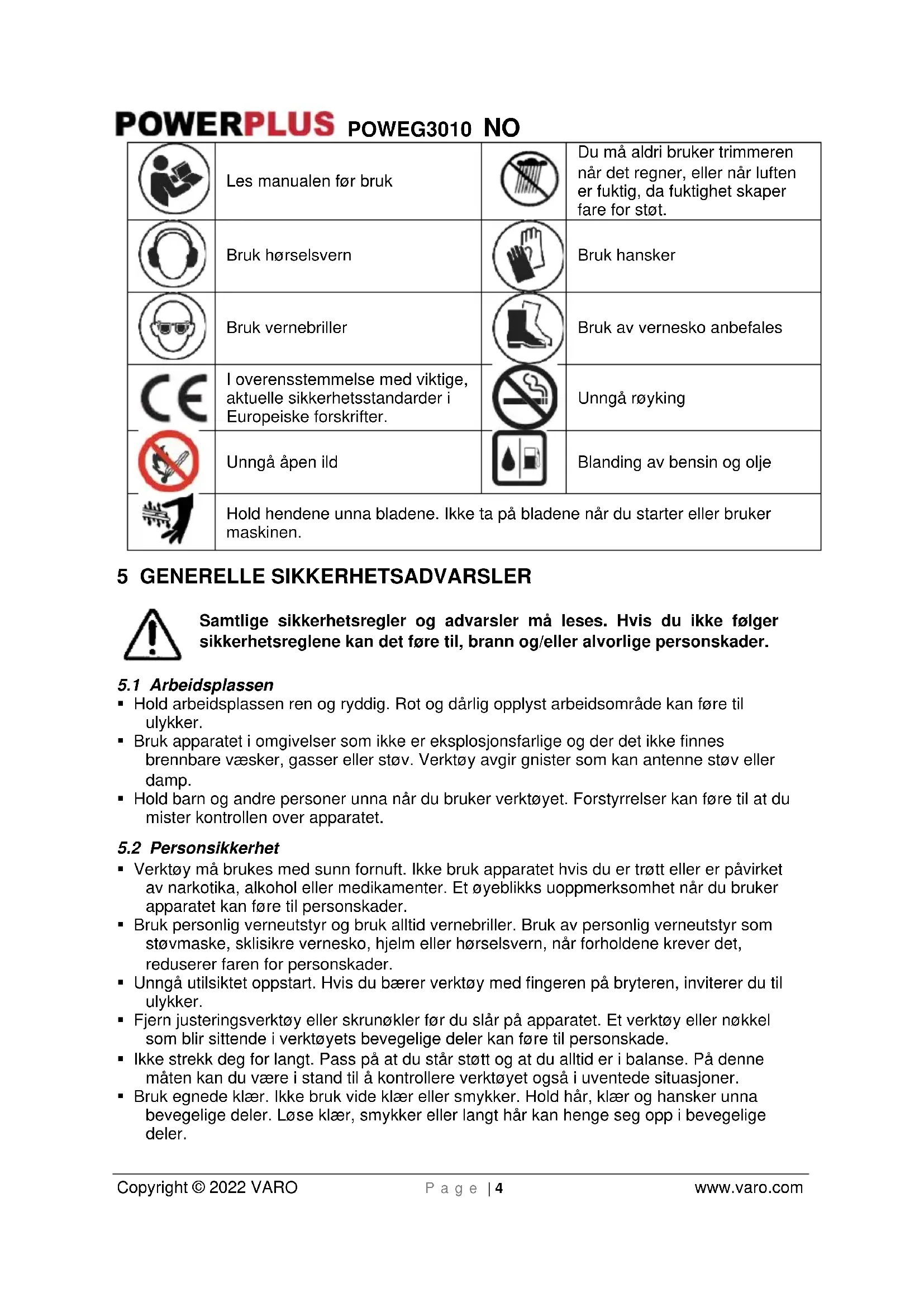 - Bruk egnede klær. Ikke bruk vide klær eller smykker. Hold hår, klær og hansker unna bevegelige deler. Løse klær, smykker eller langt hår kan henge seg opp i bevegelige deler.POWEG3010 NO Copyright © 2022 VARO P a g e | 5 www.varo.com