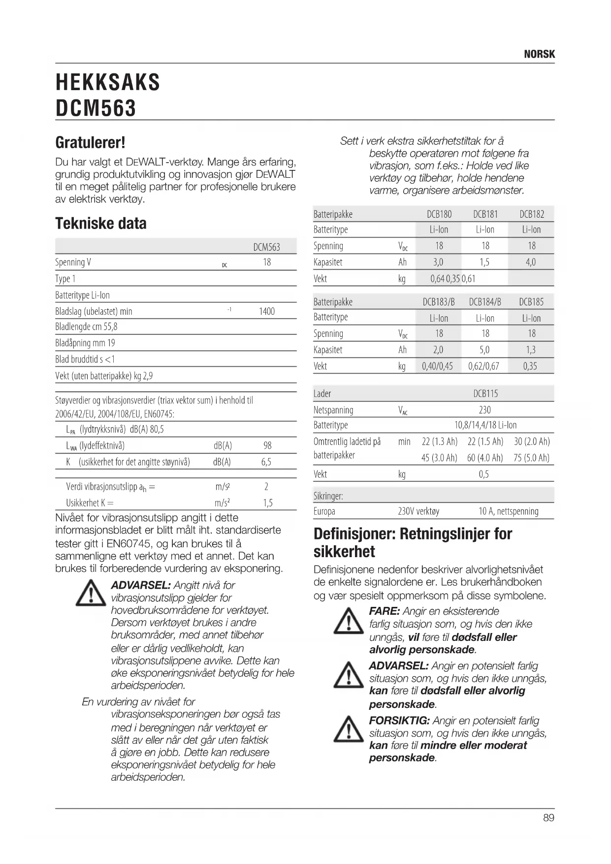 ADVARSEL: Fare for elektrisk støt. Frakople laderen fra vekselstrømkontakten før rengjøring. Smuss og fett kan fjernes fra eksteriøret av laderen ved bruk av en klut eller myk ikke-metallisk børste. Ikke bruk vann eller andre rengjøringsmidler. Tilleggsutstyr ADVARSEL: Bruk av annet tilleggsutstyr enn det som tilbys av D eWALT kan være farlig, ettersom dette ikke er testet sammen med dette verktøyet. For å redusere faren for skader, bør kun tilleggsutstyr som er anbefalt av DeWALT brukes sammen med dette produktet. Ta kontakt med din forhandler for ytterligere informasjon om egnet ekstrautstyr. Beskyttelse av miljøet Separat innsamling. Produkter og batterier merket med dette symbolet skal ikke kastes i vanlig husholdningsavfall. Produkter og batterier inneholder materialer som kan gjenvinnes eller gjenbrukes, som reduserer behovet for råmaterialer. Vennligst lever elektriske produkter og batterier til gjenbruk i henhold til lokale regler. Mer informasjon får du på www.2helpU.com.100 português Gratulerer! Du har valgt et DeWALT-verktøy. Mange års erfaring, grundig produktutvikling og innovasjon gjør DeWALT til en meget pålitelig partner for profesjonelle brukere av elektrisk verktøy. Dados técnicos DCM563 Voltagem V