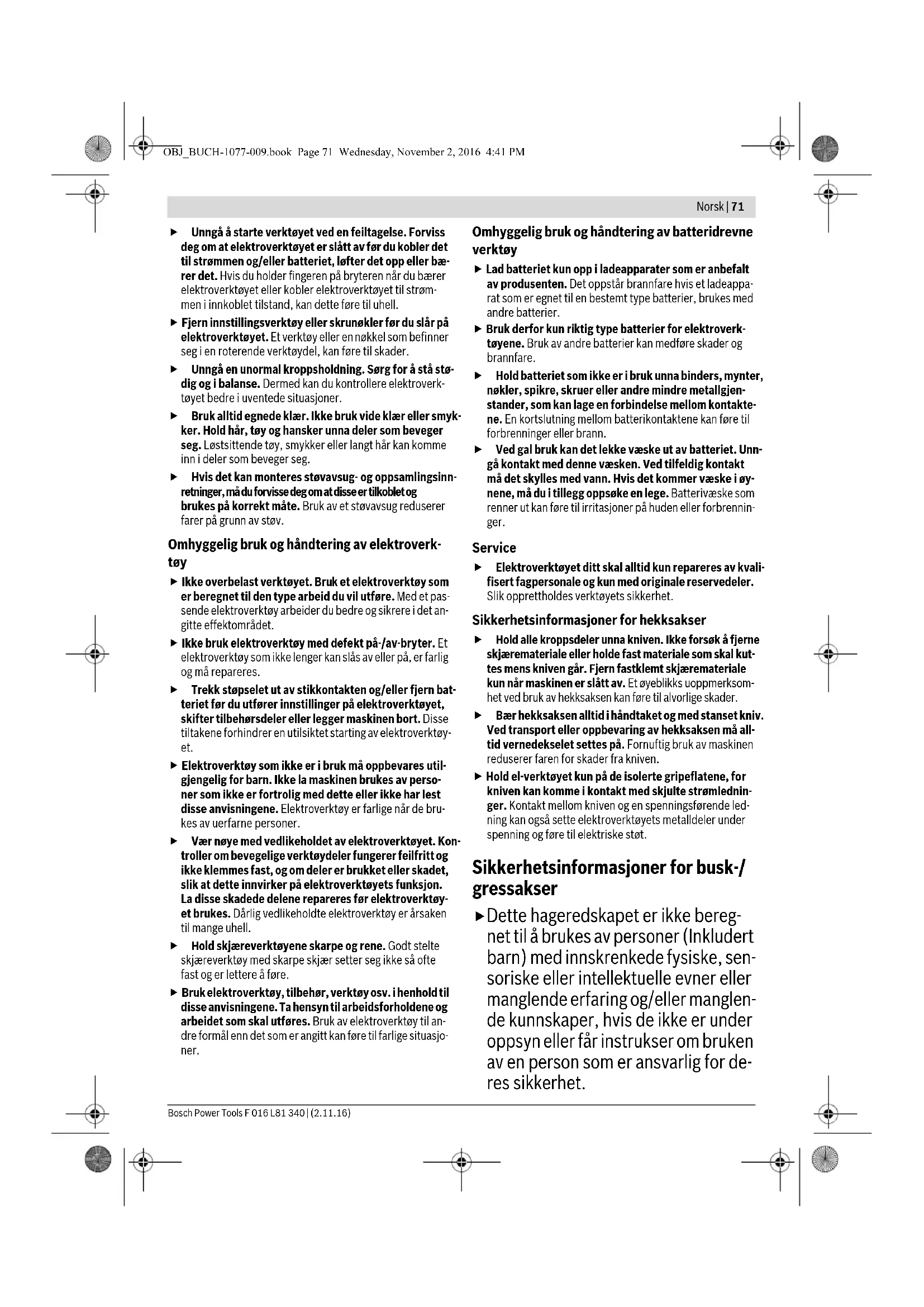 Legg merke til produktnummeret på typeskiltet til hageredskapet ditt. Handelsbetegnelsene for de enkelte hageredskapene kan variere. **gjennomsnittelig driftstid ***kun for settet «ASB 10,8 LI Set» OBJ_BUCH-1077-009.book Page 73 Wednesday, November 2, 2016 4:41 PM74 | Norsk F 016 L81 340 | (2.11.16) Bosch Power Tools Støy-/vibrasjonsinformasjon Gressaks Støyutslippsverdier målt i henhold til EN 50636-2-94. Det typiske lydtrykknivået for apparatet er mindre enn 70 dB(A). Totale svingningsverdier a