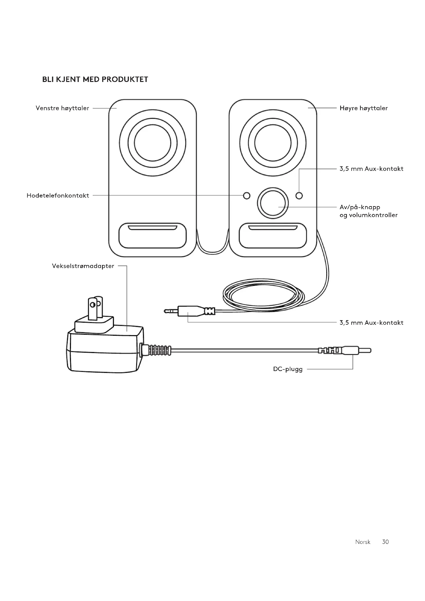 Venstre høyttaler Hodetelefonkontakt DC-plugg Høyre høyttaler Av/på-knapp ogvolumkontroller 3,5mm Aux-kontakt 3,5mm Aux-kontakt VekselstrømadapterNorsk 31