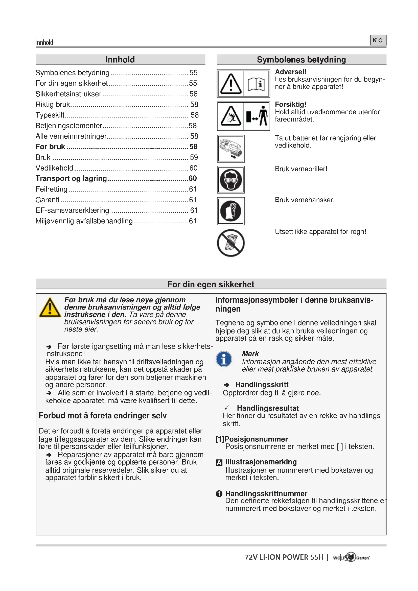 Finn enhetens veiledning gratis 72V LiIon Accu Power 55H Wolf Garten i PDF-format.