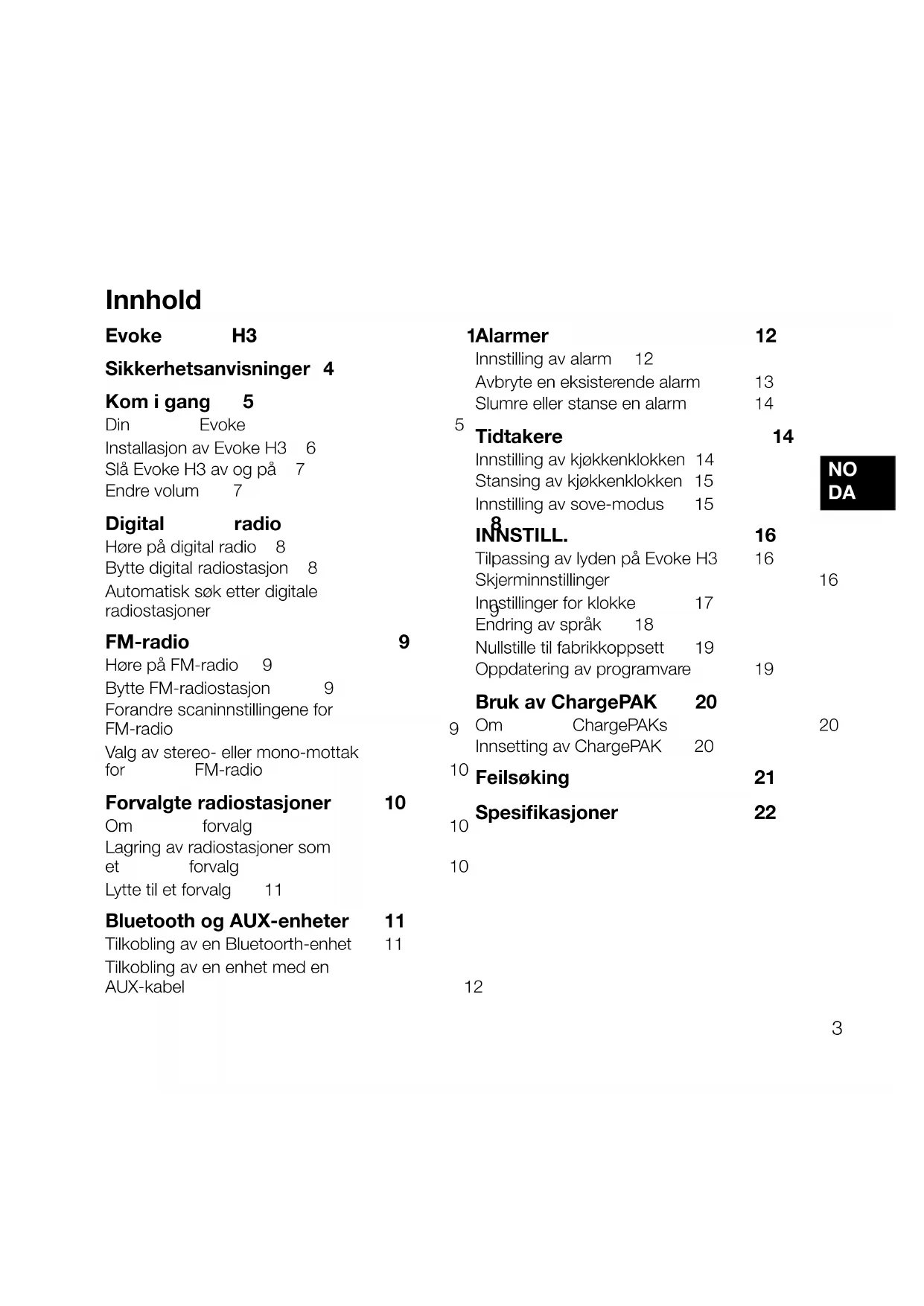 NL23 Innhold Evoke H3 1 Sikkerhetsanvisninger 4 Kom i gang 5 Din Evoke 5 Installasjon av Evoke H3 6 Slå Evoke H3 av og på 7 Endre volum 7 Digital radio 8 Høre på digital radio 8 Bytte digital radiostasjon 8 Automatisk søk etter digitale radiostasjoner 9 FM-radio 9 Høre på FM-radio 9 Bytte FM-radiostasjon 9 Forandre scaninnstillingene for FM-radio 9 Valg av stereo- eller mono-mottak for FM-radio 10 Forvalgte radiostasjoner 10 Om forvalg 10 Lagring av radiostasjoner som et forvalg 10 Lytte til et forvalg 11 Bluetooth og AUX-enheter 11 Tilkobling av en Bluetoorth-enhet 11 Tilkobling av en enhet med en AUX-kabel 12 Alarmer 12 Innstilling av alarm 12 Avbryte en eksisterende alarm 13 Slumre eller stanse en alarm 14 Tidtakere 14 Innstilling av kjøkkenklokken 14 Stansing av kjøkkenklokken 15 Innstilling av sove-modus 15 INNSTILL. 16 Tilpassing av lyden på Evoke H3 16 Skjerminnstillinger 16 Innstillinger for klokke 17 Endring av språk 18 Nullstille til fabrikkoppsett 19 Oppdatering av programvare 19 Bruk av ChargePAK 20 Om ChargePAKs 20 Innsetting av ChargePAK 20 Feilsøking 21 Spesifikasjoner 22