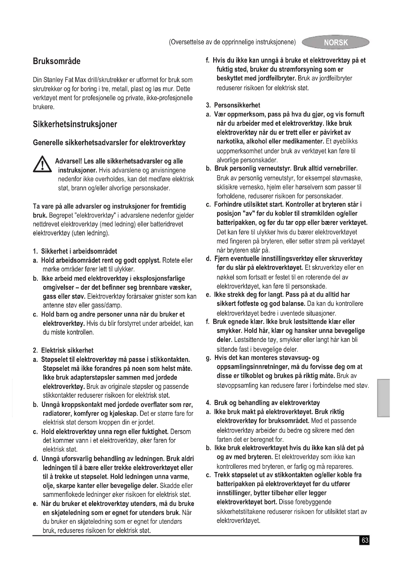 Kevin Hewitt Vice-President Global Engineering Stanley Europe, Egide Walschaertsstraat14-18, 2800 Mechelen, Belgia 27/08/201369 (Oversettelse av de opprinnelige instruksjonene) NORSK Garanti Stanley Europe er trygg på kvaliteten på sine produkter og tilbyr en enestående garanti til profesjonelle brukere av produktet. Denne garantierklæringen kommer i tillegg til og reduserer på ingen måte dine kontraktmessige rettigheter som privat ikke-profesjonell bruker. Garantien er gyldig i EU- og EFTA-medlemsstatene.