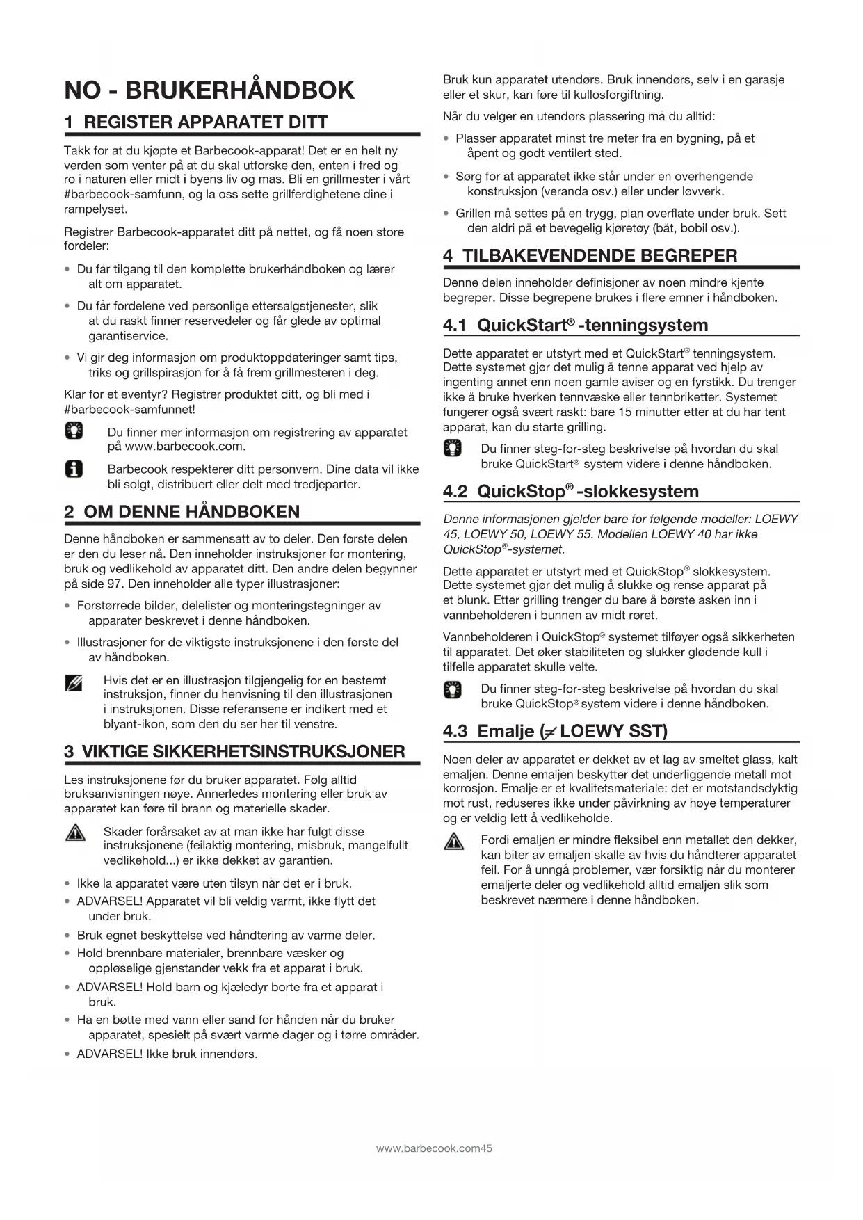 Dette apparatet er utstyrt med et QuickStart® tenningsystem. Dette systemet gjør det mulig Å tenne apparat ved hjelp av ingenting annet enn noen gamle aviser og en fyrstikk. Du trenger ikke bruke hverken tennvæske eller tennbriketter. Systemet fungerer øgså svært raskt: bare 15 minutter erter at du har tent apparat, kan du starte grilling.