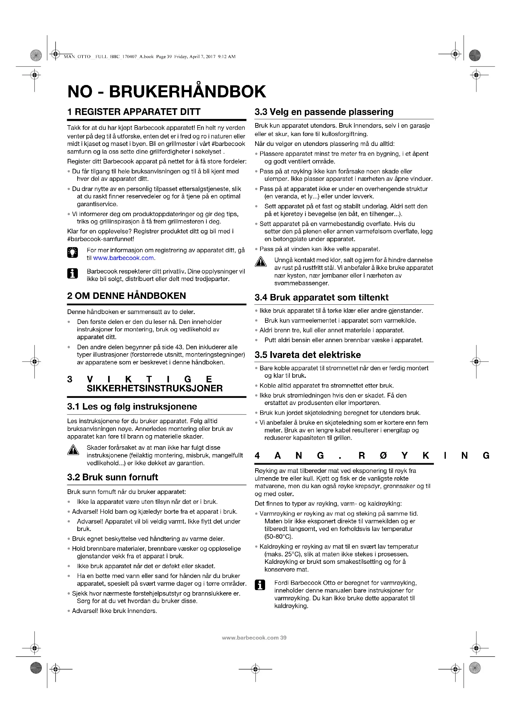Fordi Barbecook Otto er beregnet for varmrøyking, inneholder denne manualen bare instruksjoner for varmrøyking. Du kan ikke bruke dette apparatet til kaldrøyking. MAN_OTTO__FULL_BBC_170407_A.book Page 39 Friday, April 7, 2017 9:12 AM40 www.barbecook.com