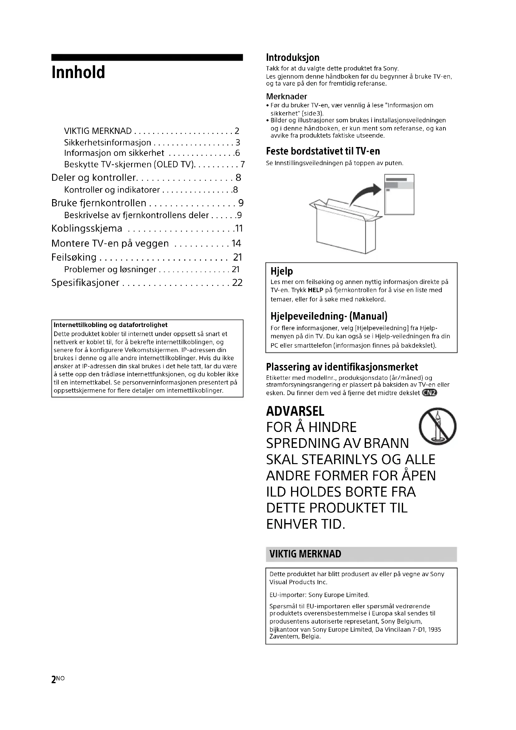 ENHVER TID. Internettilkobling og datafortrolighetDette produktet kobler til internett under oppsett så snart et nettverk er koblet til, for å bekrefte internettilkoblingen, og senere for å konfigurere Velkomstskjermen. IP-adressen din brukes i denne og alle andre internettilkoblinger. Hvis du ikke ønsker at IP-adressen din skal brukes i det hele tatt, lar du være å sette opp den trådløse internettfunksjonen, og du kobler ikke til en internettkabel. Se personverninformasjonen presentert på oppsettskjermene for flere detaljer om internettilkoblinger. Hjelp Les mer om feilsøking og annen nyttig informasjon direkte på TV-en. Trykk HELP på fjernkontrollen for å vise en liste med temaer, eller for å søke med nøkkelord. Hjelpeveiledning- (Manual) For flere informasjoner, velg [Hjelpeveiledning] fra Hjelp-menyen på din TV. Du kan også se i Hjelp-veiledningen fra din PC eller smarttelefon (informasjon finnes på bakdekslet). VIKTIG MERKNAD Dette produktet har blitt produsert av eller på vegne av Sony Visual Products Inc.EU-importør: Sony Europe Limited.Spørsmål til EU-importøren eller spørsmål vedrørende oduktets overensbestemmelse i Europa skal sendes til produsentens autoriserte represetant, Sony Belgium, bijkantoor van Sony Europe Limited, Da Vincilaan 7-D1, 1935 Zaventem, Belgia.3