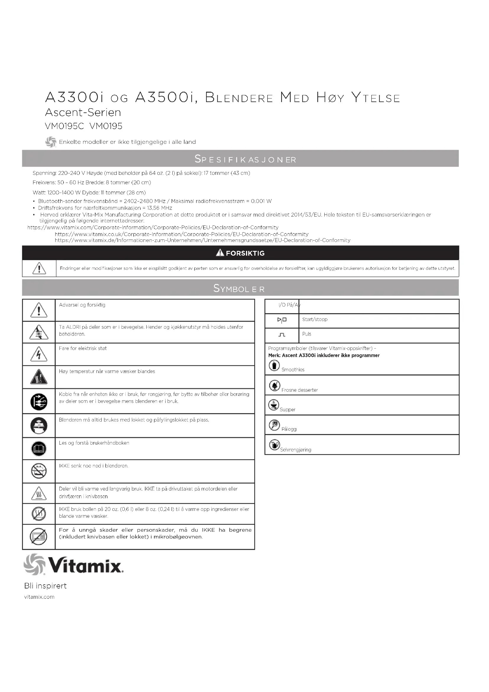 EMIRATER Vitality General Trading LLC PO Box 73265 Dubai De Forenede Arabiske Emirater Tlf.: +971 (0) 561089662 www.vitality.ae info@vitality.ae 4Homes FZCO PO Box 61379, Dubai UAE. Tlf.: +971 4 3807611 Fax: +971 4 387612 4homes@4homes.ae www.tavolashop.com AUSTRALIEN OG NEW ZEALAND Vitamix ANZ Pty Limited 167 King St Newcastle NSW2300 Australien Tlf.: 1-800-766437 (AUS) Tlf.: 050-853-0697 (NZ) www.vitamix.com.au www.vitamix.co.nzA3300i og A3500i, Blendere med Høy ytelse Ascent-Serien Bli inspirertvitamix.com VM0185 Symbol e r Sp e S i f i k aS j o n er Spenning: 220–240 V Høyde (med beholder på 64 oz. (2 l) på sokkel): 17 tommer (43 cm) Frekvens: 50 – 60 Hz Bredde: 8 tommer (20 cm)Watt: 1200–1400 W Dybde: 11 tommer (28 cm)I/O På/Av Start/stopp Puls Programsymboler (tilsvarer Vitamix-oppskrifter) – Merk: Ascent A3300i inkluderer ikke programmer Smoothies Frosne desserter Supper PåleggSelvrengjøring VM0195C VM0195 Enkelte modeller er ikke tilgjengelige i alle land• Bluetooth-sender frekvensbånd = 2402–2480 MHz / Maksimal radiofrekvensstrøm = 0,001 W• Driftsfrekvens for nærfeltkommunikasjon = 13,56 MHz