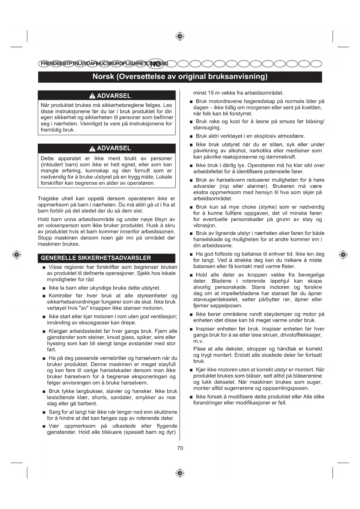 FR EN DE ES IT PT NL SV DA FI HU CS RU RO PL SL HR ET LT LV SK BG ADVARSEL Når produktet brukes må sikkerhetsreglene følges. Les disse instruksjonene før du tar i bruk produktet for din HJHQVLNNHUKHWRJVLNNHUKHWHQWLOSHUVRQHUVRPEH¿QQHU seg i nærheten. Vennligst ta vare på instruksjonene for fremtidig bruk. ADVARSEL Dette apparatet er ikke ment brukt av personer (inkludert barn) som ikke er helt egnet, eller som kan mangle erfaring, kunnskap og den fornuft som er nødvendig for å bruke utstyret på en trygg måte. Lokale forskrifter kan begrense en alder av operatøren. Tragiske uhell kan oppstå dersom operatøren ikke er oppmerksom på barn i nærheten. Du må aldri gå ut i fra at barn forblir på det stedet der du så dem sist. Hold barn unna arbeidsområde og under nøye tilsyn av en voksenperson som ikke bruker produktet. Husk å skru av produktet hvis et barn kommer innenfor arbeidssonen. Stopp maskinen dersom noen går inn på området der maskinen brukes. GENERELLE SIKKERHETSADVARSLER Ŷ Visse regioner har forskrifter som begrenser bruken av produktet til definerte operasjoner. Sjekk hos lokale myndigheter for råd Ŷ Ikke la barn eller ukyndige bruke dette utstyret. Ŷ Kontroller før hver bruk at alle styreenheter og sikkerhetsanordninger fungerer som de skal. Ikke bruk vertøyet hvis "av" knappen ikke stanser motoren. Ŷ Ikke start eller kjør motoren i rom uten god ventilasjon; innånding av eksosgasser kan drepe. Ŷ Klargjør arbeidsstedet før hver gangs bruk. Fjern alle gjenstander som steiner, knust glass, spiker, wire eller hyssing som kan bli slengt lange avstander med stor fart. Ŷ Ha på deg passende vernebriller og hørselvern når du bruker produktet. Denne maskinen er meget støyfull og kan føre til varige hørselskader dersom man ikke bruker hørselvern for å begrense eksponeringen og følger anvisningen om å bruke hørselvern. Ŷ Bruk tykke langbukser, støvler og hansker. Ikke bruk løstsittende klær, shorts, sandaler, smykker av noe slag eller gå barbent. Ŷ Sørg for at langt hår ikke når lenger ned enn skuldrene for å hindre at det kan fanges opp av roterende deler. Ŷ Vær oppmerksom på utkastede eller flygende gjenstander. Hold alle tilskuere (spesielt barn og dyr) minst 15 m vekke fra arbeidsområdet. Ŷ Bruk motordrevene hageredskap på normale tider på dagen – ikke tidlig om morgenen eller sent på kvelden, når folk kan bli forstyrret. Ŷ Bruk rake og kost for å løsne på smuss før blåsing/ støvsuging. Ŷ Bruk aldri verktøyet i en eksplosiv atmosfære. Ŷ Ikke bruk utstyret når du er sliten, syk eller under påvirkning av alkohol, narkotika eller medisiner som kan påvirke reaksjonsevne og dømmekraft. Ŷ Ikke bruk i dårlig lys. Operatøren må ha klar sikt over arbeidsfeltet for å identifisere potensielle farer. Ŷ Bruk av hørselsvern reduserer muligheten for å høre advarsler (rop eller alarmer). Brukeren må være ekstra oppmerksom med hensyn til hva som skjer på arbeidsområdet. Ŷ Bruk kun så mye choke (styrke) som er nødvendig for å kunne fullføre oppgaven, det vil minske faren for eventuelle personskader på grunn av støy og vibrasjon. Ŷ Bruk av lignende utstyr i nærheten øker faren for både hørselskade og muligheten for at andre kommer inn i din arbeidssone. Ŷ Ha god fotfeste og ballanse til enhver tid. Ikke len deg for langt. Ved å strekke deg kan du risikere å miste balansen eller få kontakt med varme flater. Ŷ Hold alle deler av kroppen vekke fra bevegelige deler. Bladene i roterende løpehjul kan skape alvorlig personskade. Stans motoren og forsikre deg om at impellerbladene har stanset før du åpner støvsugerdekselet, setter på/bytter rør, åpner eller fjerner søppelposen. Ŷ Ikke berør områdene rundt støydemper og motor på enheten idet disse kan bli meget varme under bruk. Ŷ Inspiser enheten før bruk. Inspiser enheten før hver gangs bruk for å se etter løse skruer, drivstofflekkasjer, m.v. Påse at alle deksler, stropper og håndtak er korrekt og trygt montert. Erstatt alle skadede deler før fortsatt bruk. Ŷ Kjør ikke motoren uten at korrekt utstyr er montert. Når produktet brukes som blåser, sett alltid på blåserørene og lukk dekselet. Når maskinen brukes som suger, monter alltid sugerrørene og oppsamlingsposen. Ŷ Ikke forsøk å modifisere dette produktet eller Alle slike forandringer eller modifikasjoner er feil.71 Norsk (Oversettelse av original bruksanvisning)