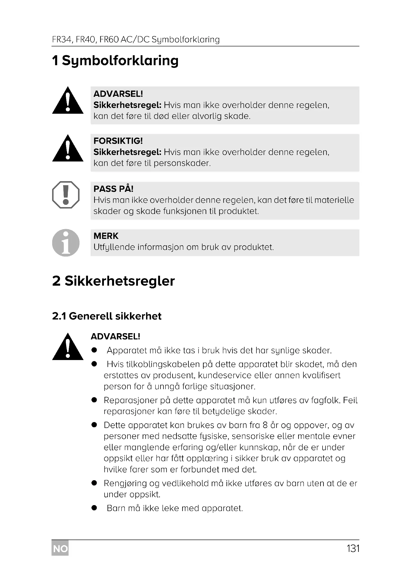 ADVARSEL! Apparatet må ikke tas i bruk hvis det har synlige skader. Hvis tilkoblingskabelen på dette apparatet blir skadet, må den erstattes av produsent, kundeservice eller annen kvalifisert person for å unngå farlige situasjoner. Reparasjoner på dette apparatet må kun utføres av fagfolk. Feil reparasjoner kan føre til betydelige skader. Dette apparatet kan brukes av barn fra 8 år og oppover, og av personer med nedsatte fysiske, sensoriske eller mentale evner eller manglende erfaring og/eller kunnskap, når de er under oppsikt eller har fått opplæring i sikker bruk av apparatet og hvilke farer som er forbundet med det. Rengjøring og vedlikehold må ikke utføres av barn uten at de er under oppsikt. Barn må ikke leke med apparatet. ADVARSEL! Sikkerhetsregel: Hvis man ikke overholder denne regelen, kan det føre til død eller alvorlig skade. FORSIKTIG! Sikkerhetsregel: Hvis man ikke overholder denne regelen, kan det føre til personskader. PASS PÅ! Hvis man ikke overholder denne regelen, kan det føre til materielle skader og skade funksjonen til produktet. MERK Utfyllende informasjon om bruk av produktet. FR34-FR40-FR60--O-16s.book Seite 131 Donnerstag, 19. Juli 2018 3:22 15NO Sikkerhetsregler FR34, FR40, FR60 AC/DC