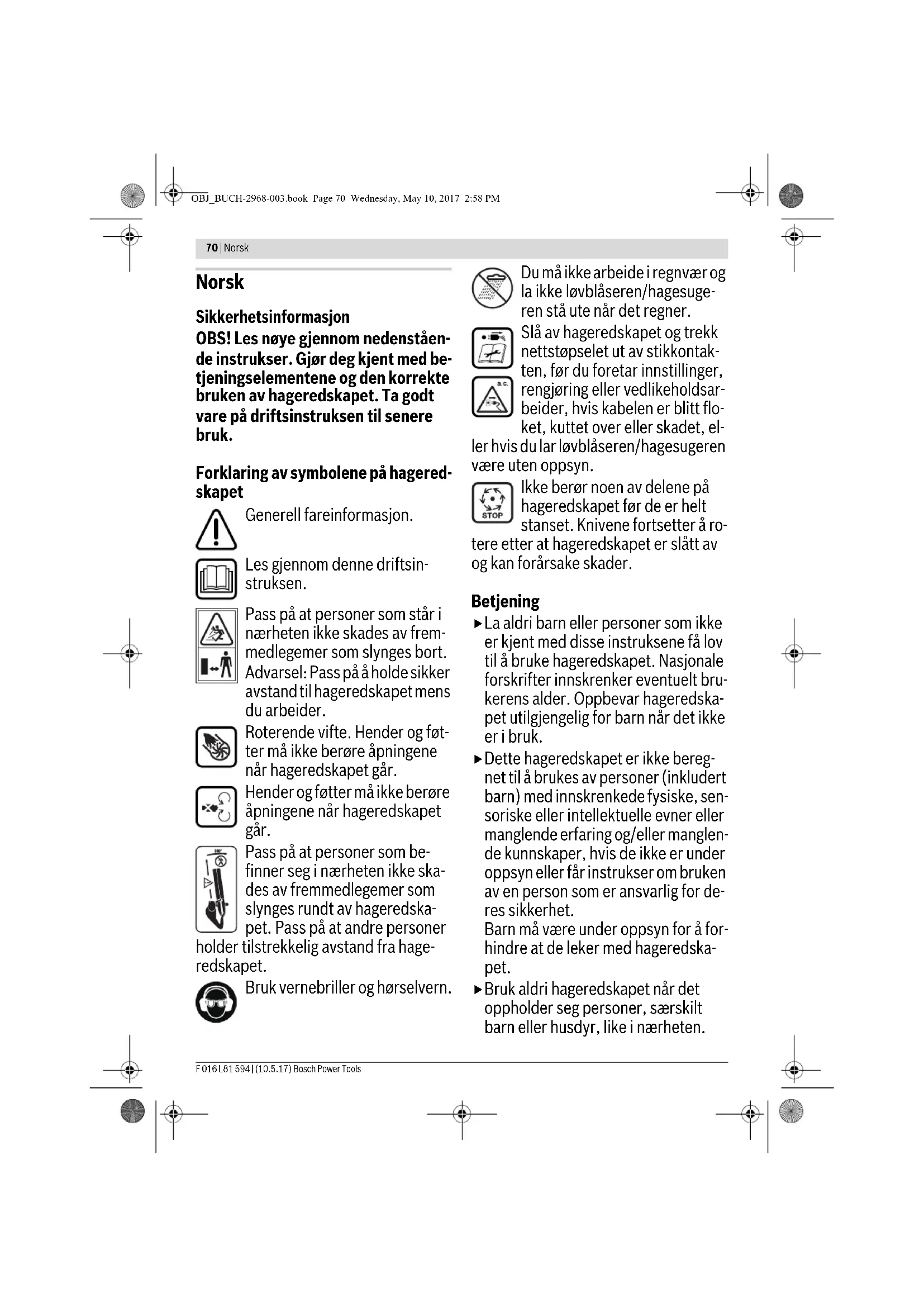FØR DU HAR TRUKKET UT STØPSE- LET. Hageredskapet er til sikkerhet dobbelt- isolert og trenger ingen jording Drifts- spenningen er 230 V AC, 50 Hz (for ikke-EU-land også 220 V eller 240 V). Bruk bare godkjente skjøtekabler. In- formasjon får du hos din autoriserte kundeservice. Bruk for å øke sikkerheten en jordfeil- bryter (RCD) med en feilstrøm på mak- simal 30 mA. Denne feilstrømbryteren bør kontrolleres før hver bruk. OBJ_BUCH-2968-003.book Page 72 Wednesday, May 10, 2017 2:58 PMNorsk | 73 Bosch Power Tools F 016 L81 594 | (10.5.17) Hold nett- og skjøtekabler borte fra be- vegelige deler og unngå enhver skade på kablene for å unngå kontakt med strømledende deler. Ledningsforbindelser (nettstøpsel og stikkontakter) bør være tørre og ikke ligge på bakken. Nett- og skjøtekabler skal regelmessig kontrolleres for tegn på skader og må bare brukes i feilfri tilstand. Når nettkabelen til redskapet er skadet, må den bare repareres av et autorisert Bosch-verksted. Bruk bare godkjente skjøtekabler. Bruk bare skjøtekabler, skjøtelednin- ger eller kabeltromler som er i samsvar med standardene EN 61242 / IEC 61242 eller IEC 60884-2-7. Hvis du vil bruke en skjøtekabel for drift av redskapet, er det nødvendig med følgende ledertverrsnitt: – Ledertversnitt 1,25 mm