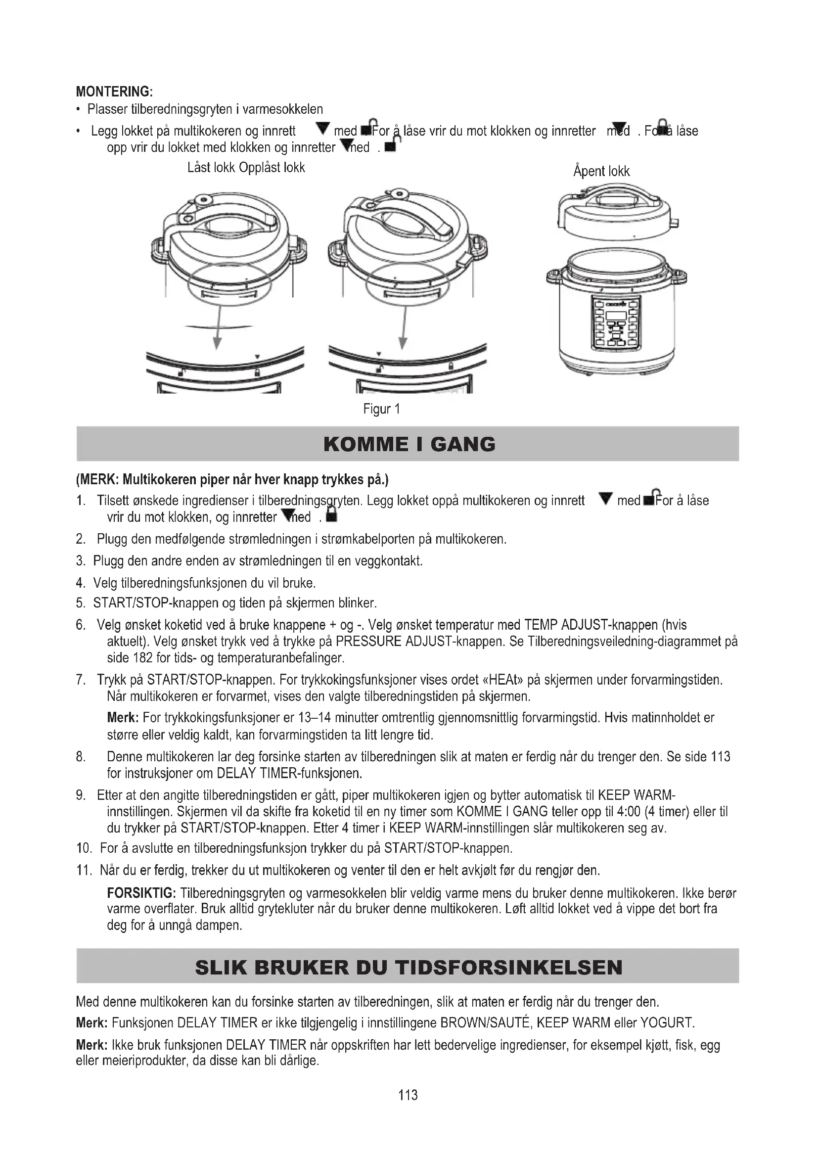 Med denne multikokeren kan du forsinke starten av tilberedningen, slik at maten er ferdig når du trenger den. Merk: Funksjonen DELAY TIMER er ikke tilgjengelig i innstillingene BROWN/SAUTÉ, KEEP WARM eller YOGURT. Merk: Ikke bruk funksjonen DELAY TIMER når oppskriften har lett bedervelige ingredienser, for eksempel kjøtt, fisk, egg eller meieriprodukter, da disse kan bli dårlige. Låst lokk Opplåst lokk Åpent lokk Figur 1114