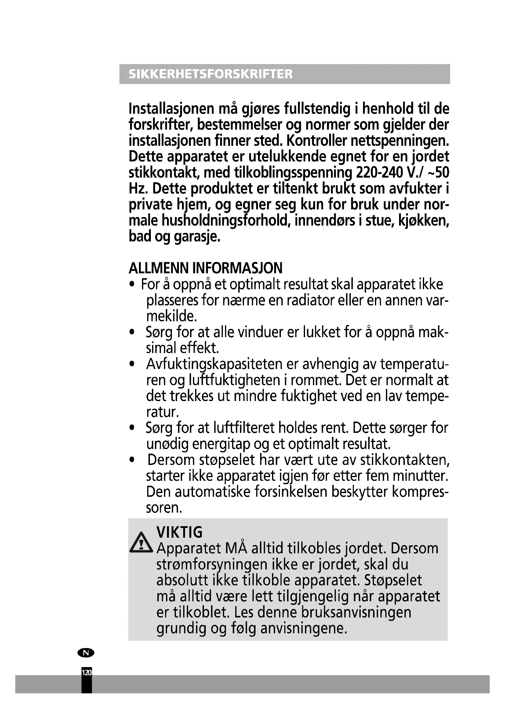 SIKKERHETSFORSKRIFTER Installasjonen må gjøres fullstendig i henhold til de forskrifter, bestemmelser og normer som gjelder der installasjonen finner sted. Kontroller nettspenningen. Dette apparatet er utelukkende egnet for en jordet stikkontakt, med tilkoblingsspenning 220-240 V./ ~50 Hz. Dette produktet er tiltenkt brukt som avfukter i private hjem, og egner seg kun for bruk under nor- male husholdningsforhold, innendørs i stue, kjøkken, bad og garasje. ALLMENN INFORMASJON