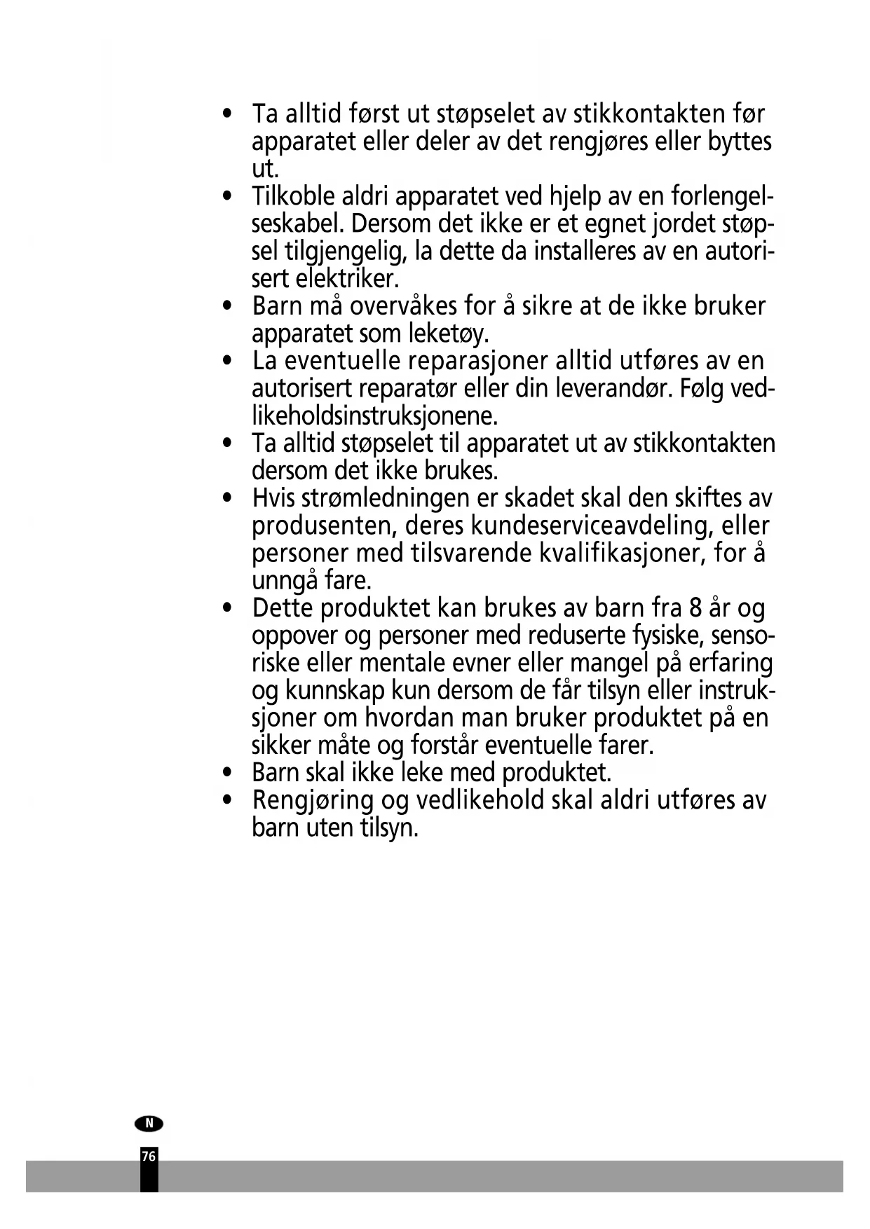 - Rengjøring og vedlikehold skal aldri utføres av barn uten tilsyn. N77 OBS!