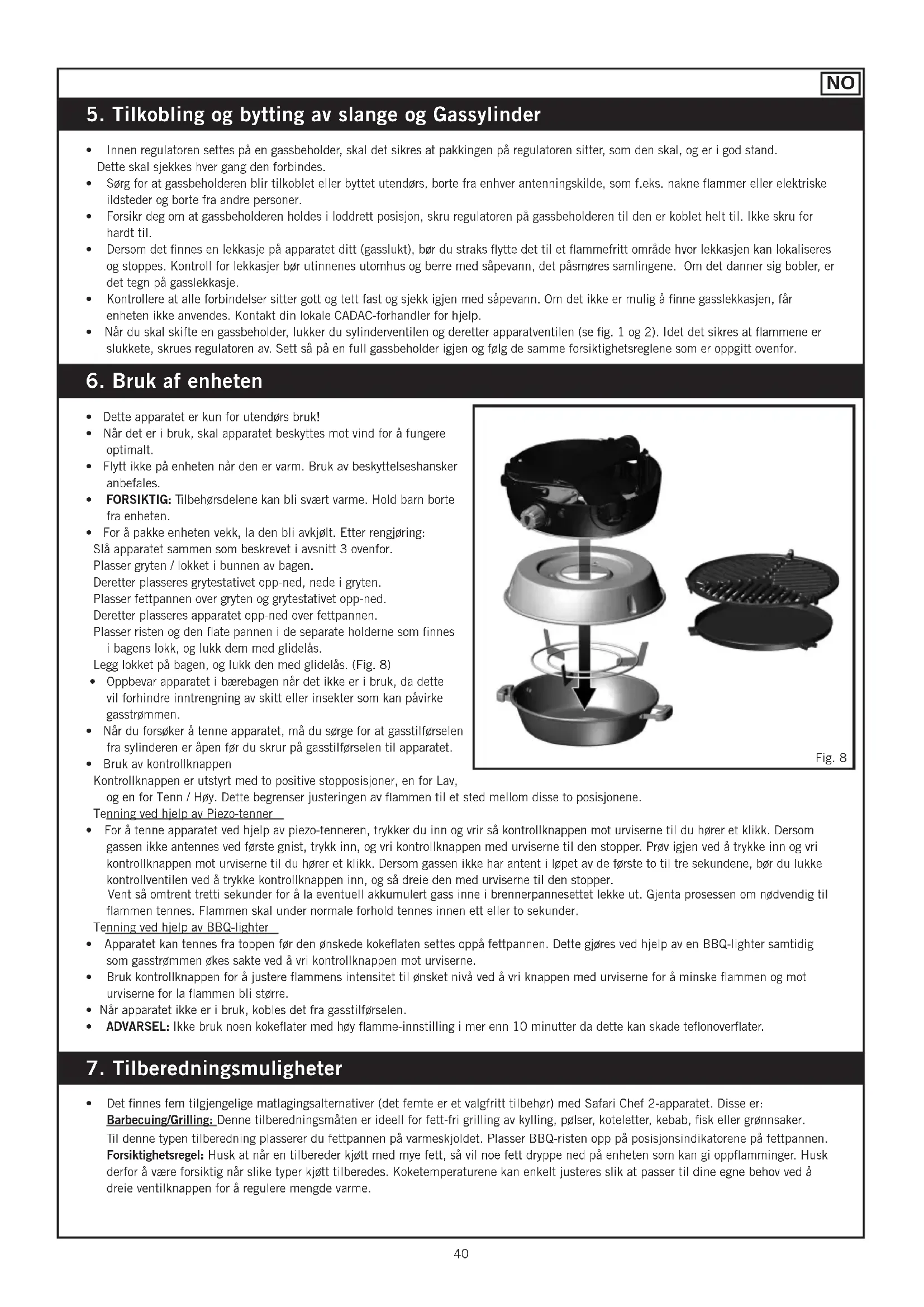 - Det nnes fem tilgjengelige matlagingsalternativer (det femte er et valgfritt tilbehør) med Safari Chef 2-apparatet. Disse er: Barbecuing/Grilling: Denne tilberedningsmåten er ideell for fett-fri grilling av kylling, pølser, koteletter, kebab, sk eller grønnsaker. Til denne typen tilberedning plasserer du fettpannen på varmeskjoldet. Plasser BBQ-risten opp på posisjonsindikatorene på fettpannen. Forsiktighetsregel: Husk at når en tilbereder kjøtt med mye fett, så vil noe fett dryppe ned på enheten som kan gi oppamminger. Husk derfor å være forsiktig når slike typer kjøtt tilberedes. Koketemperaturene kan enkelt justeres slik at passer til dine egne behov ved å dreie ventilknappen for å regulere mengde varme. Fig. 8 Vent så omtrent tretti sekunder for å la eventuell akkumulert gass inne i brennerpannesettet lekke ut. Gjenta prosessen om nødvendig til ammen tennes. Flammen skal under normale forhold tennes innen ett eller to sekunder. Tenning ved hjelp av BBQ-lighter
