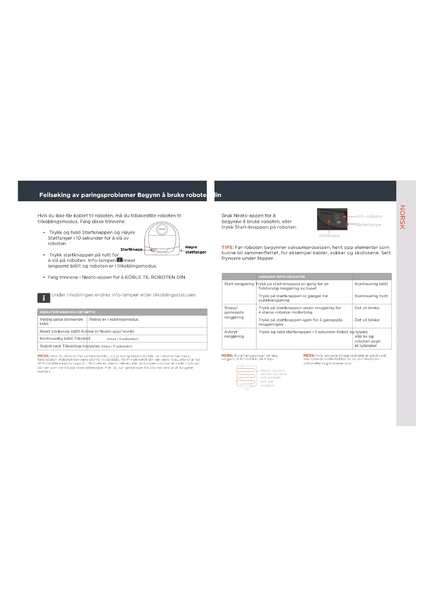 - Følg trinnene i Neato-appen for å KOBLE TIL ROBOTEN DIN. MERK: Hvis du allerede har sammenkoblet, betyr hurtig blinkende blått at roboten har mistet forbindelsen. Roboten kan være utenfor rekkevidde, Wi-Fi-nettverket ditt kan være nede, eller et annet Wi-Fi-problem kan ha oppstått. Hvis den er utenfor rekkevidde, vil roboten automatisk koble til på nytt når den kommer tilbake innen rekkevidde. Eller, du kan sjekke ruter for å kontrollere at alt fungerer normalt. Bruk Neato-appen for å begynne å bruke roboten, eller trykk Start-knappen på roboten. TIPS: Før roboten begynner vakuumprosessen, hent opp elementer som kunne bli sammenflettet, for eksempel kabler, sokker og skolissene. Sett frynsere under tepper. Feilsøking av paringsproblemer Begynn å bruke roboten din NORSK Under tilkoblingen endres Info-lampen etter tilkoblingsstatusen: