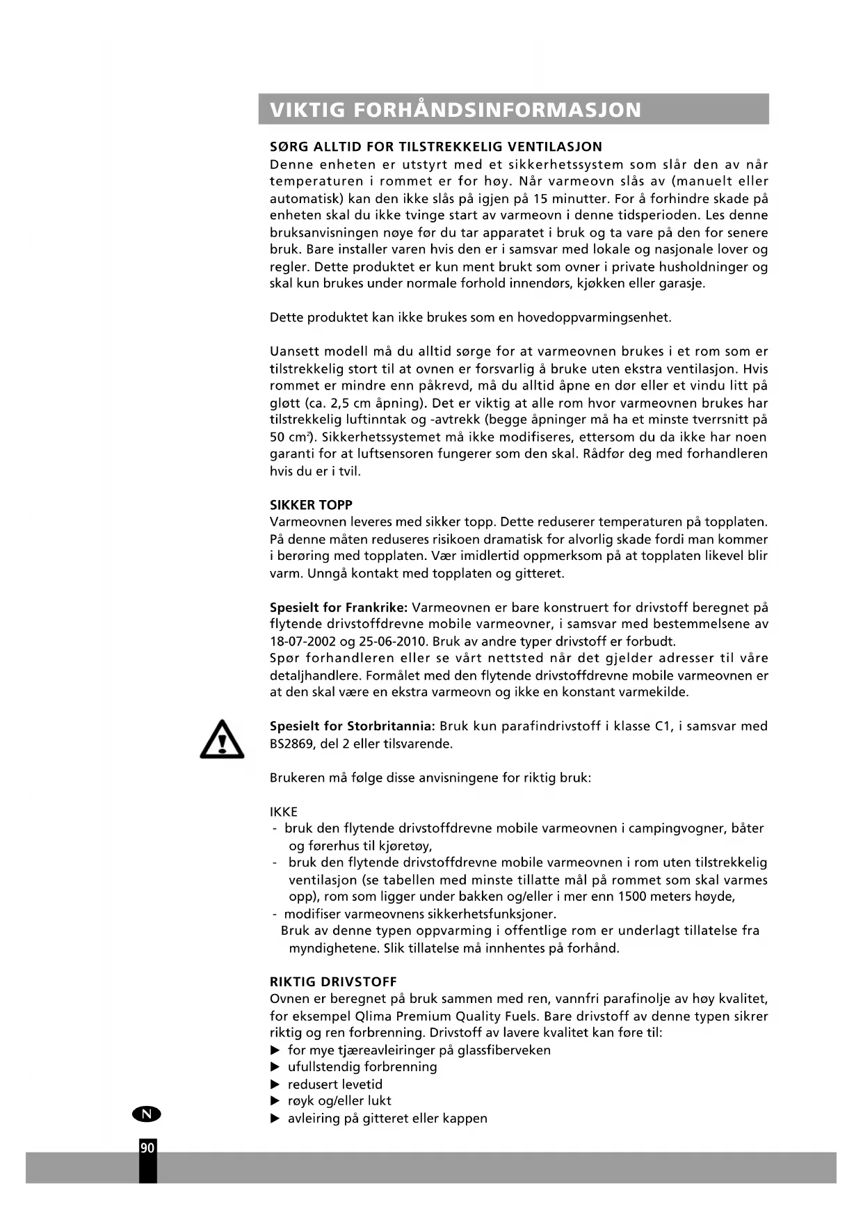 90Det er derfor viktig å bruke riktig drivstoff, slik at du kan bruke ovnen på en trygg, effektiv og behagelig måte.Skade og/eller funksjonsfeil på varmeovnen som skyldes bruk av annet drivstoff enn ren parafinolje av høy kvalitet og uten innhold av vann, dekkes ikke av garantien.Hør alltid med den lokale forhandleren for å få vite hva som er riktig drivstoff til ovnen. HÅNDBOK