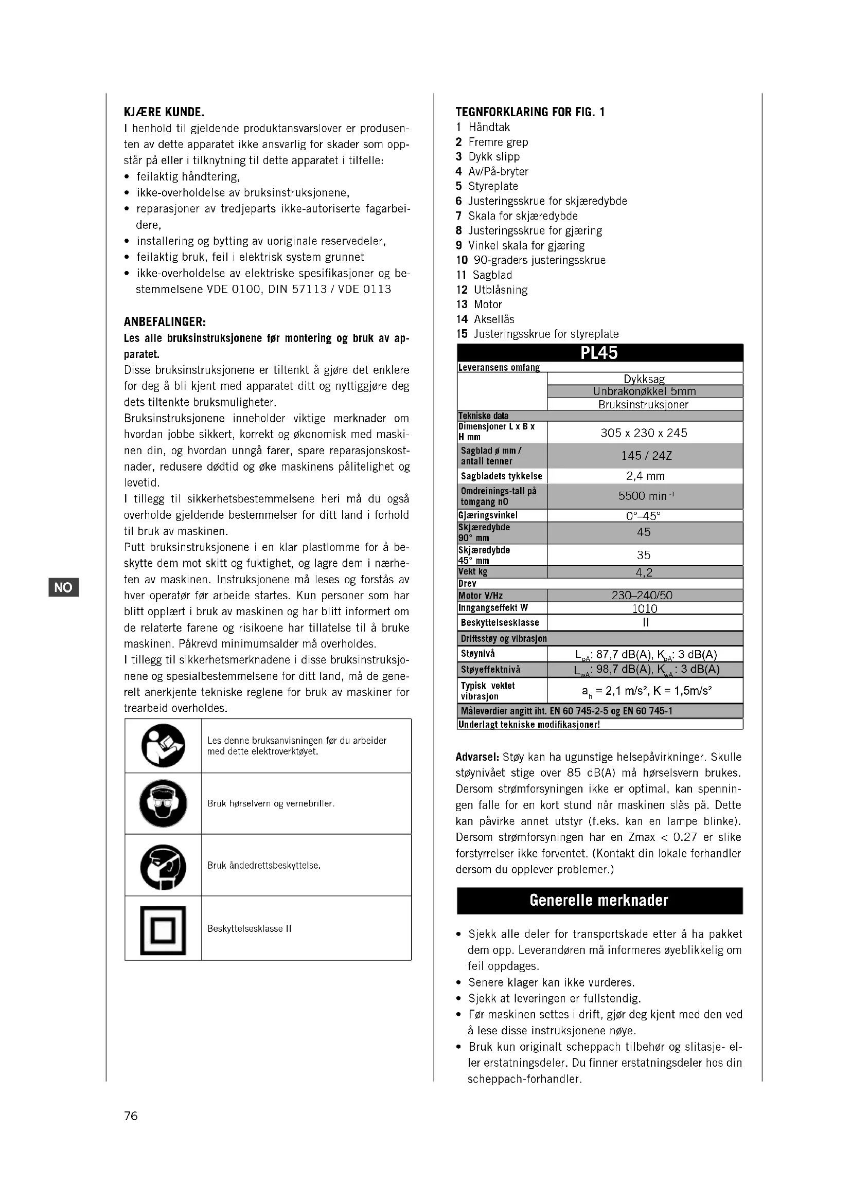 KJÆRE KUNDE. I henhold til gjeldende produktansvarslover er produsen-ten av dette apparatet ikke ansvarlig for skader som opp-står på eller i tilknytning til dette apparatet i tilfelle:• feilaktig håndtering,• ikke-overholdelse av bruksinstruksjonene,• reparasjoner av tredjeparts ikke-autoriserte fagarbei-dere,• installering og bytting av uoriginale reservedeler,• feilaktig bruk, feil i elektrisk system grunnet• ikke-overholdelse av elektriske spesifikasjoner og be-stemmelsene VDE 0100, DIN 57113 / VDE 0113 ANBEFALINGER: Les alle bruksinstruksjonene før montering og bruk av ap-paratet.Disse bruksinstruksjonene er tiltenkt å gjøre det enklere for deg å bli kjent med apparatet ditt og nyttiggjøre deg dets tiltenkte bruksmuligheter.Bruksinstruksjonene inneholder viktige merknader om hvordan jobbe sikkert, korrekt og økonomisk med maski-nen din, og hvordan unngå farer, spare reparasjonskost-nader, redusere dødtid og øke maskinens pålitelighet og levetid.I tillegg til sikkerhetsbestemmelsene heri må du også overholde gjeldende bestemmelser for ditt land i forhold til bruk av maskinen.Putt bruksinstruksjonene i en klar plastlomme for å be-skytte dem mot skitt og fuktighet, og lagre dem i nærhe-ten av maskinen. Instruksjonene må leses og forstås av hver operatør før arbeide startes. Kun personer som har blitt opplært i bruk av maskinen og har blitt informert om de relaterte farene og risikoene har tillatelse til å bruke maskinen. Påkrevd minimumsalder må overholdes.I tillegg til sikkerhetsmerknadene i disse bruksinstruksjo-nene og spesialbestemmelsene for ditt land, må de gene-relt anerkjente tekniske reglene for bruk av maskiner for trearbeid overholdes.Les denne bruksanvisningen før du arbeider med dette elektroverktøyet.Bruk hørselvern og vernebriller.Bruk åndedrettsbeskyttelse.Beskyttelsesklasse II